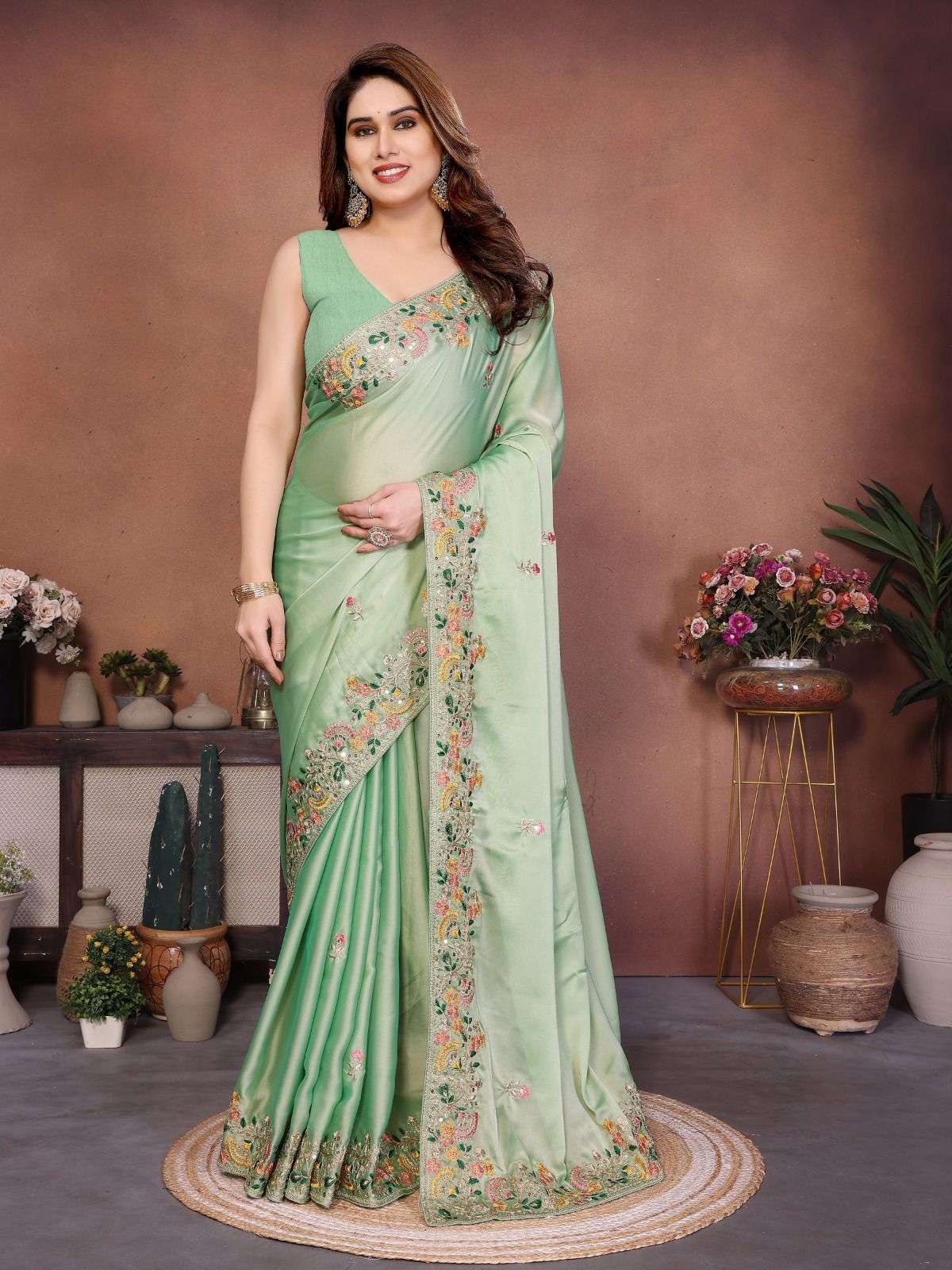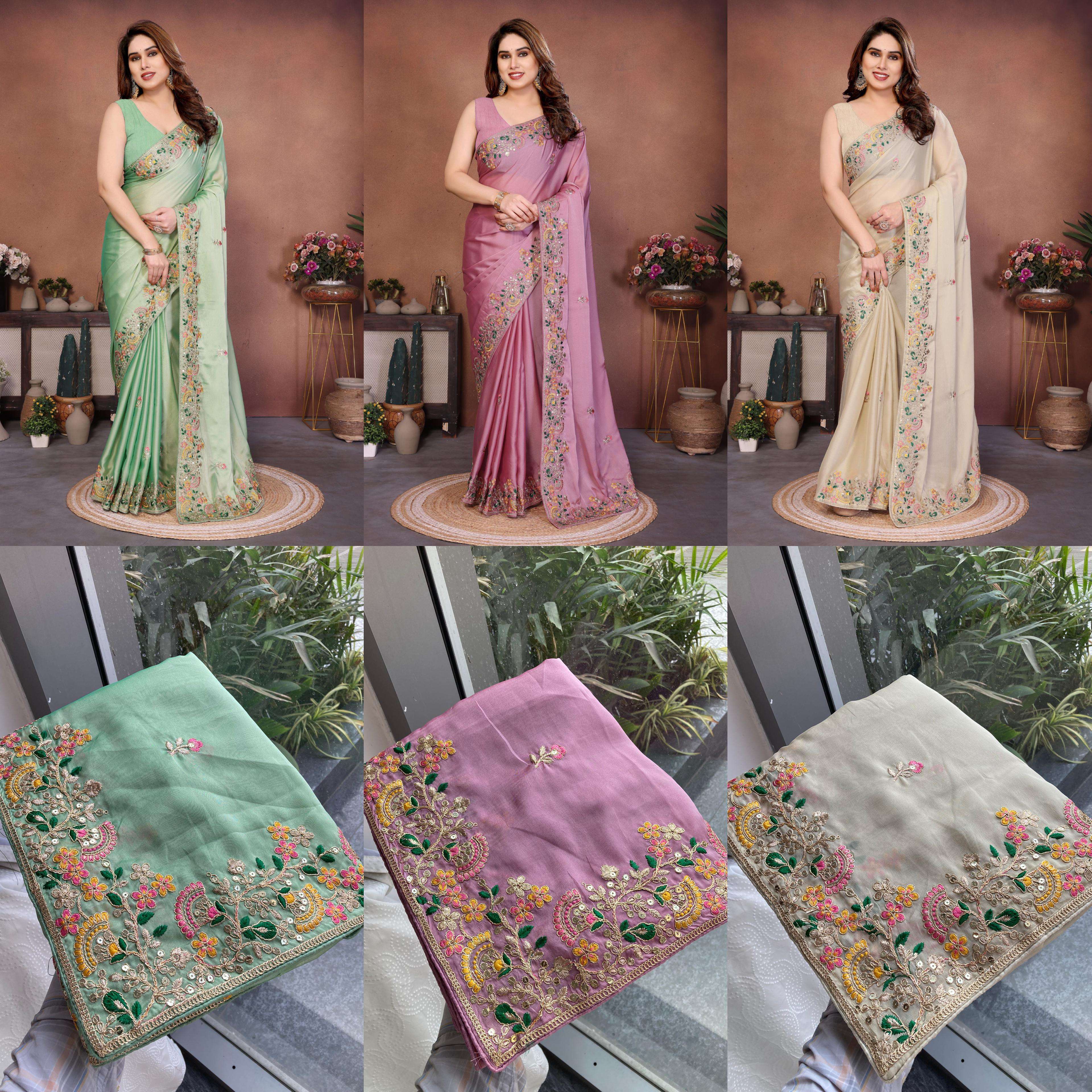 Looking some one for this same padding colour beautiful Saree for wedding on premium Soft Star Georgette fabric with Embroidery cut Work aarco Border With mono banglory silk Work blouse Peice.