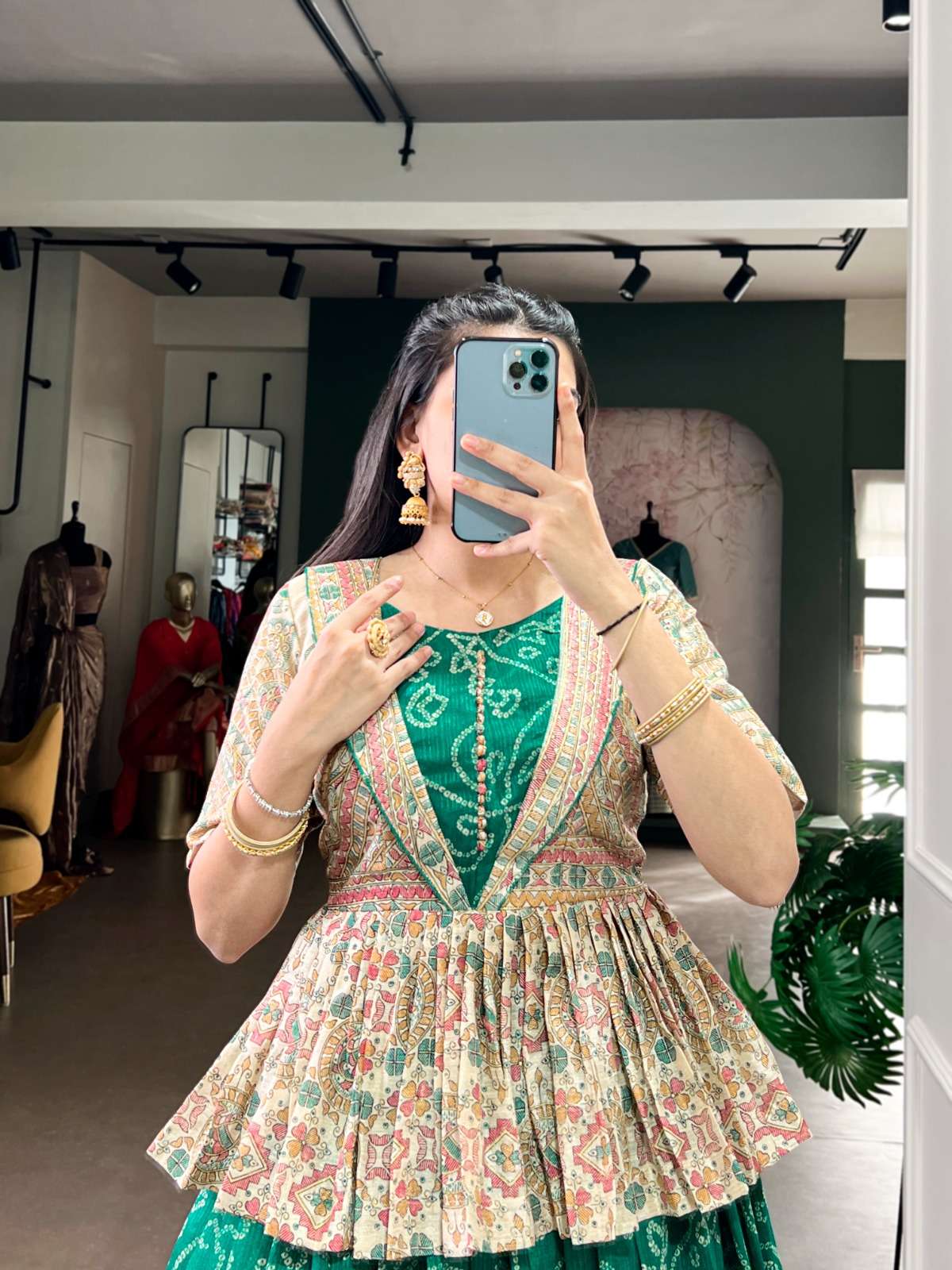 A beautiful fusion of tradition Madhubani art meets Bandhej charm on rich green silk for a timeless festive look