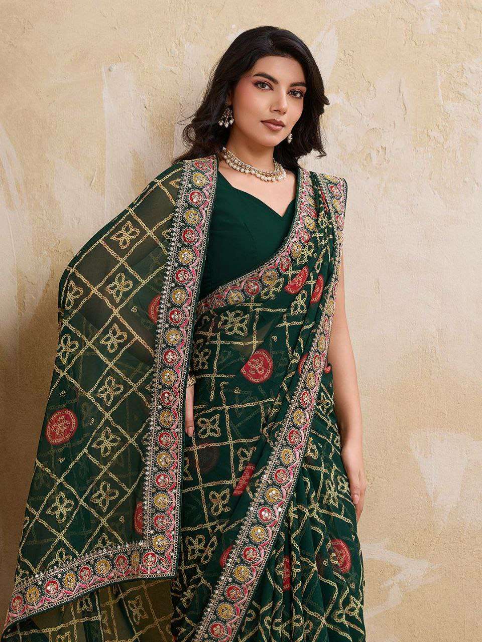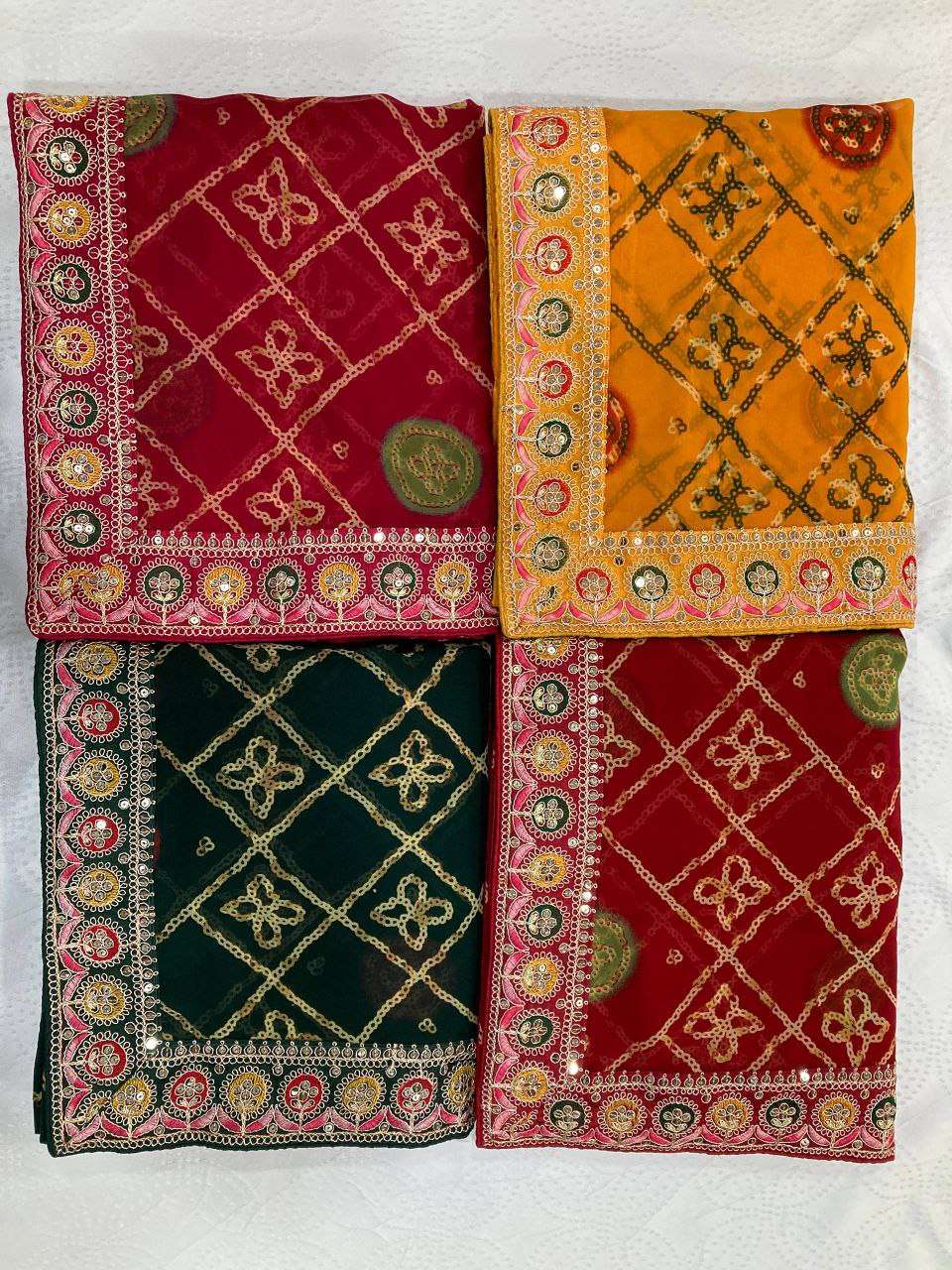 | Catalogue: | Shri Balaji Emporium 20330 premium Soft Georgette fabric with Bandhej Print With cutwork Lace Border |