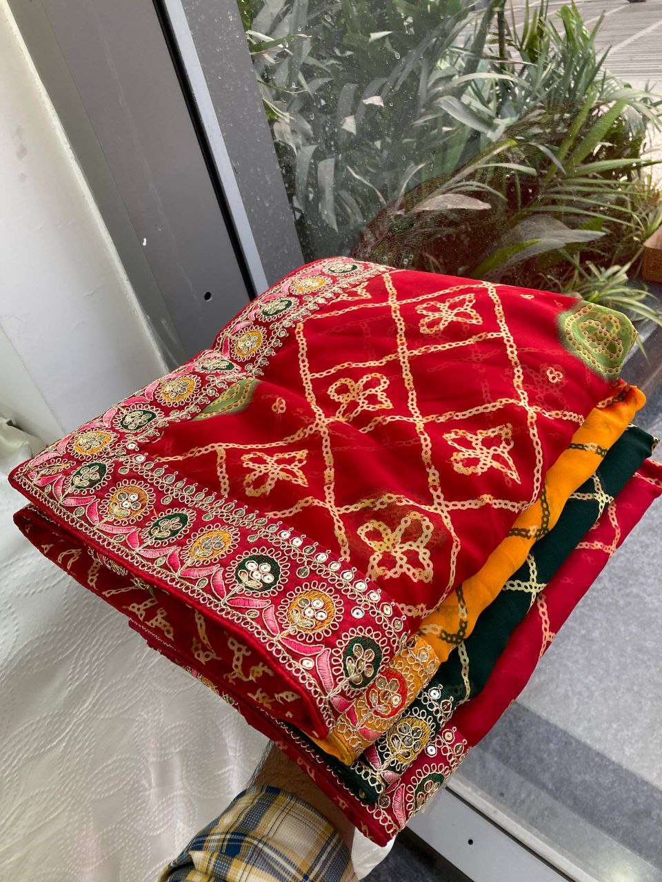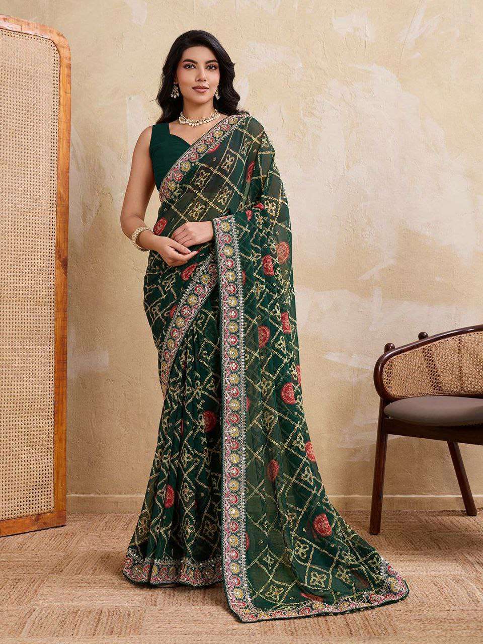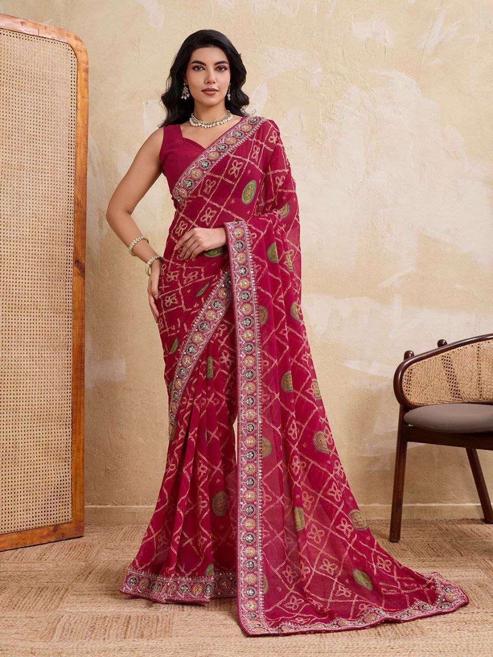 Looking some one for this same colour beautiful Saree for wedding on premium Soft Georgette fabric with Bandhej Print With cutwork Lace Border with Heavy embroidery Work blouse Peice .