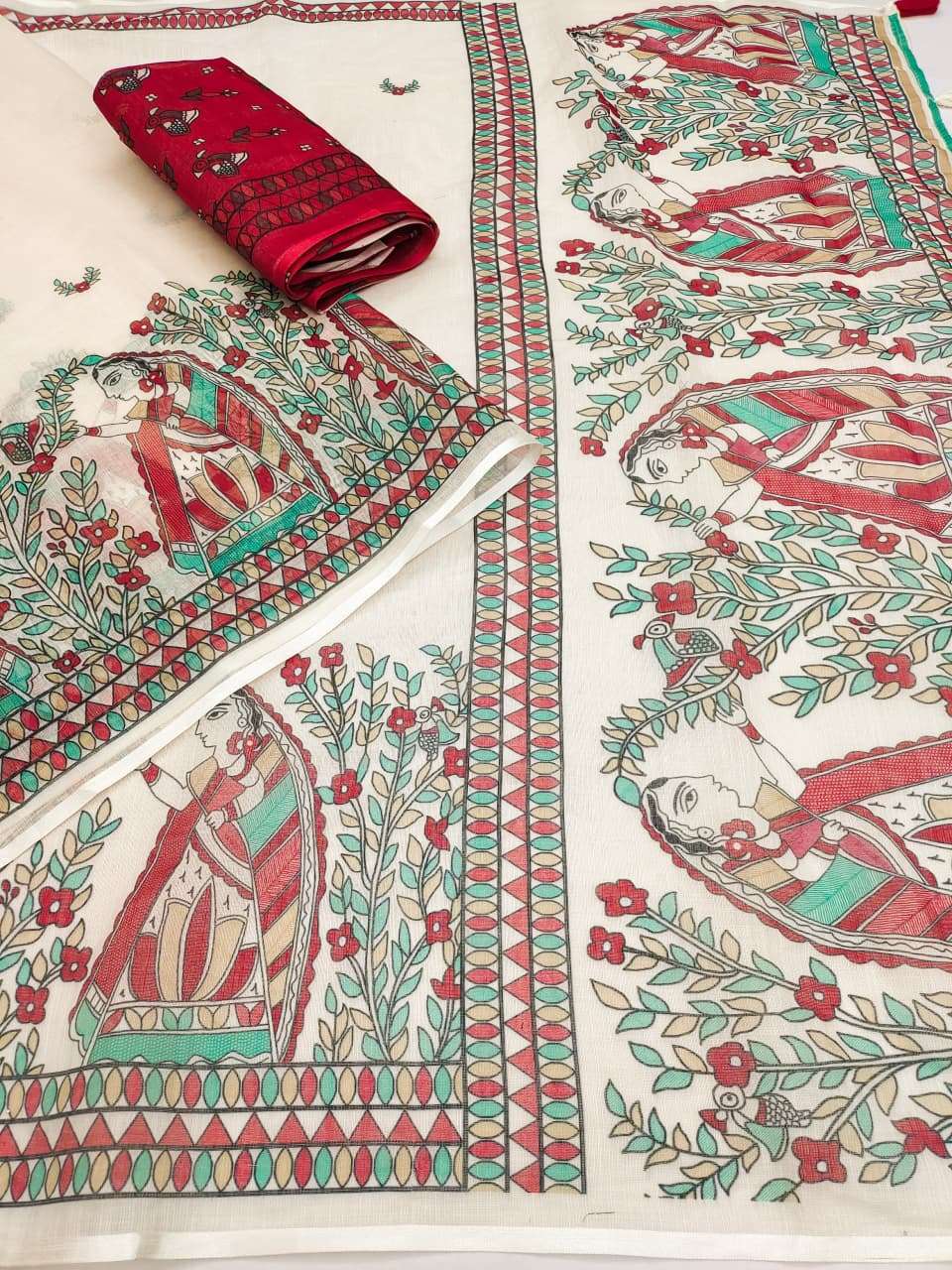This cotton saree features a printed saree design with a digital print finish, plus a matching unstitched blouse for a complete traditional look.