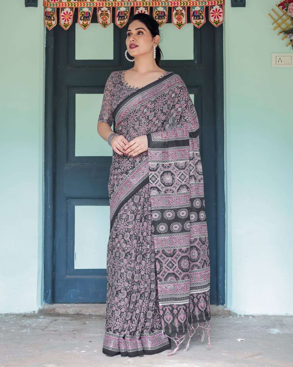 Black Mauve Traditional Ajrakh Printed Elegant Linen Cotton Saree