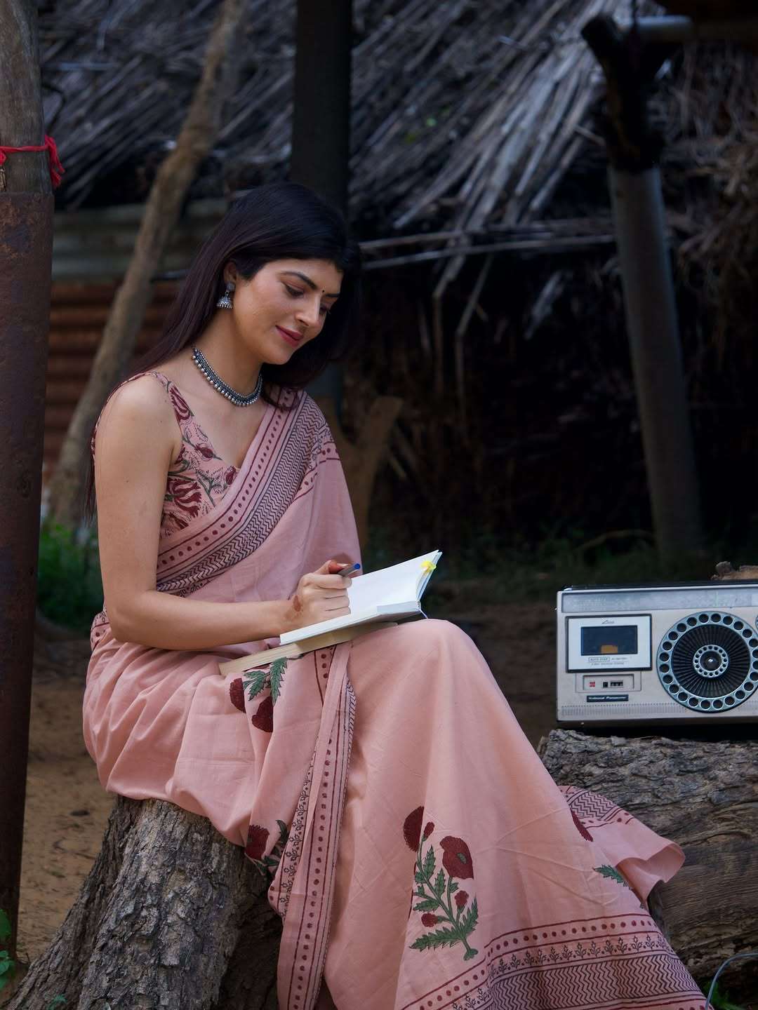 Color: The saree has a base color described as dusty rose pink.