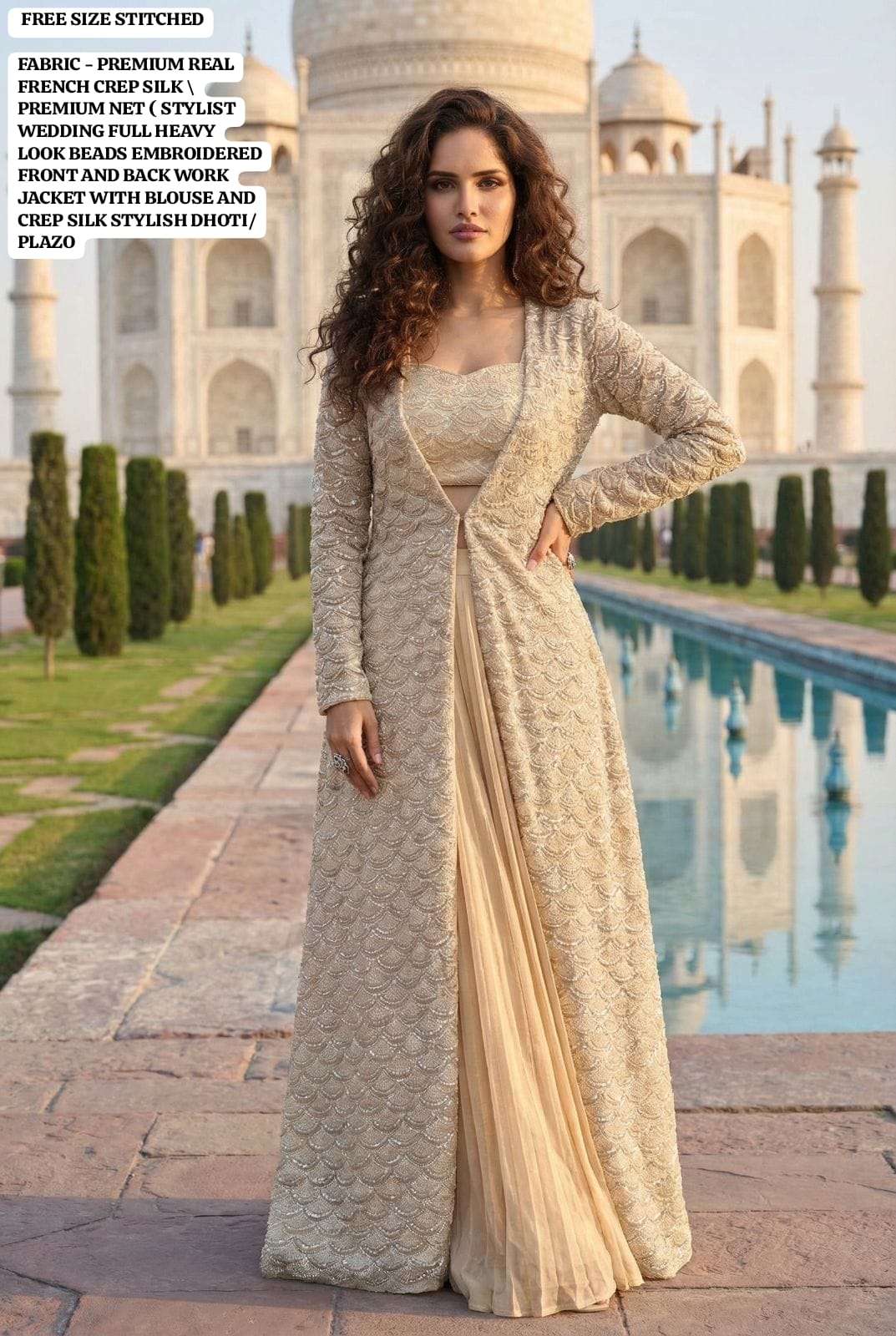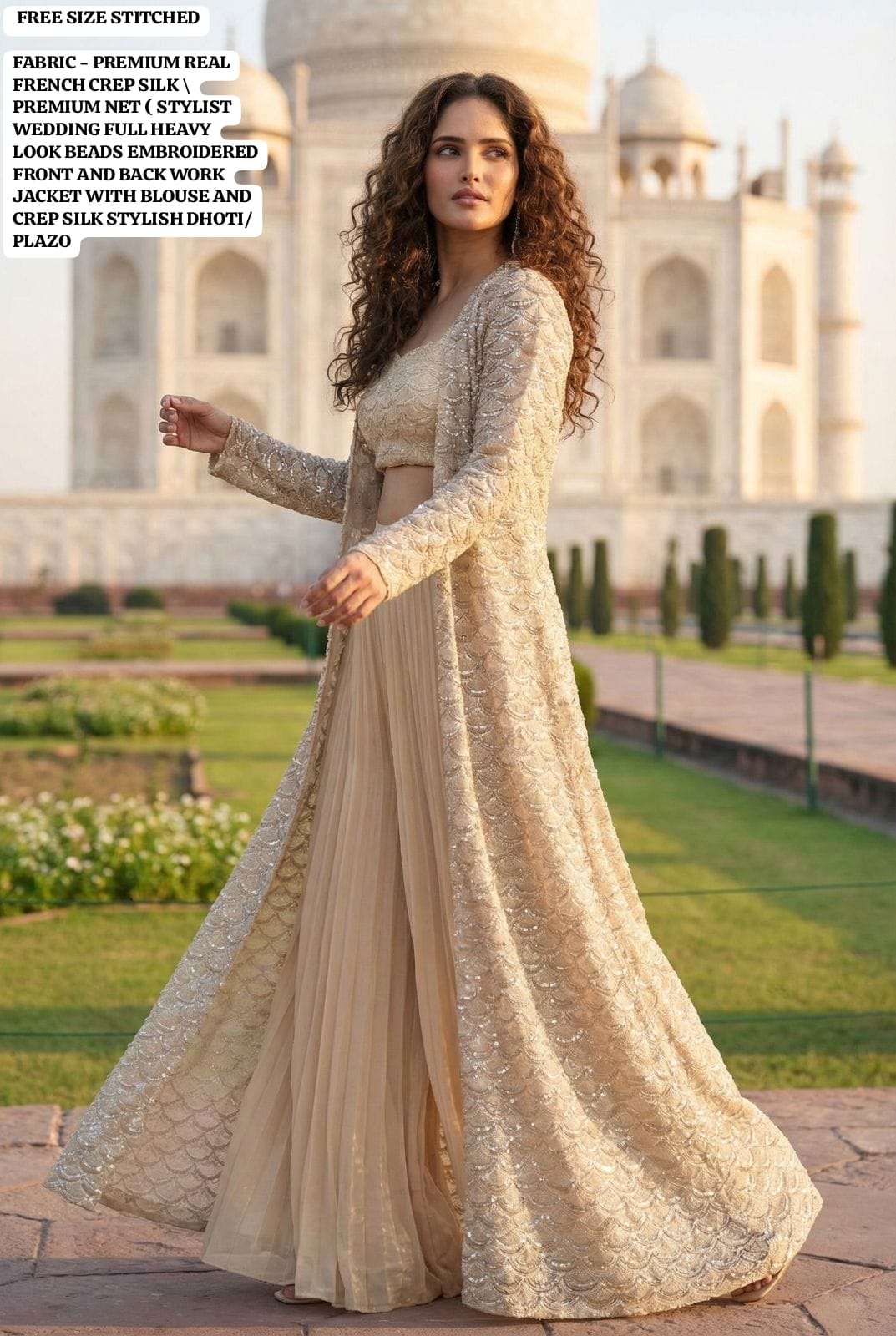 FABRIC - PREMIUM REAL FRENCH CREP SILK PREMIUM NET ( STYLIST WEDDING FULL HEAVY LOOK BEADS EMBROIDERED FRONT AND BACK WORK JACKET WITH BLOUSE AND CREP SILK STYLISH PLAZZO/DHOTI )