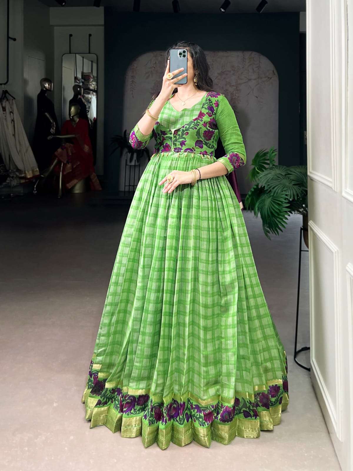 Wearing this beautiful printed koti over a flared Chanderi-style gown feels like tradition wrapped in elegance