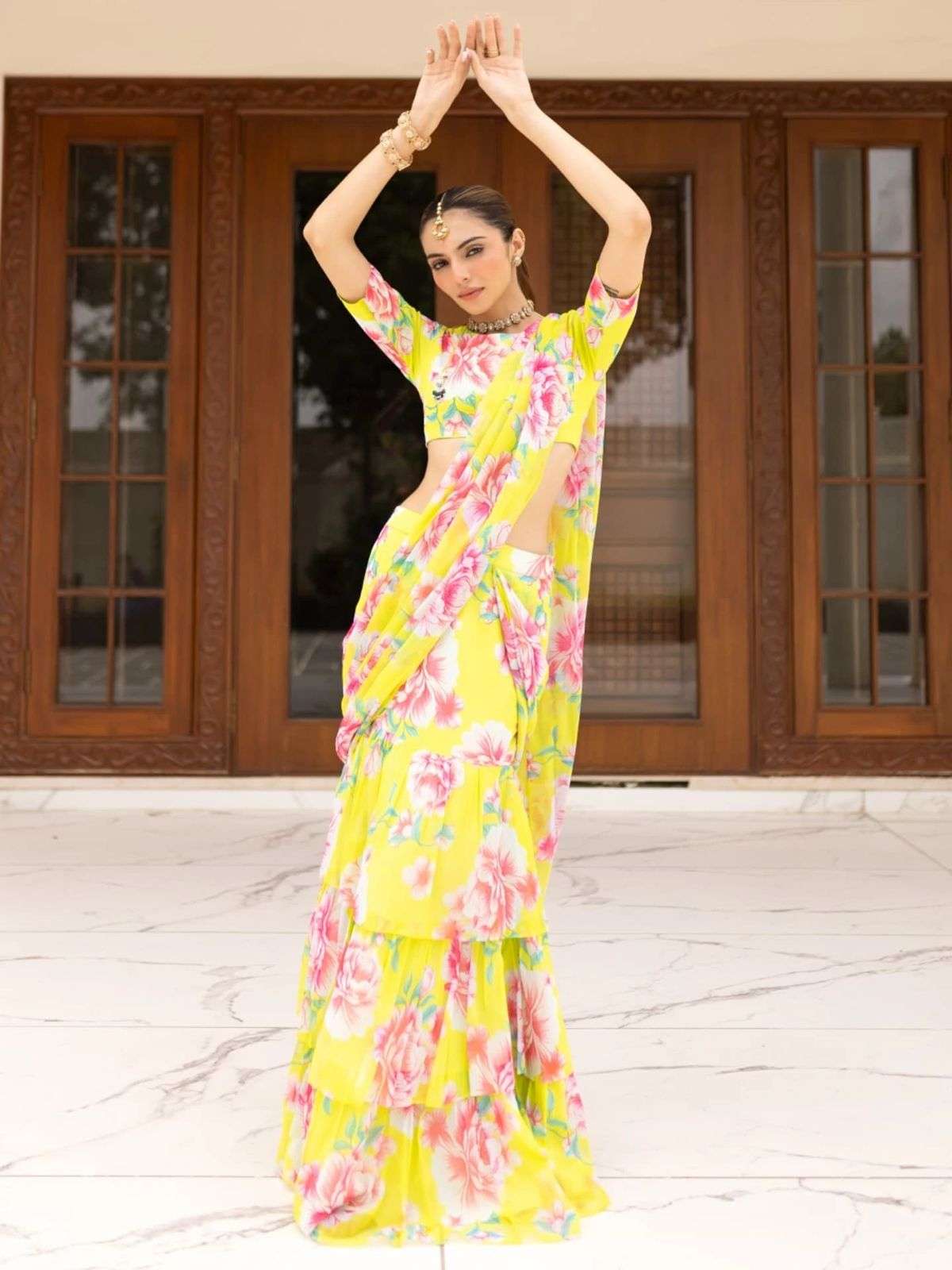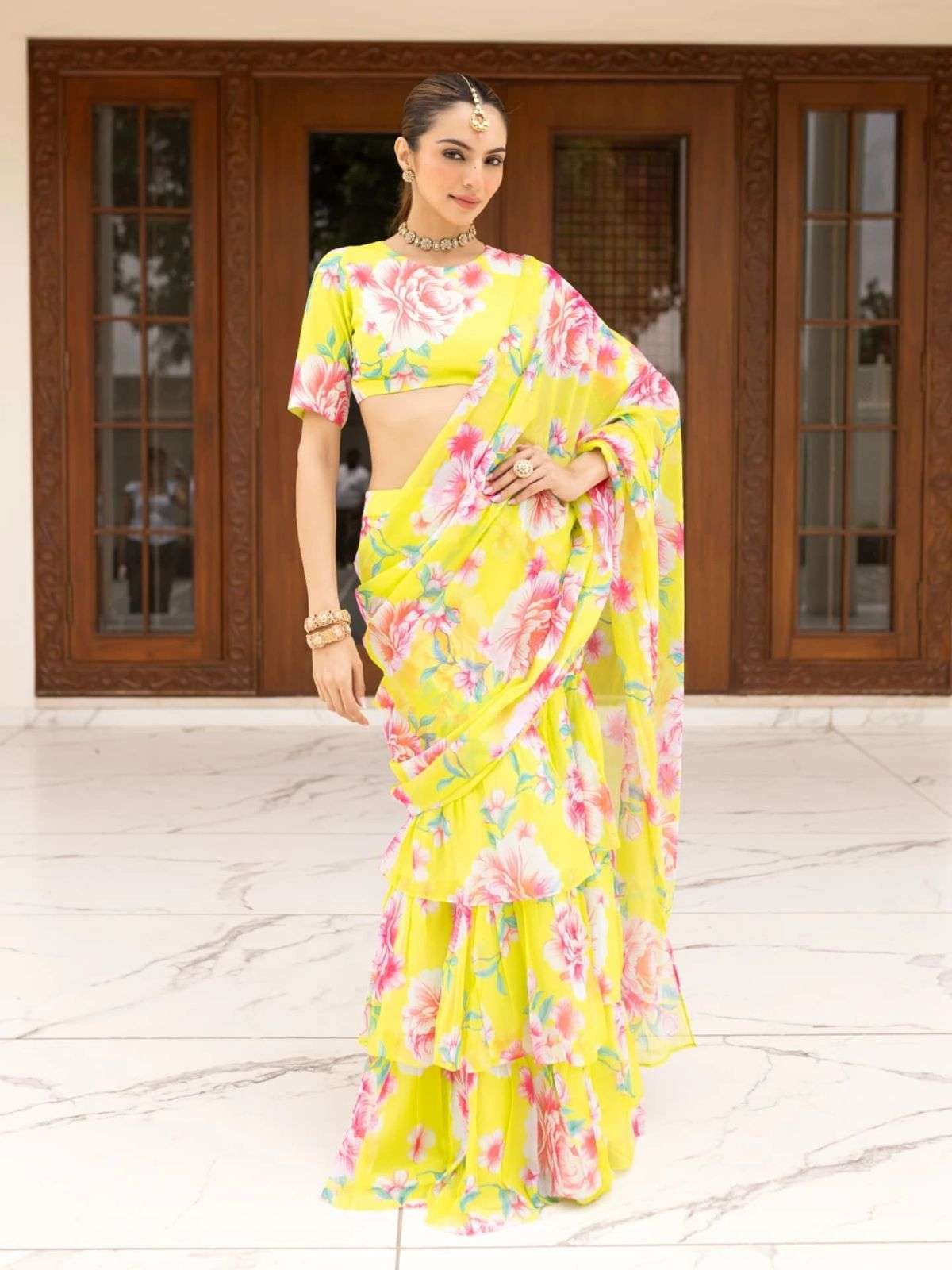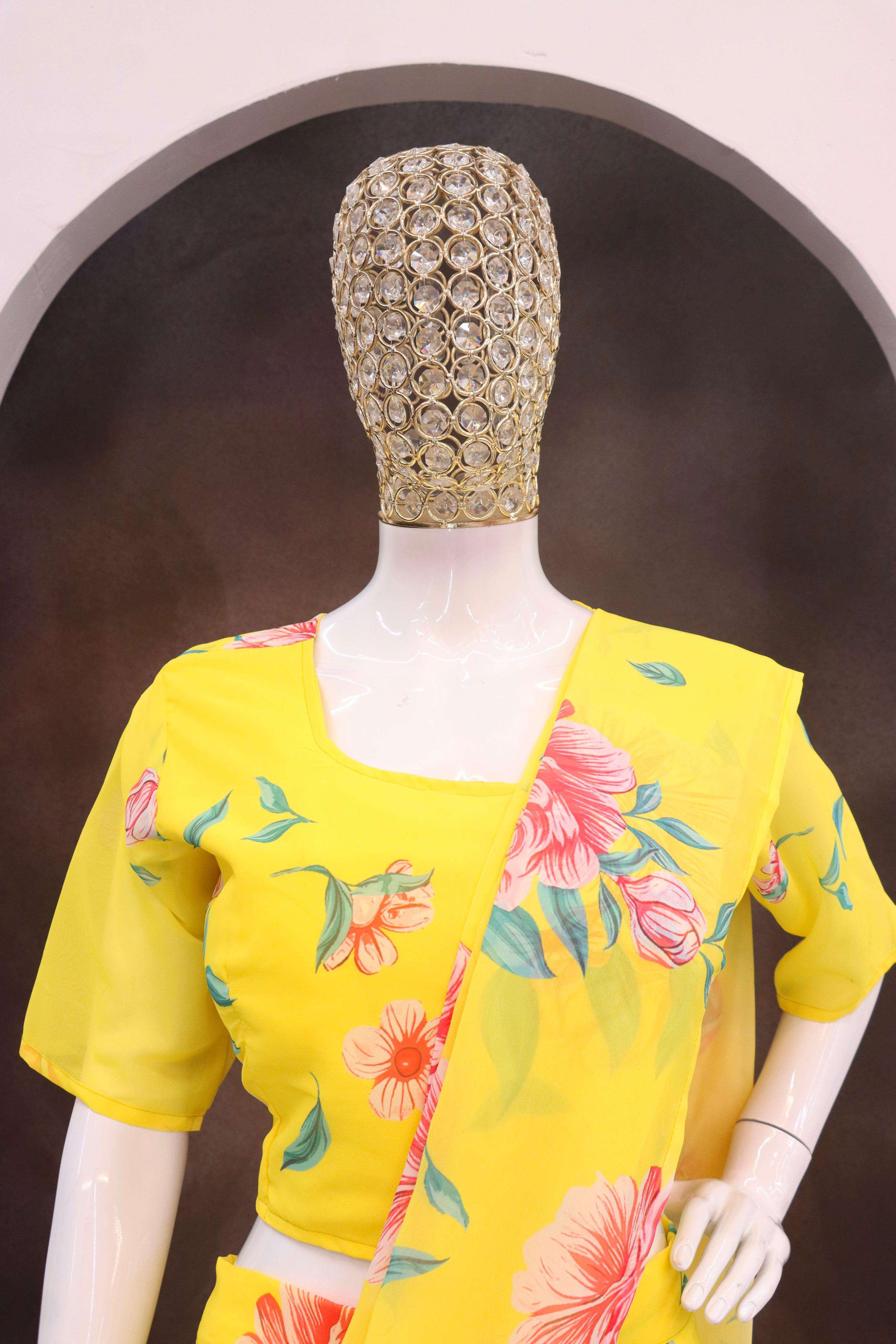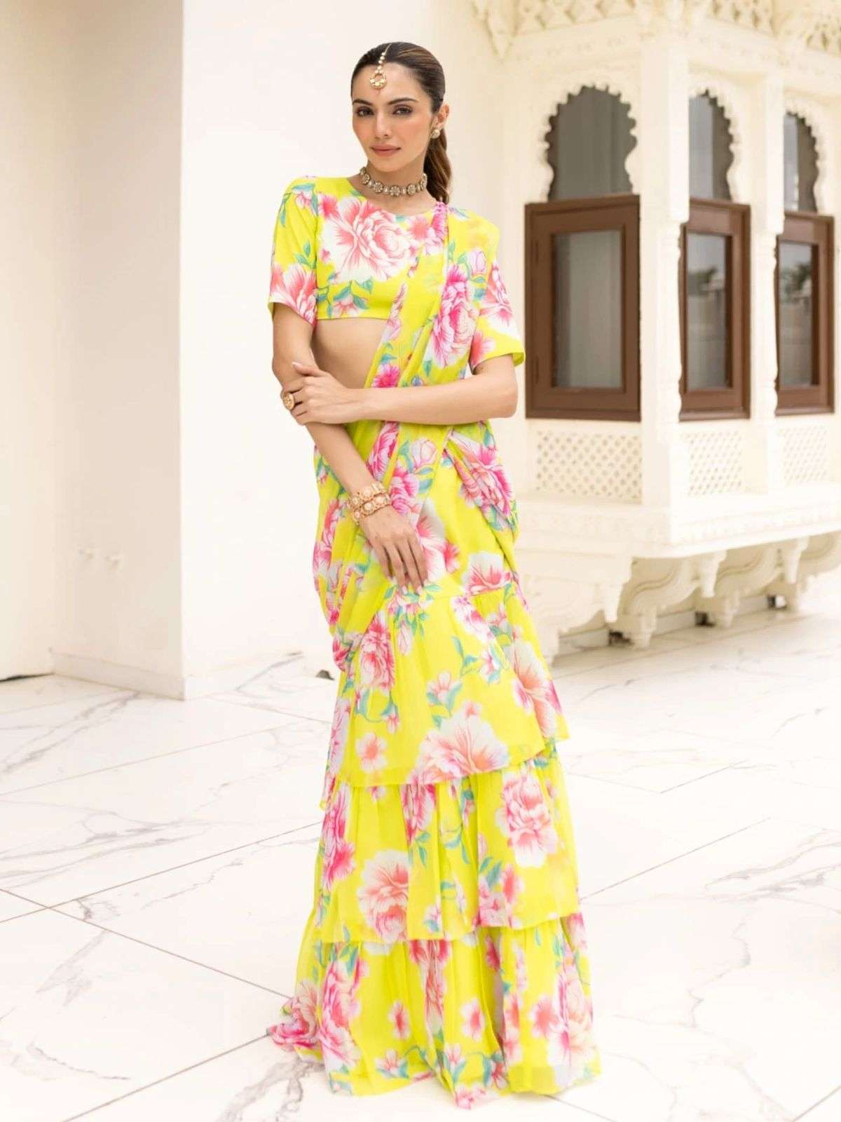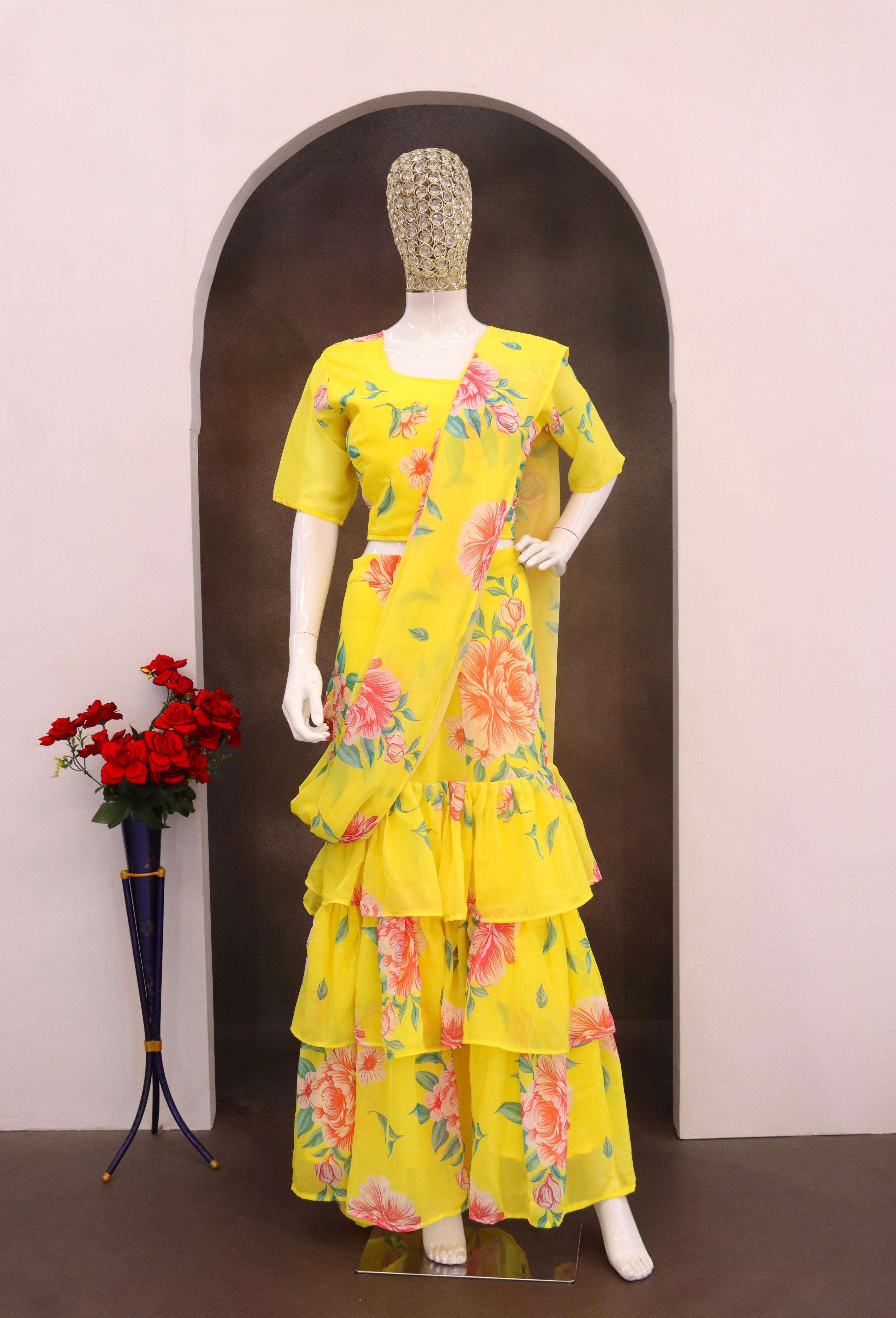 Elevate your festive and special occasion look with this stunning Georgette Ruffle Ready To Wear Saree With Readymade Blouse Design Launch known for its lightweight feel and graceful drape