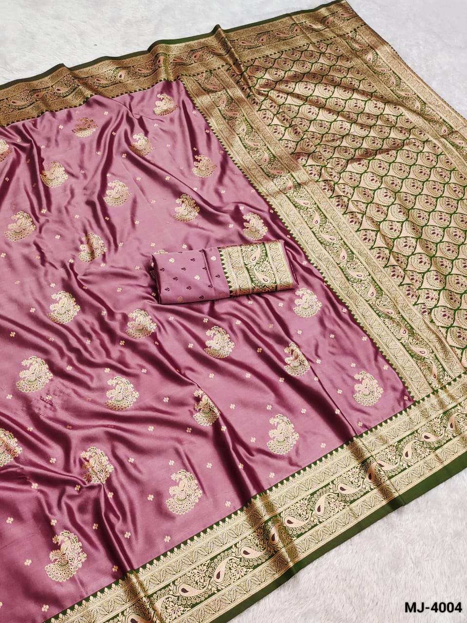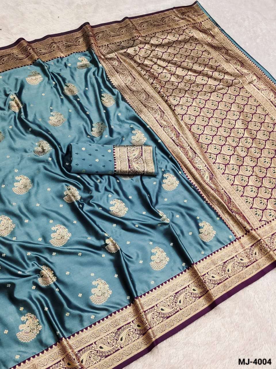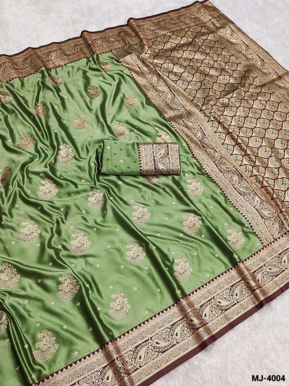 Saree :- A beautiful satin saree featuring delicate gold butta motifs and an intricately designed zari-style border with elegant peacock patterns. The smooth and glossy satin fabric adds a luxurious drape.