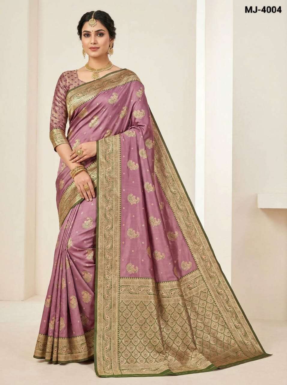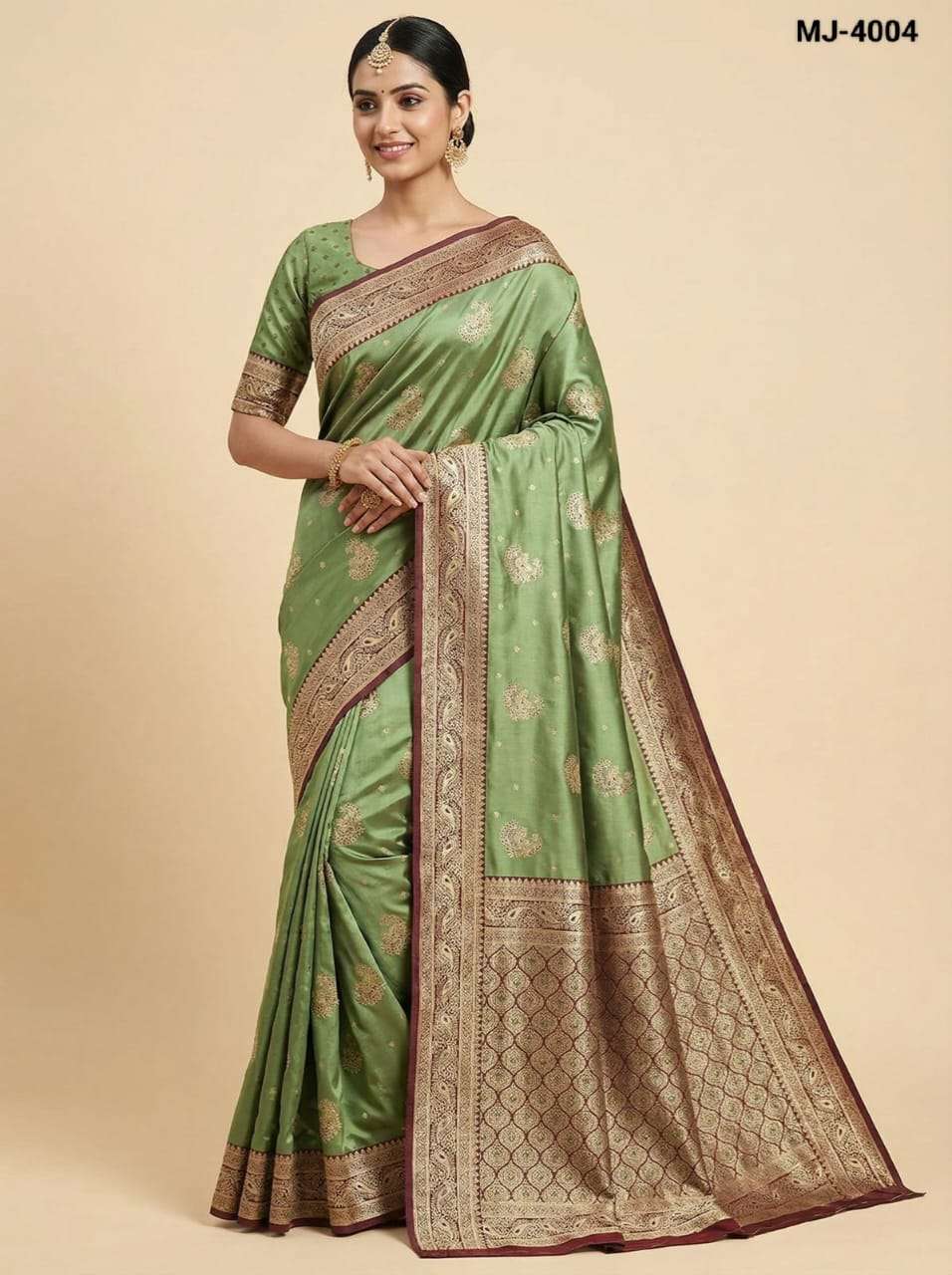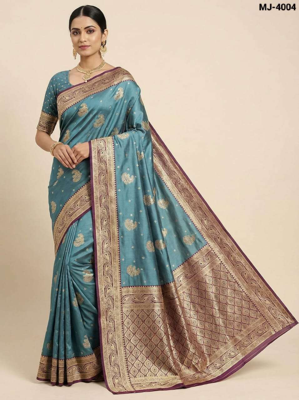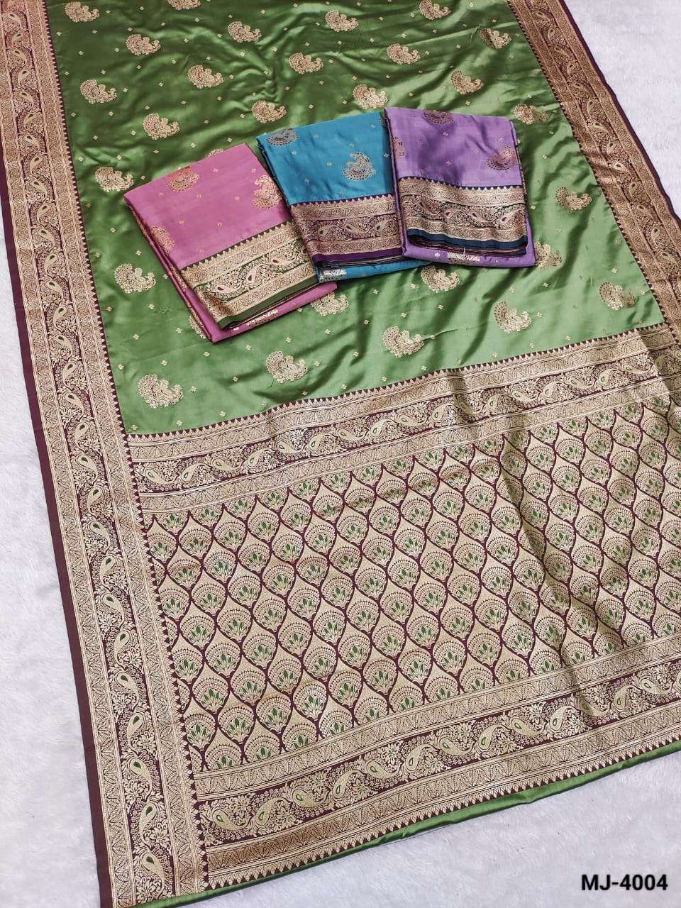 Saree :- A beautiful satin saree featuring delicate gold butta motifs and an intricately designed zari-style border with elegant peacock patterns. The smooth and glossy satin fabric adds a luxurious drape.