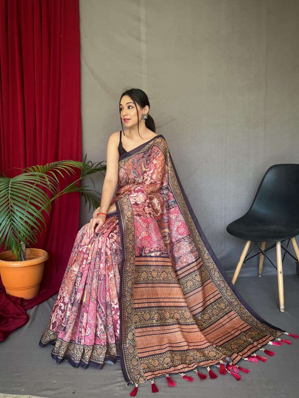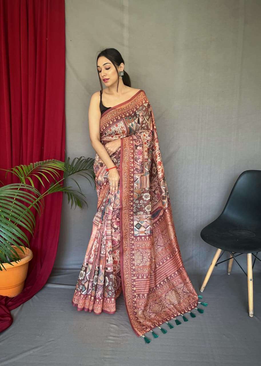 Beautiful Cotton Sarees With Kashmiri Digital Print With Contrast Kashmiri and Floral conceptual Printed Border and Pallu attached with Tassels