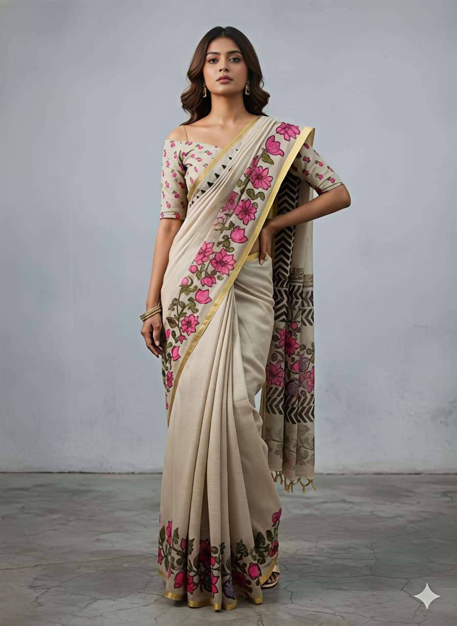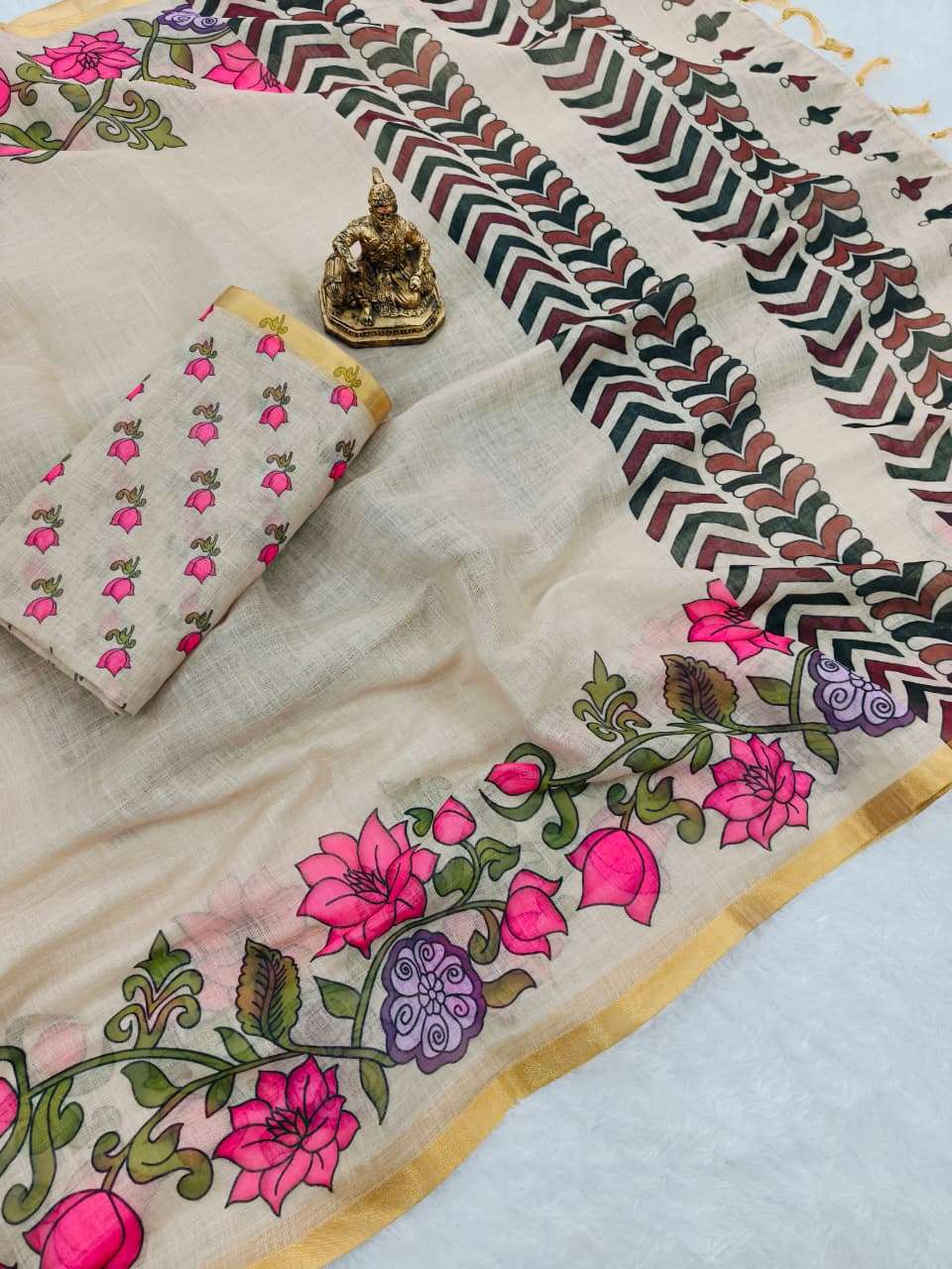 Saree Fabric: Heavy linen blooming saree floral digital print on allover saree attached with heavy motif Tussels and gold border with PERFECTLY MATCHED blouse piece and pallu
