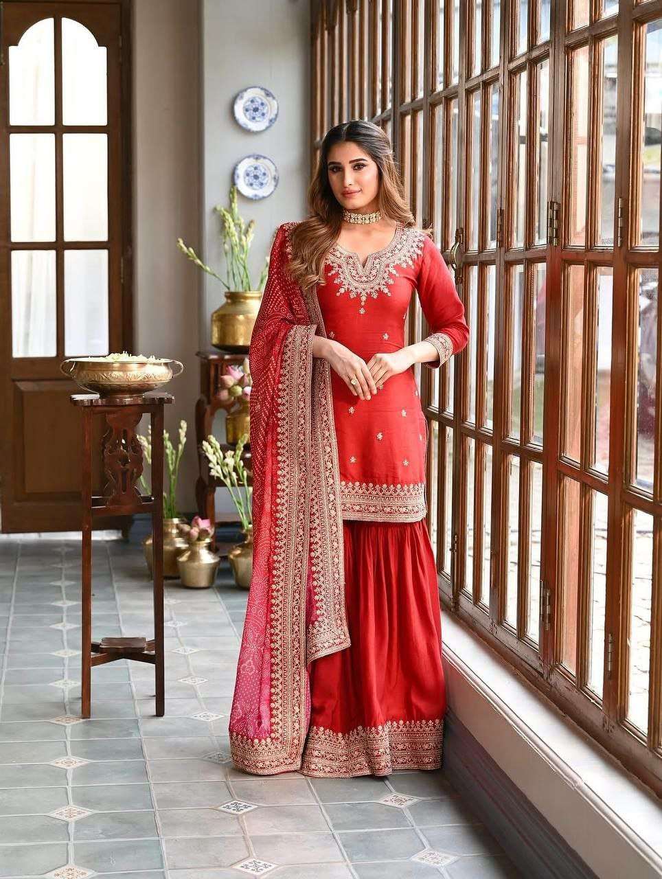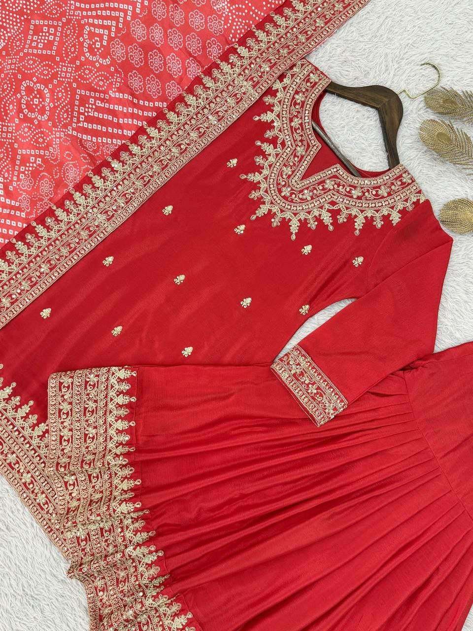 WORK :- FANCY BANDHEJ DIGITAL PRINT AND HEAVY EMBROIDERY CODING WORK LACE BORDER.