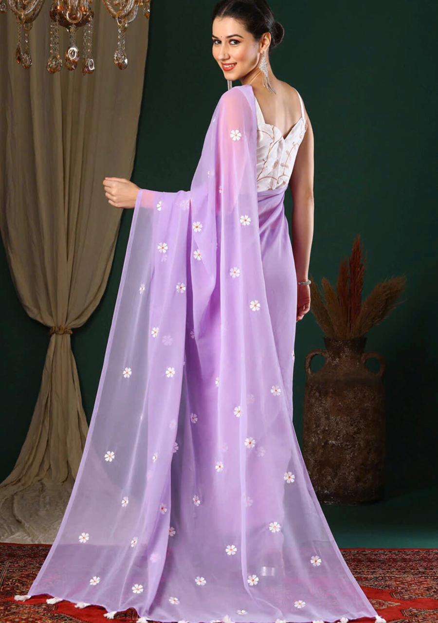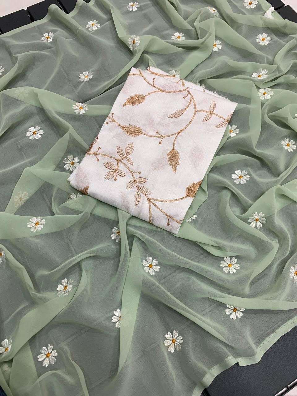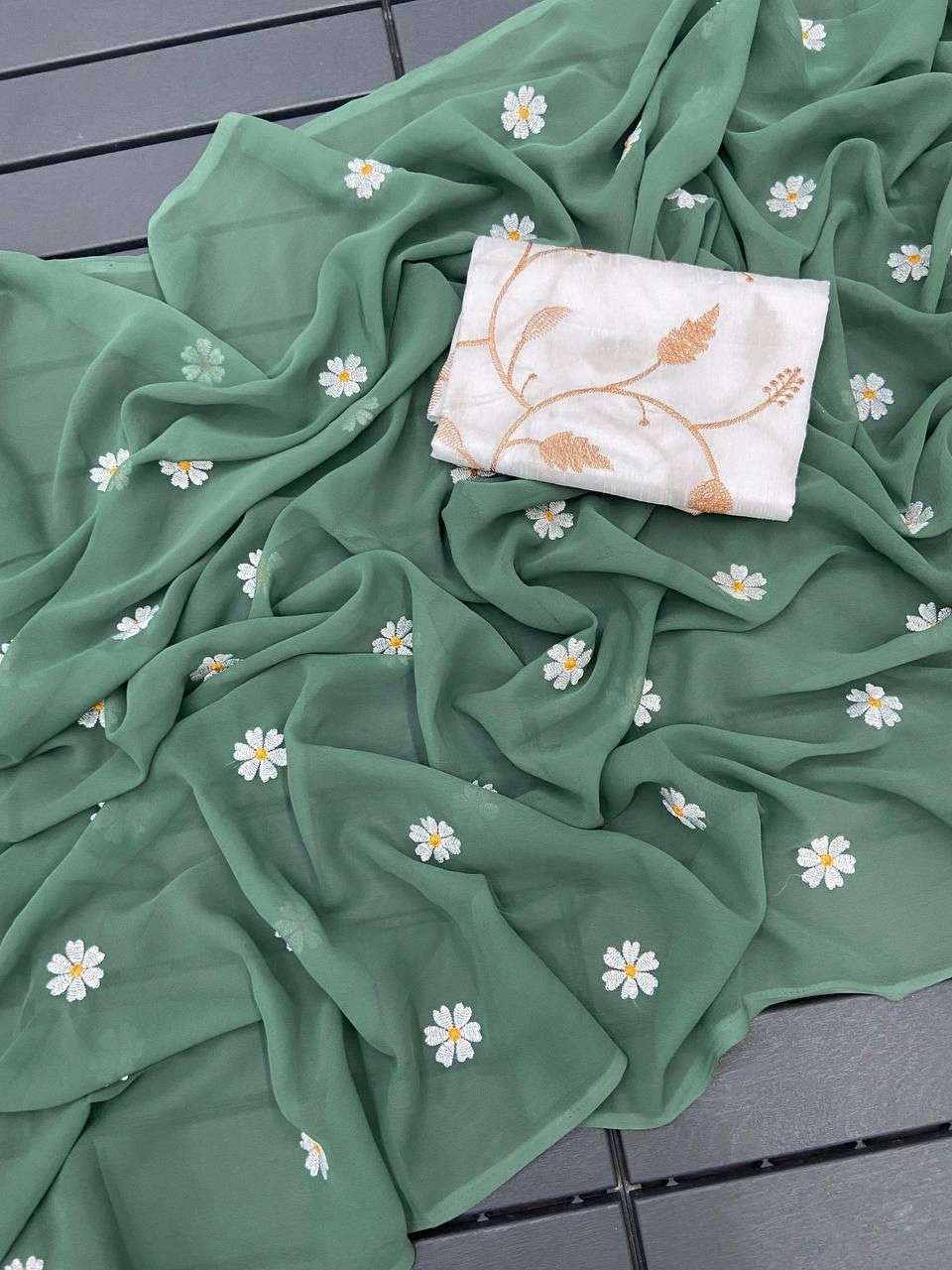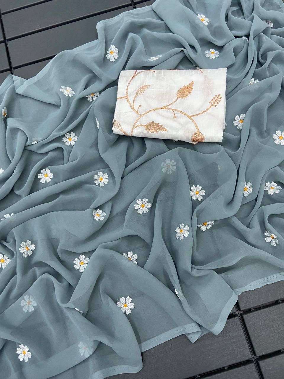 Design: This beautiful saree features delicate embroidery of sunflowers, adding a graceful and vibrant touch to your ensemble.