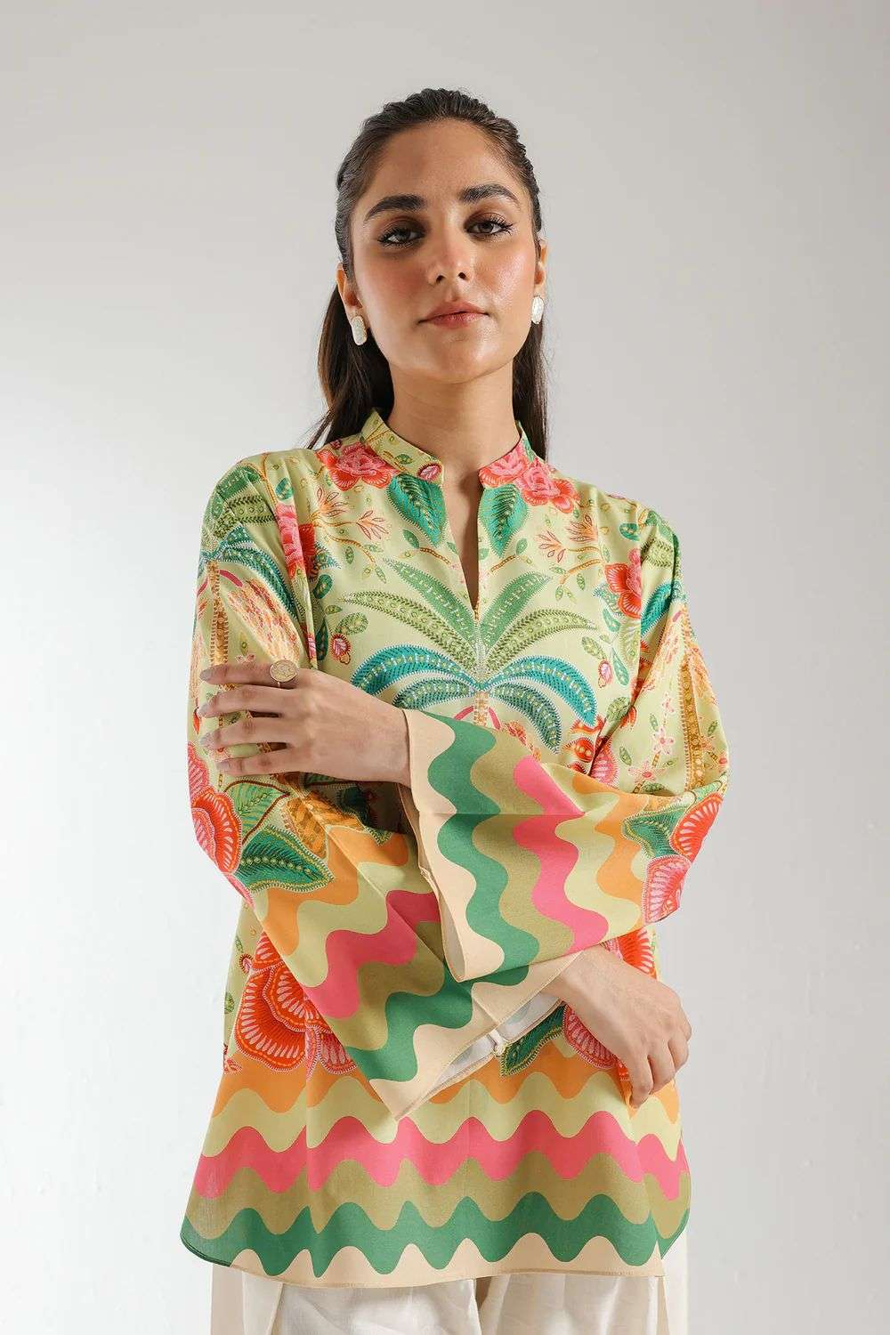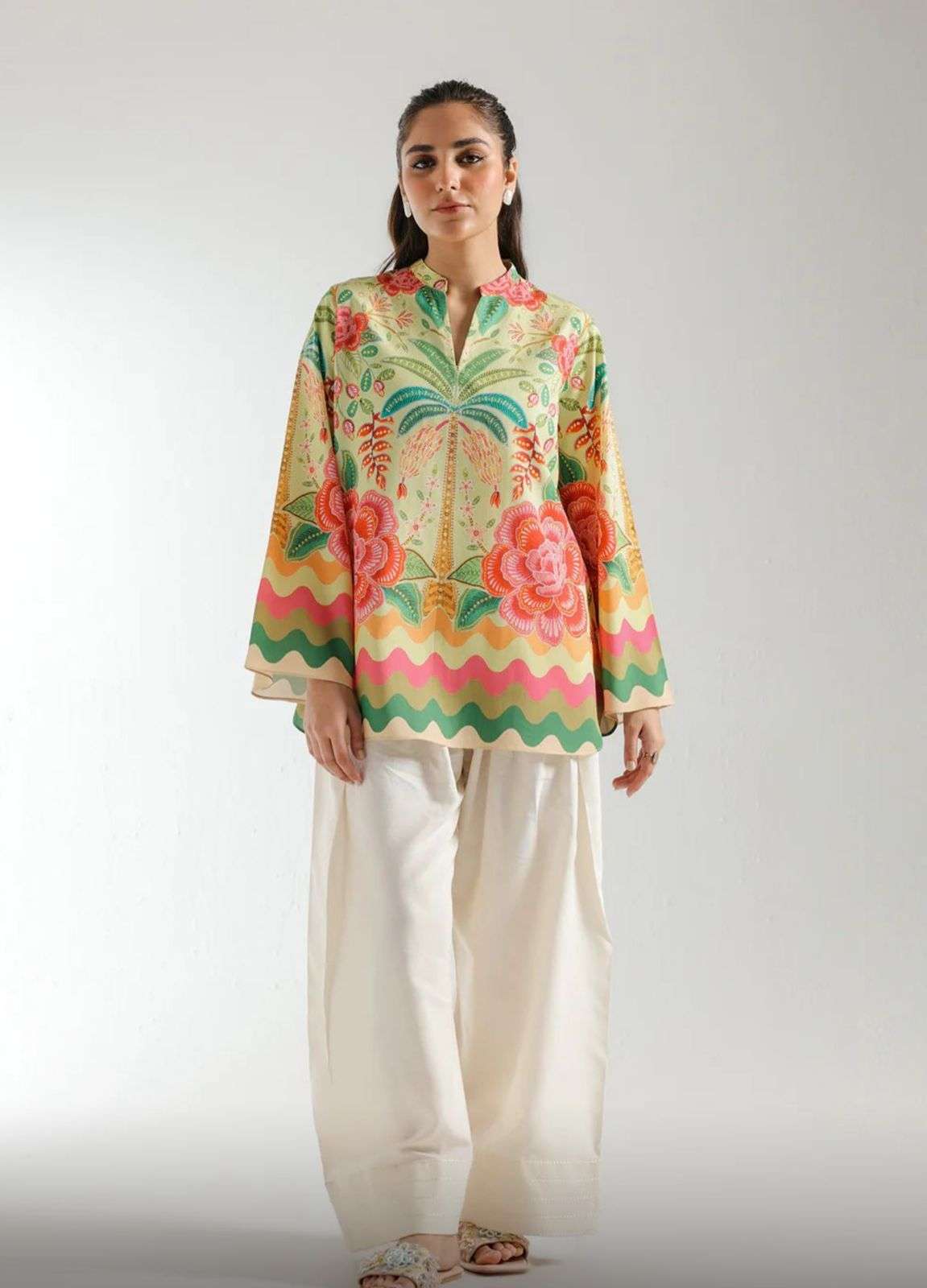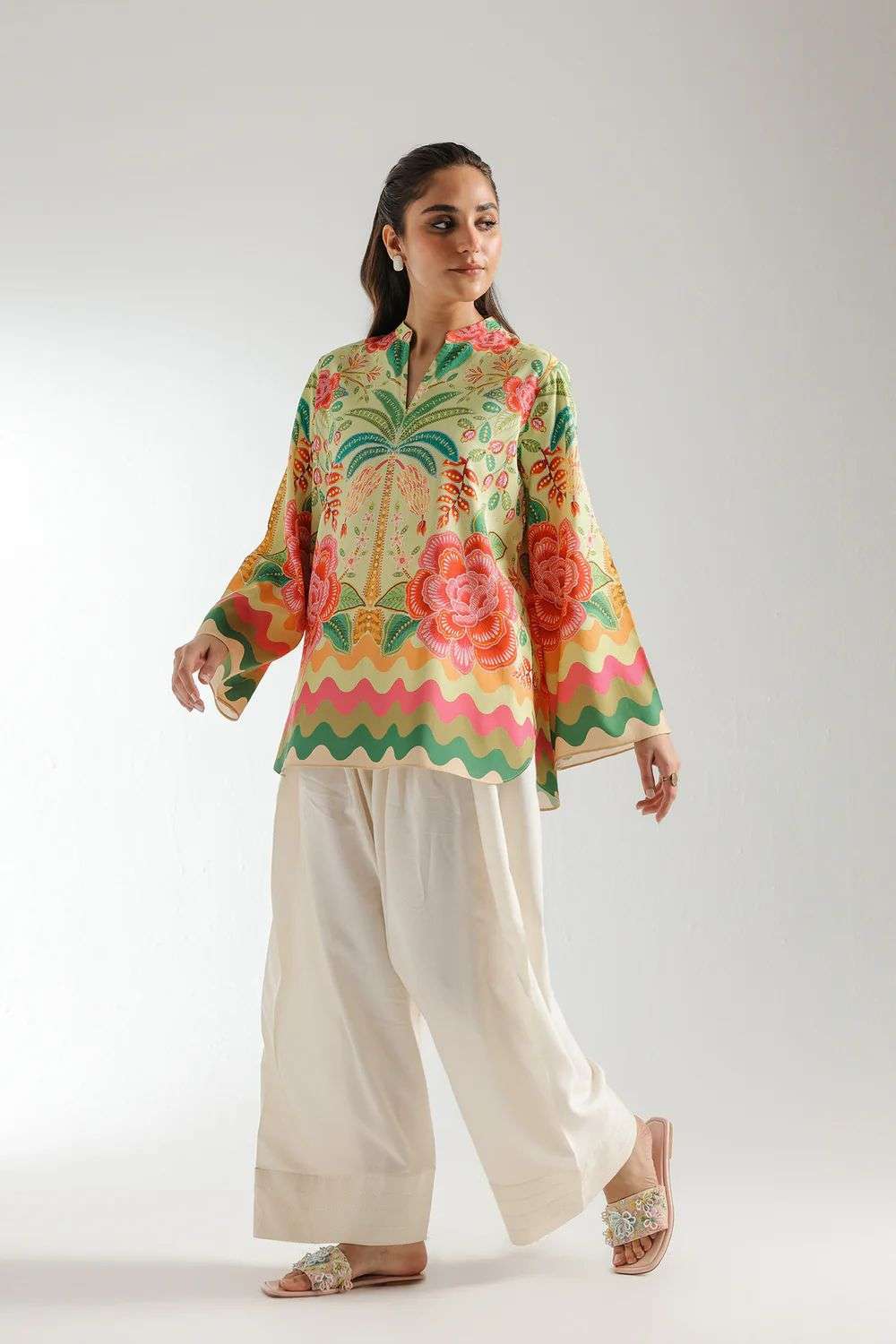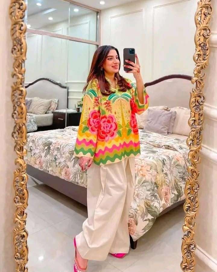 New arrival 2 pc coordset with palm-tree style, floral patterns, and fresh green–pink–yellow palette Perfect for vacation, brunch, or resort-wear vibes with farshi salwar bottom …Not just coords Endless compliments