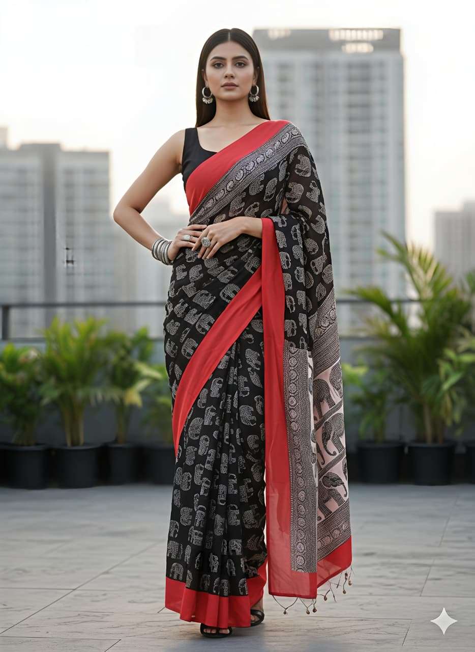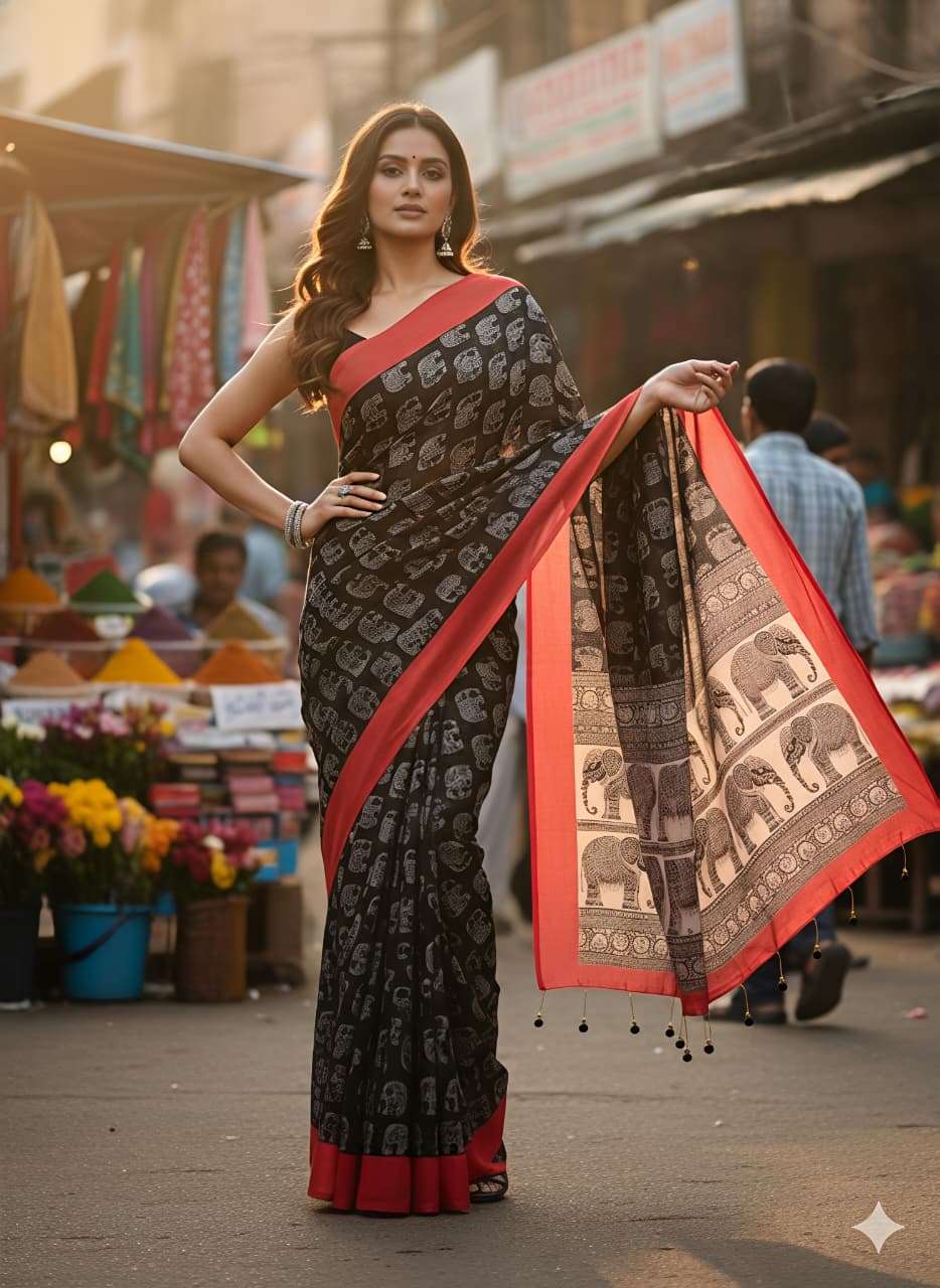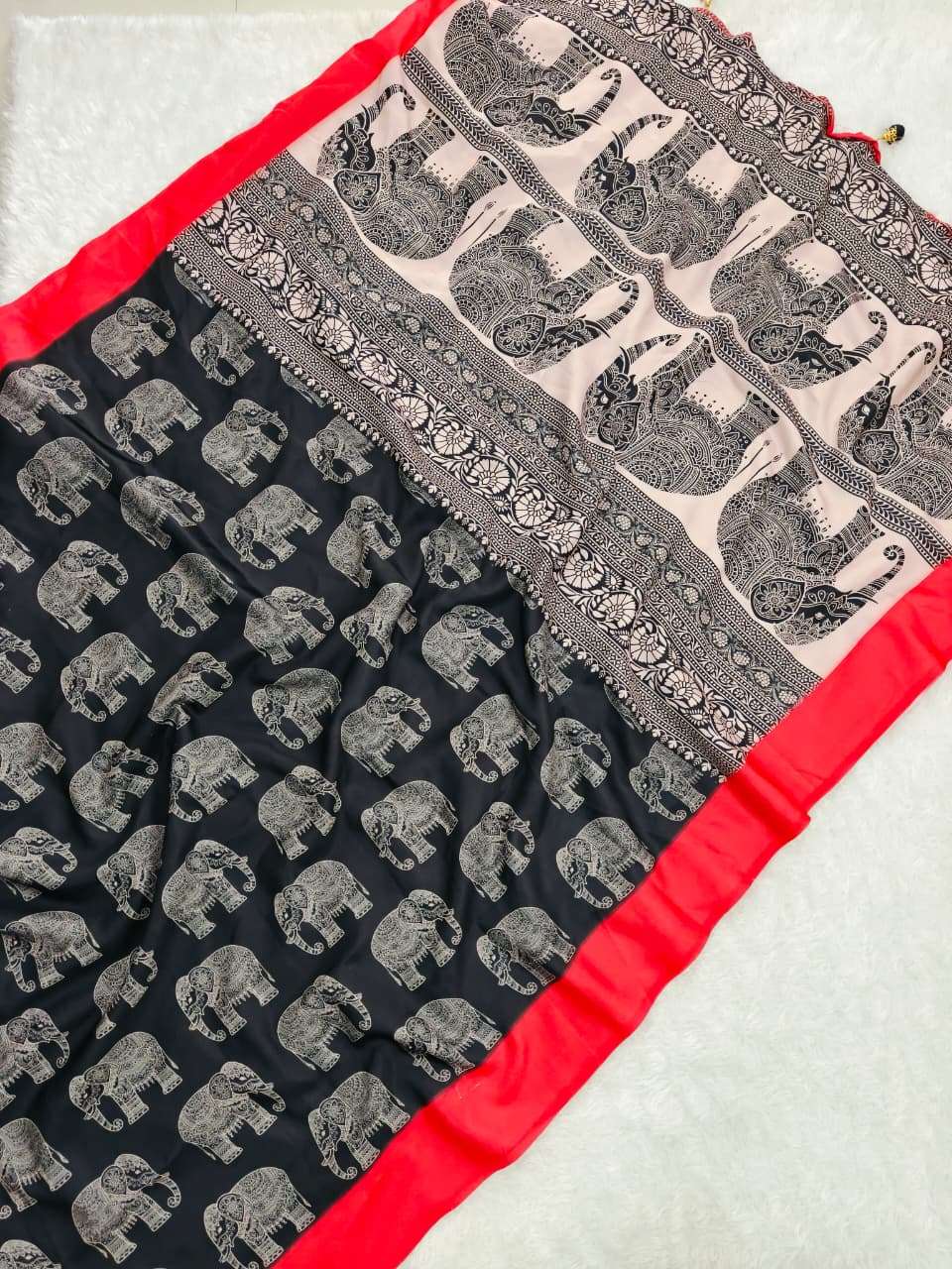 Description-Pure crepe silk saree with elephant print all over sarees attached with perfectly matched pallu & blouse peice and heavy motif tussels