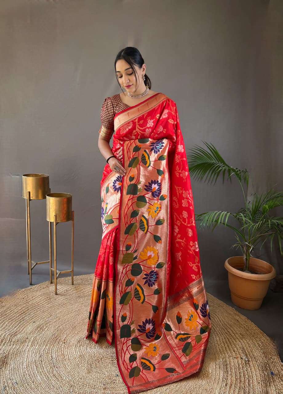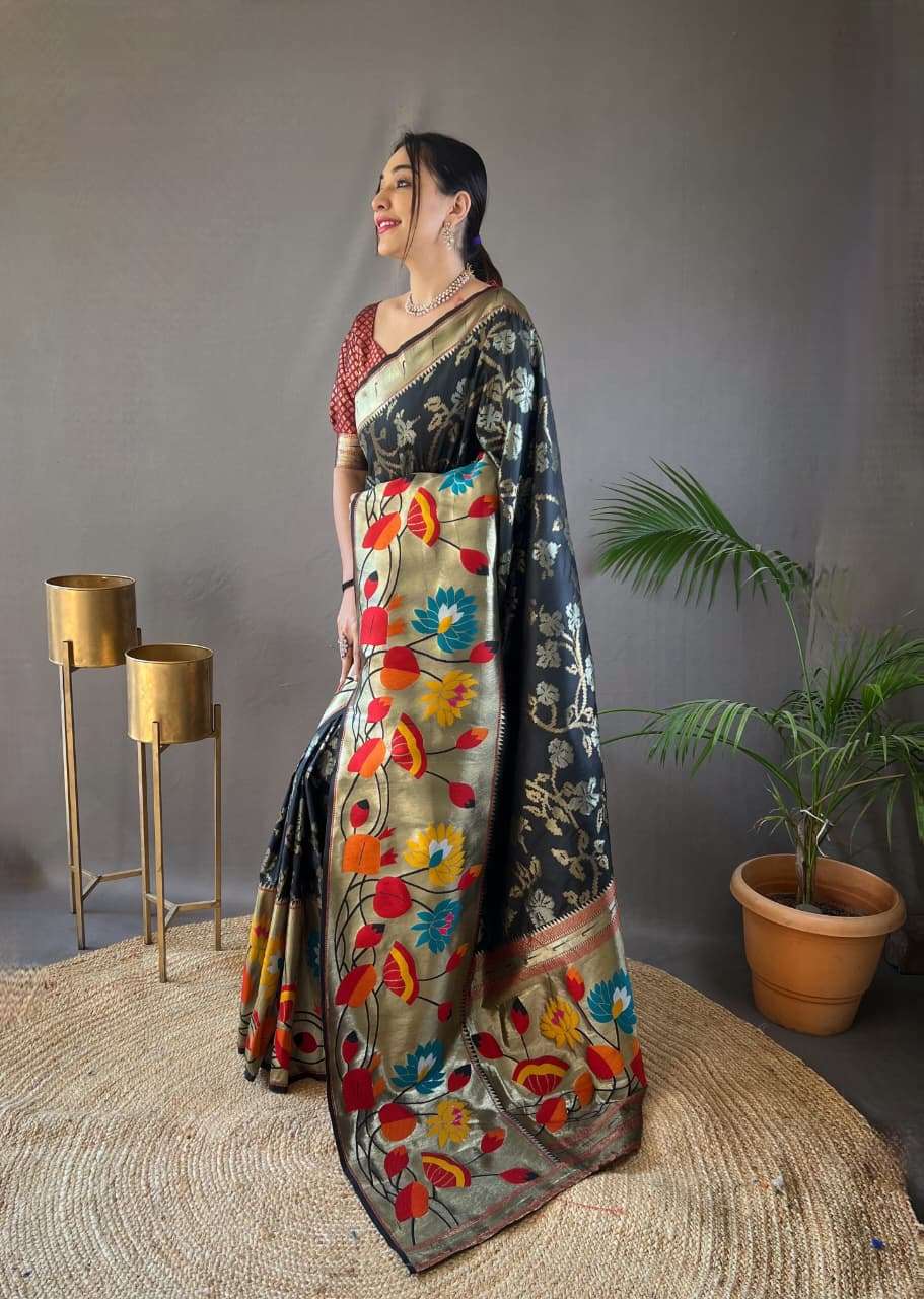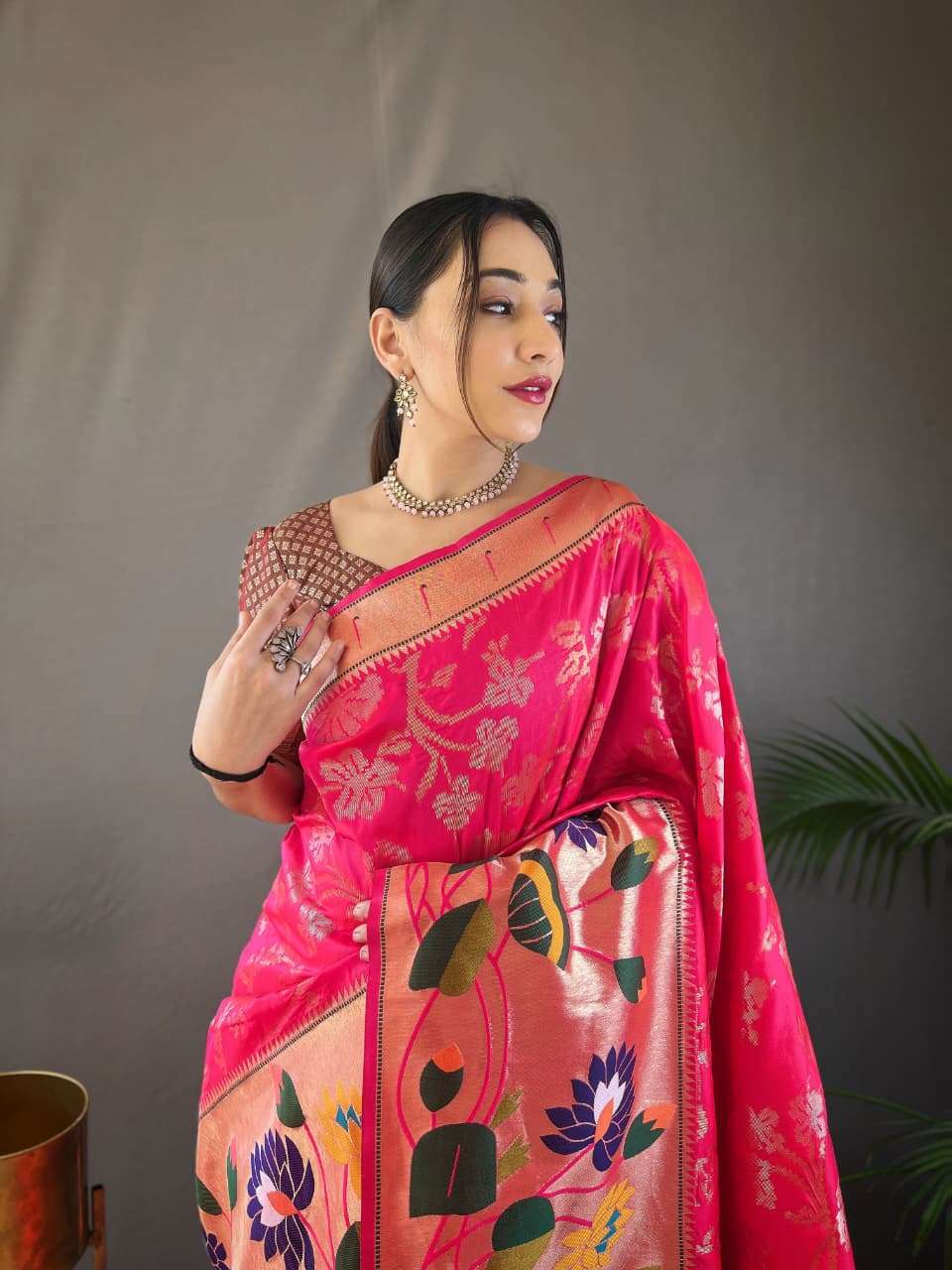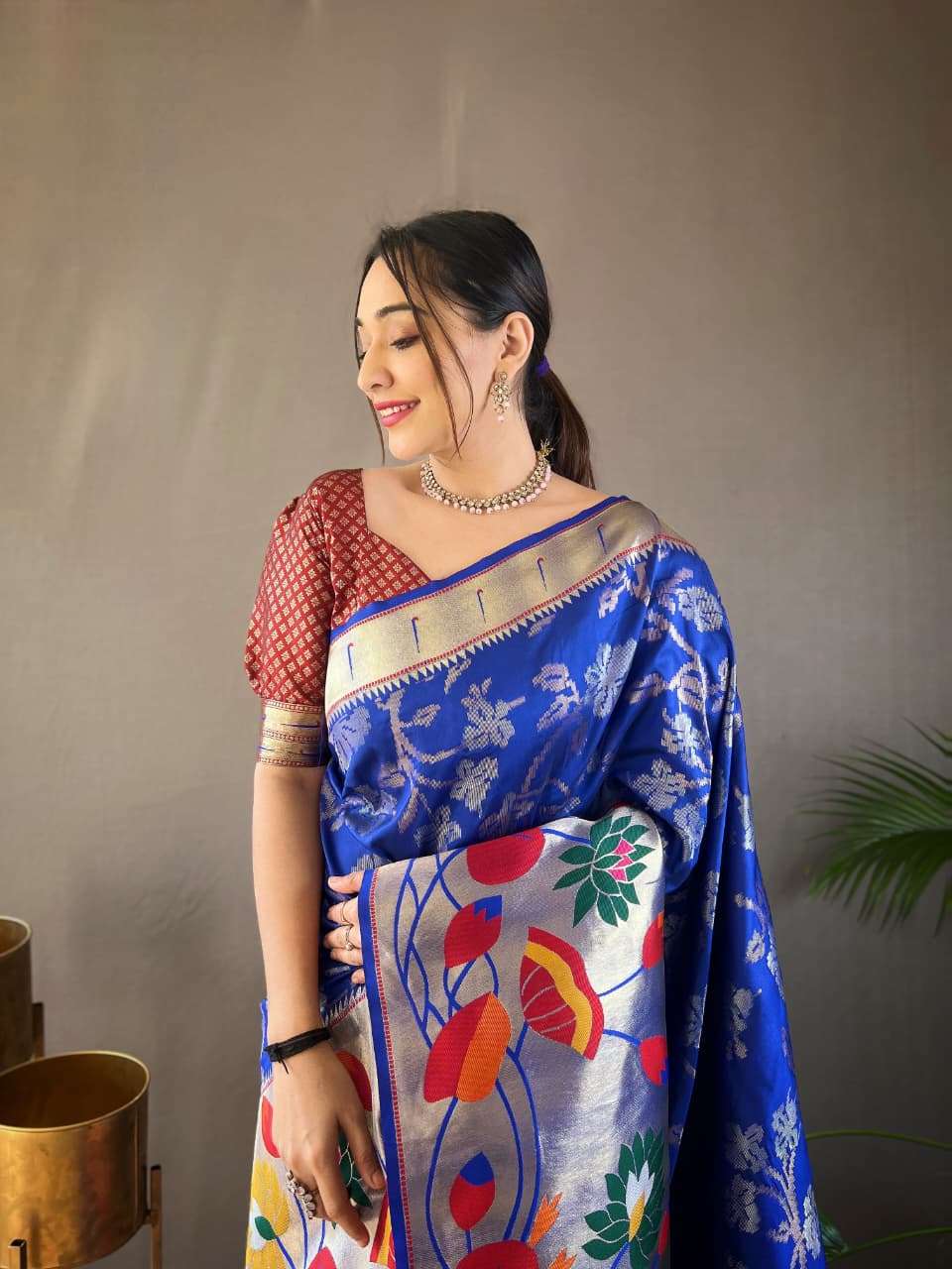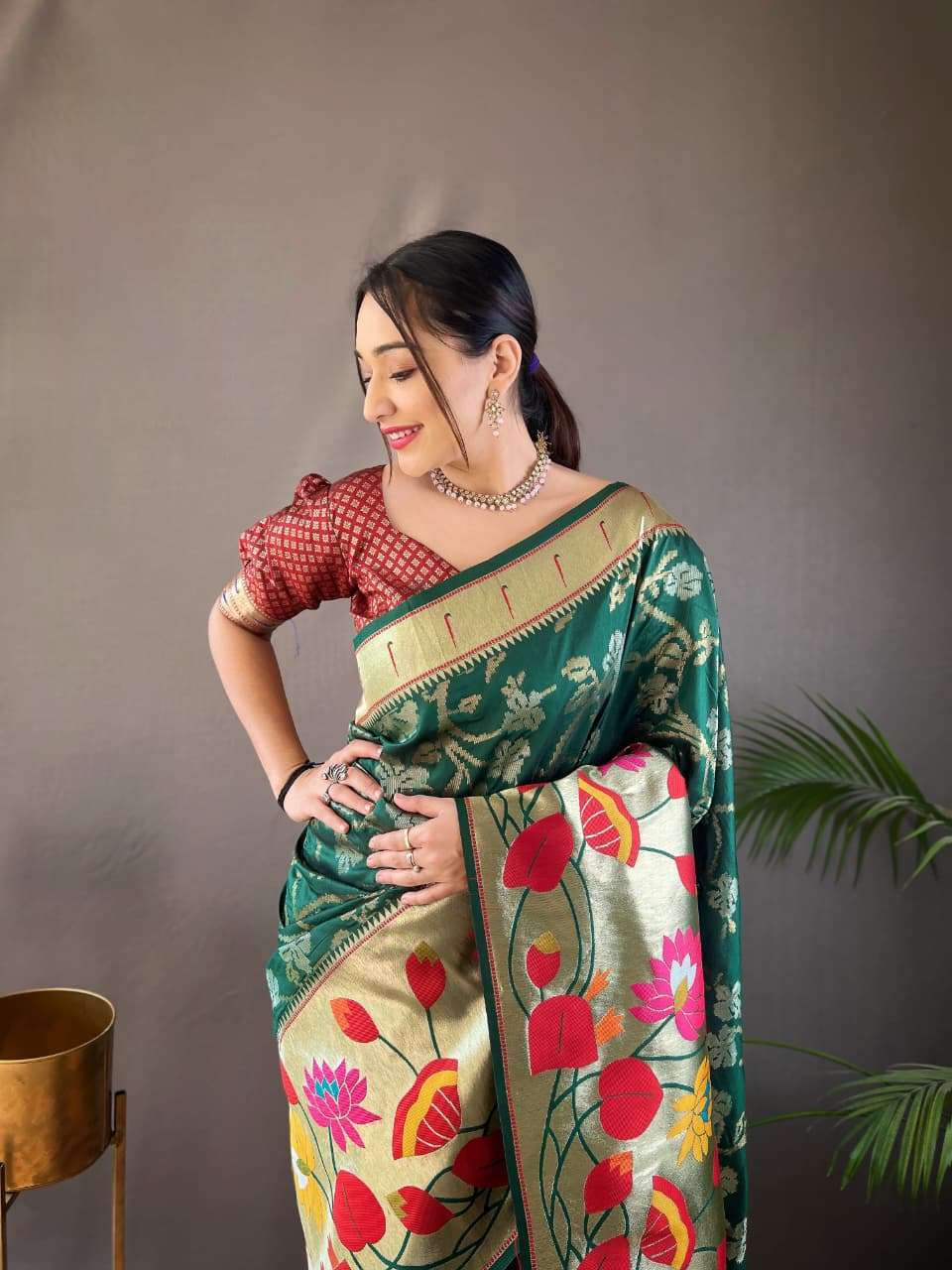Pure soft paithani silk saree with rich weaved paithani pallu along with all over beautiful 3d traditional design patterns on the entire body having combination of gold and silver zari