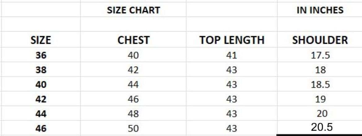 | SIZE: | 36 | 38 | 40 | 42 | 44 | 46 |