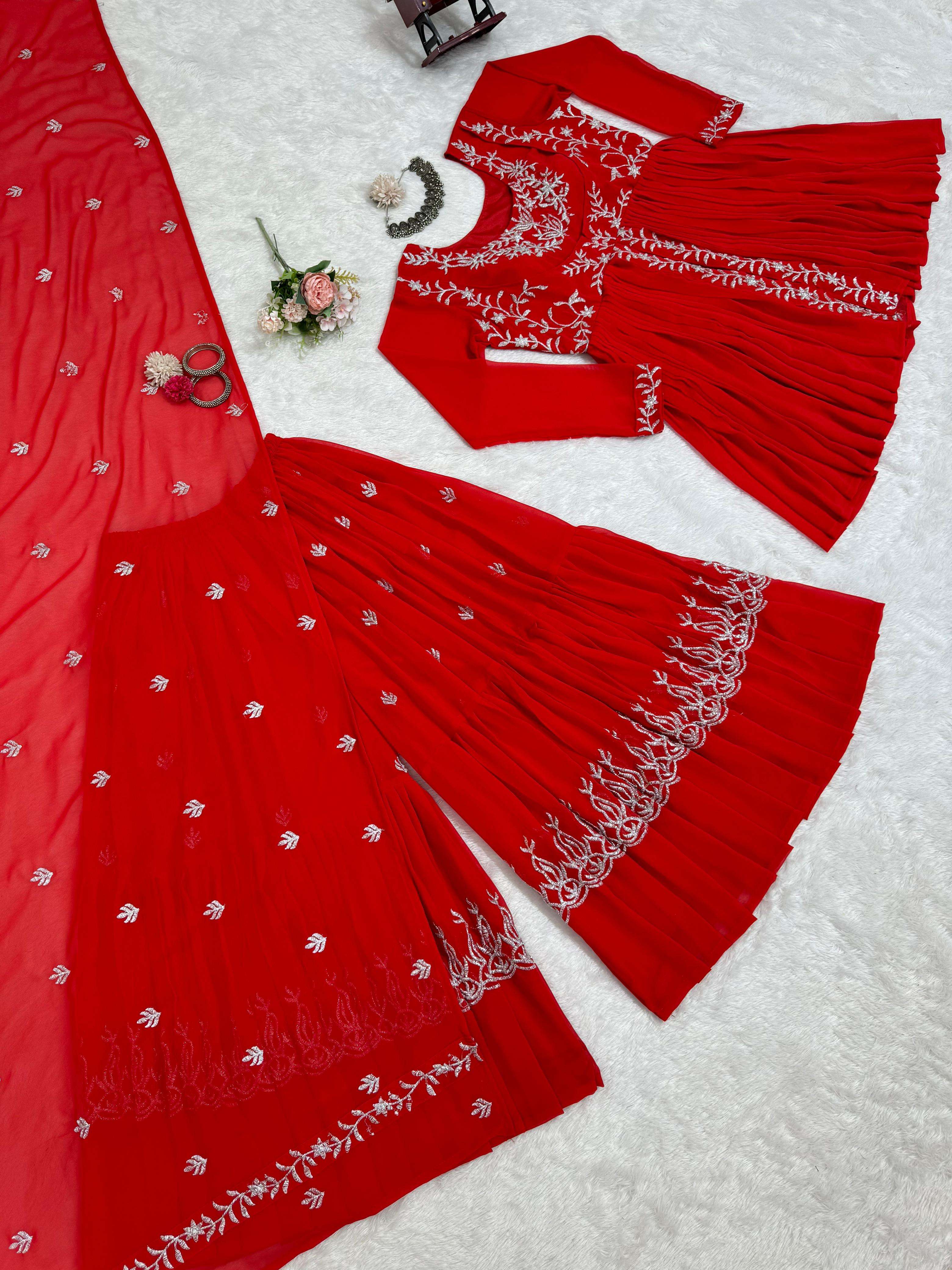 Looking for this same colour beautiful Designer Suit On Faux Georgette febric with inner & Thred work and Sharara Plazoo on also Faux Georgette febric with inner & Thred work and Dupatta on also Faux Georgette febric Thred work.