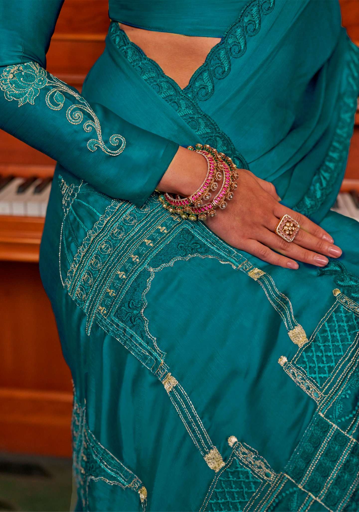Blouse- Matching satin chiffon fabric with multi thread embroidery.