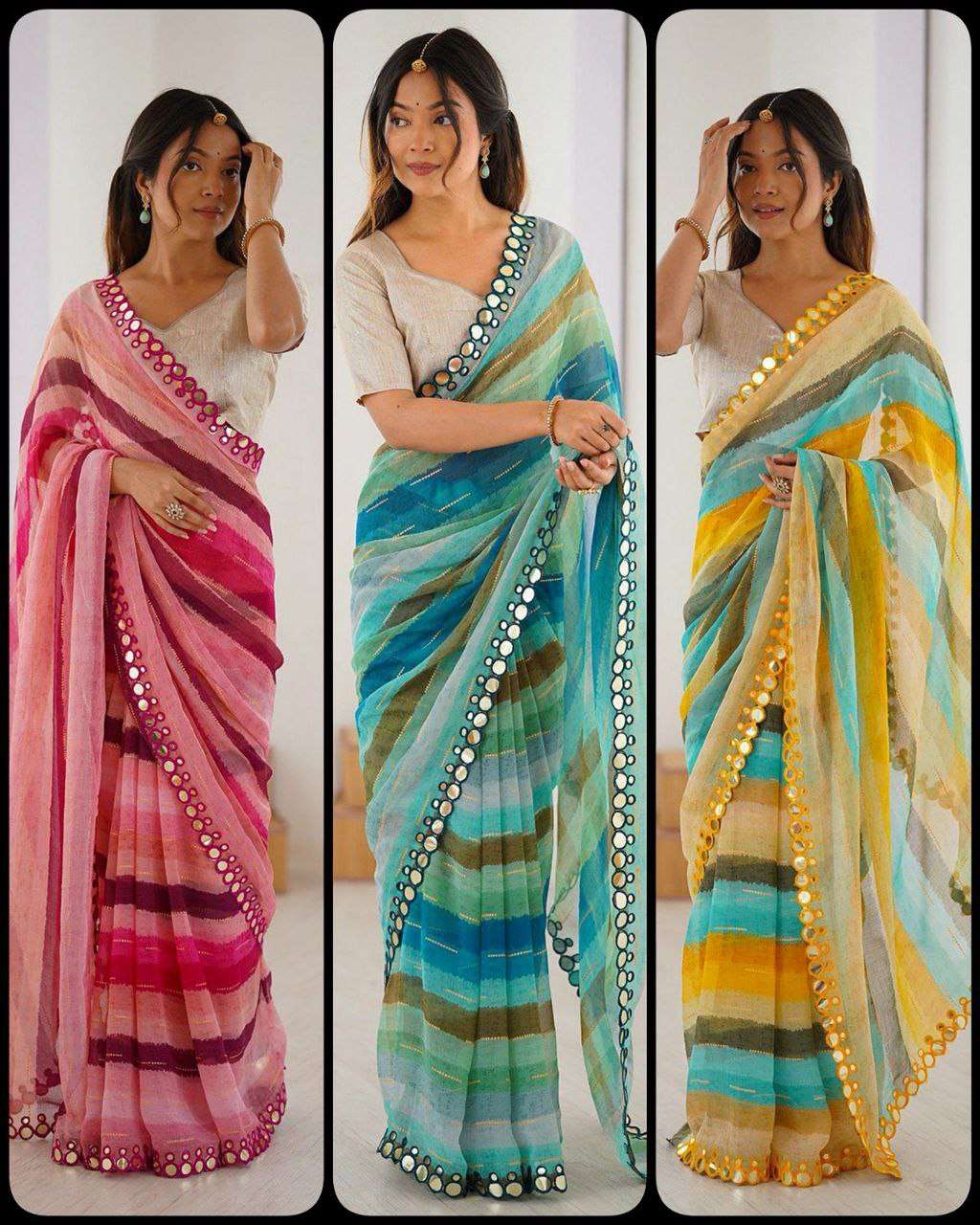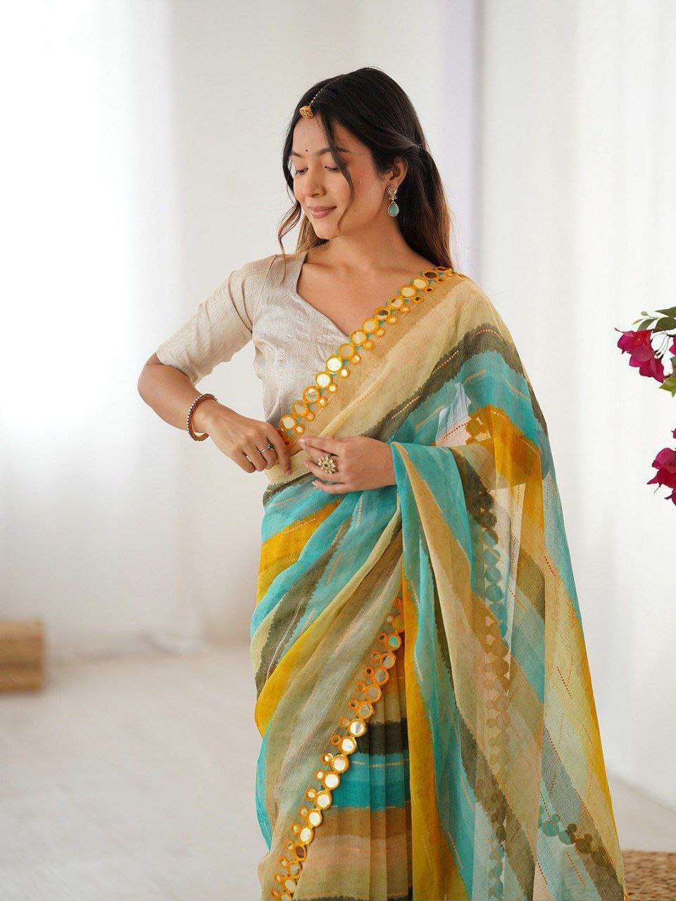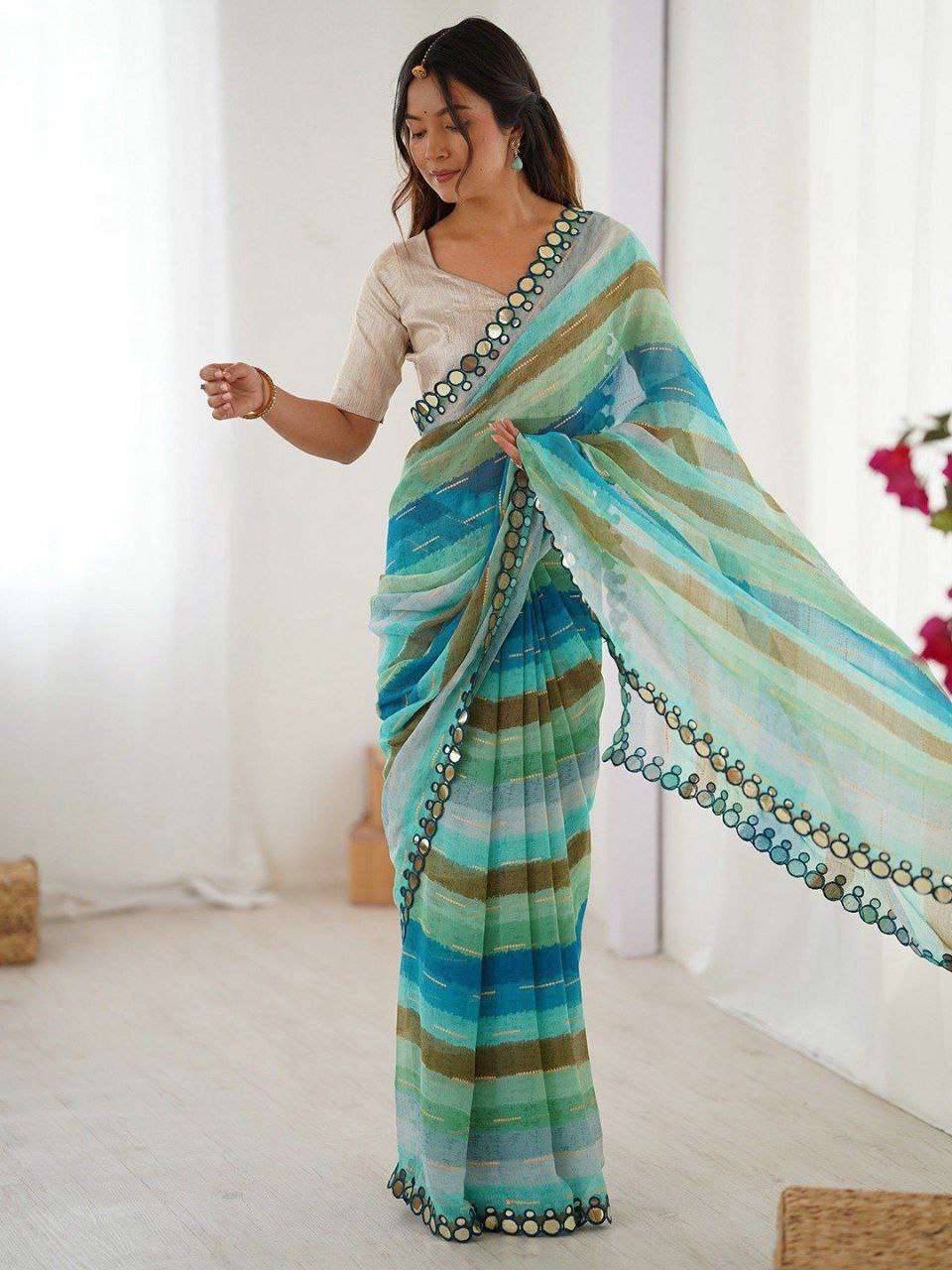 Fabric - Linen fabric Printed saree with rich Leria Look Mirror Border work allover saree with beautiful border.