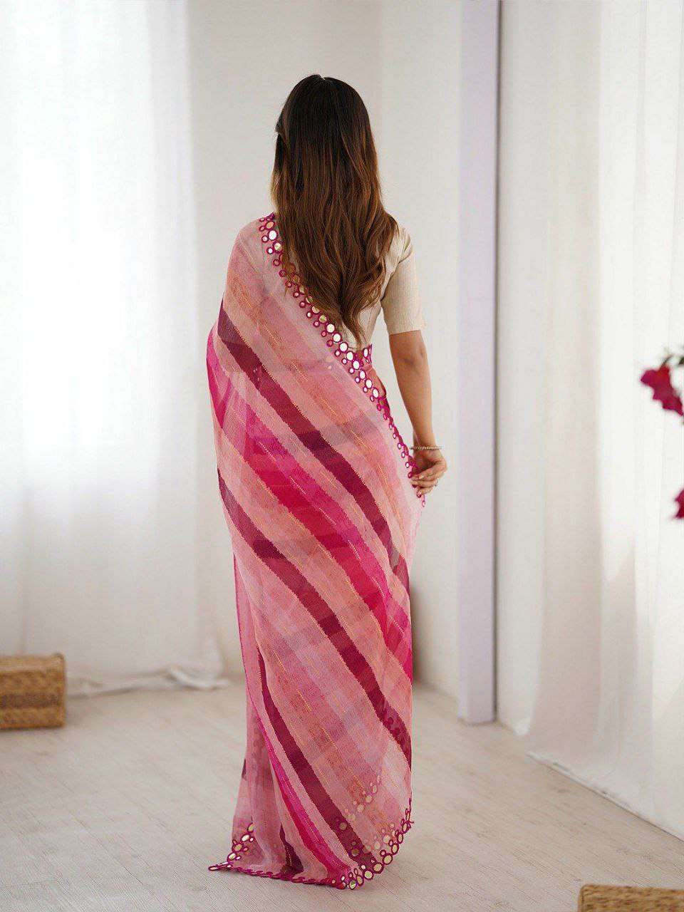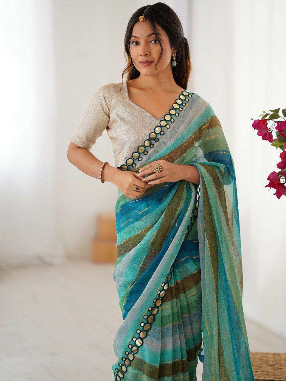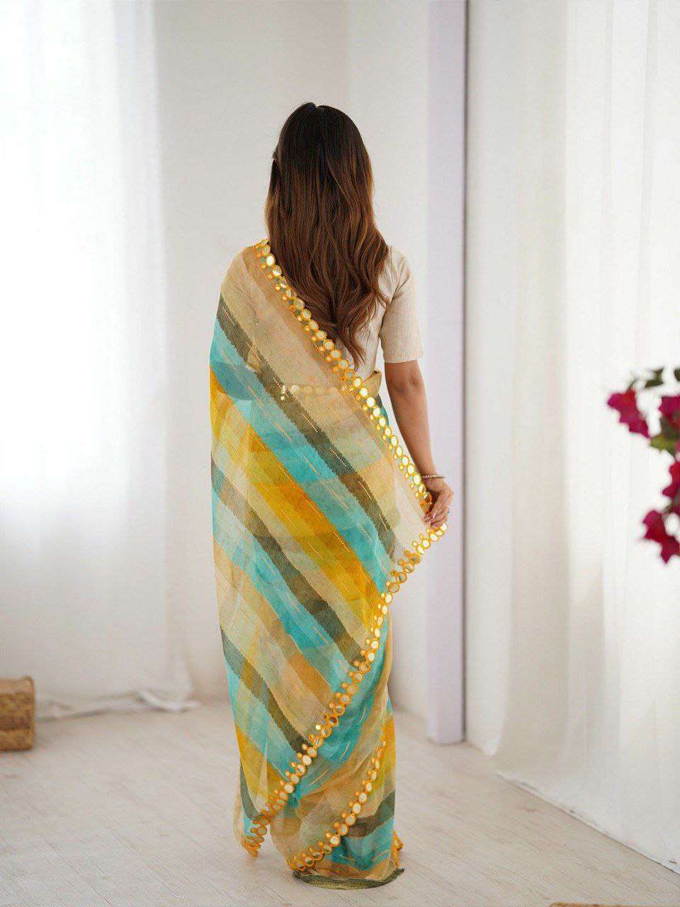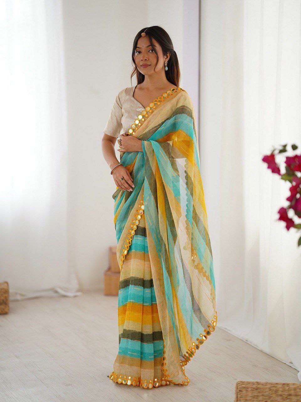 Fabric - Linen fabric Printed saree with rich Leria Look Mirror Border work allover saree with beautiful border.