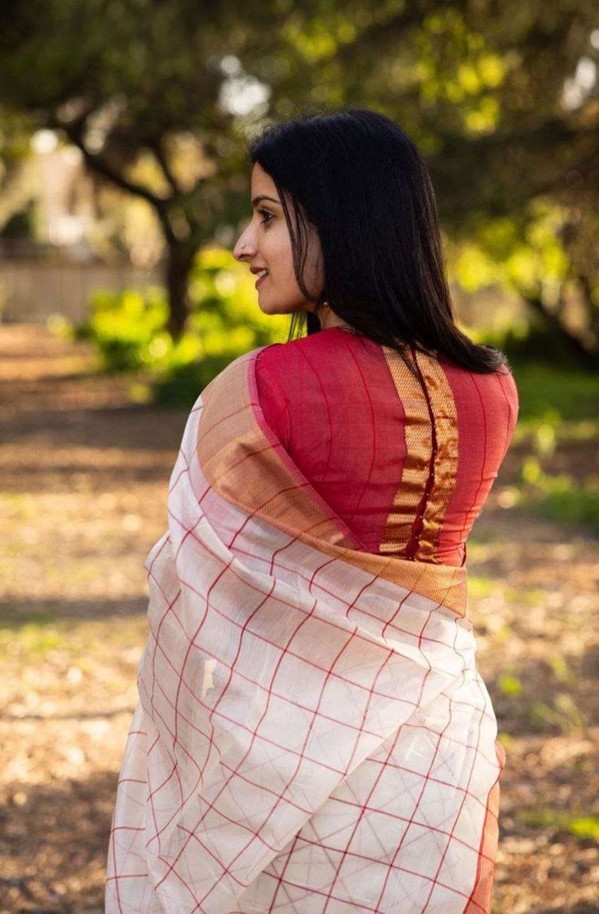 Blouse Fabric - Linen with gold jari 5×5 border with digital print