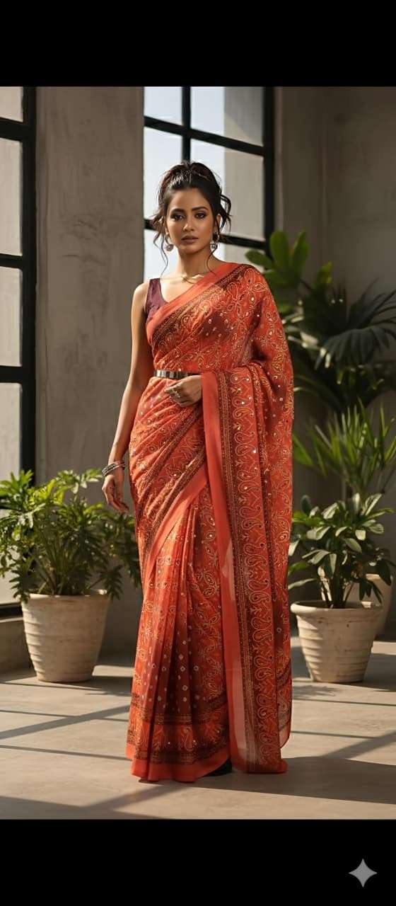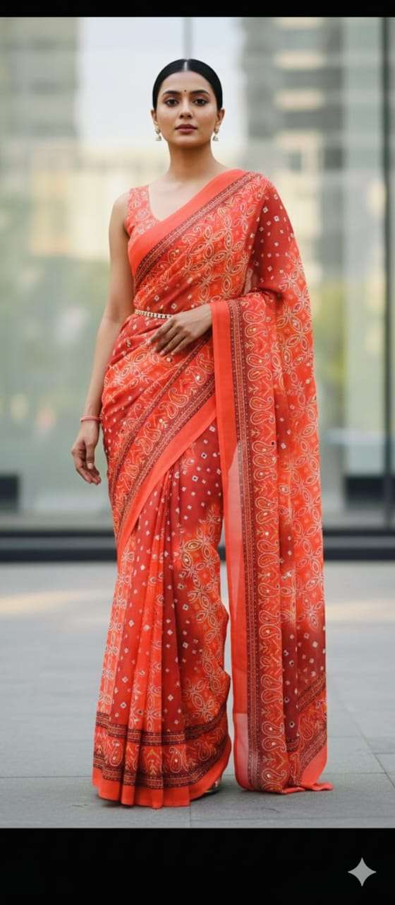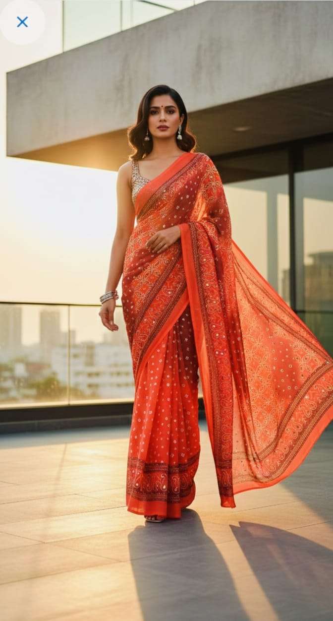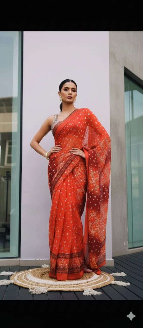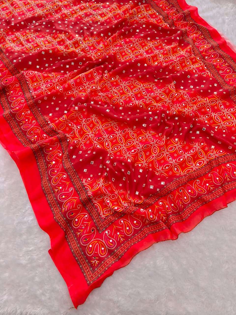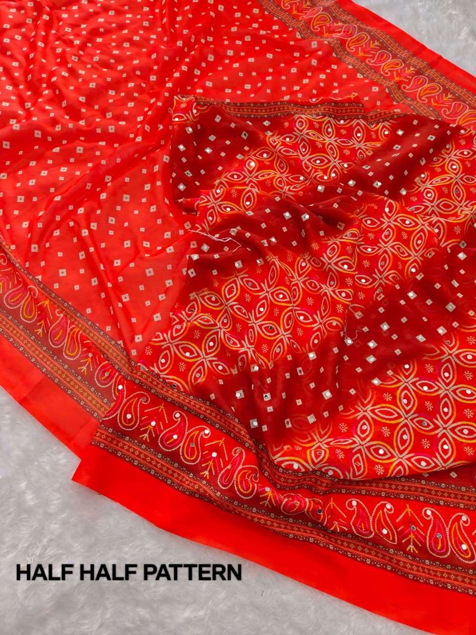 Description- Heavy Masakali fabric saree with bandhej digital print and mirror work(2500 unit) all over sarees attached with perfectly matched pallu & blouse piece