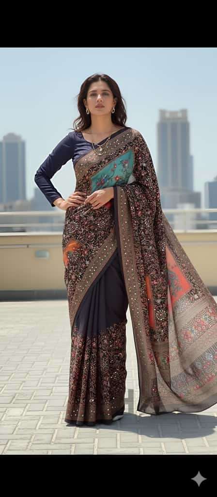 Description- Heavy Marsh mellow georgette saree with mosaic digital print and mirror work(2500 unit) all over sarees attached with perfectly matched pallu & blouse piece