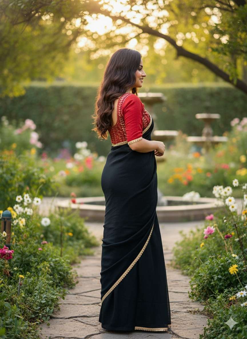 Black ELEGANT STAR GEORGETTE SAREE WITH STITCHED BLOUSE – TIMELESS BEAUTY
