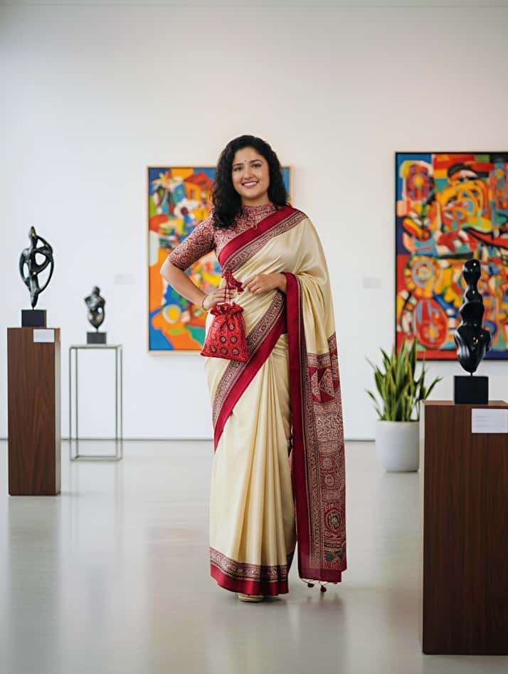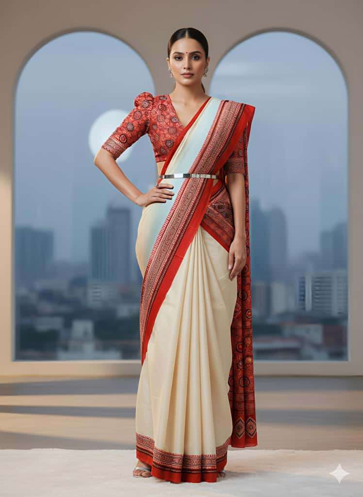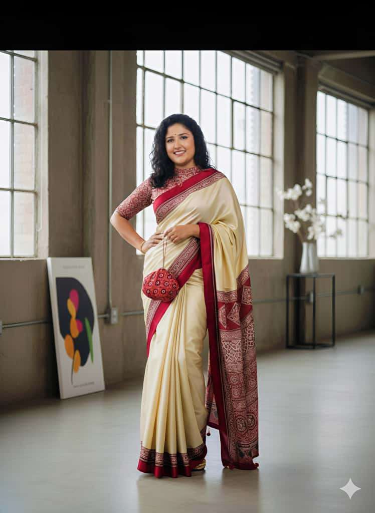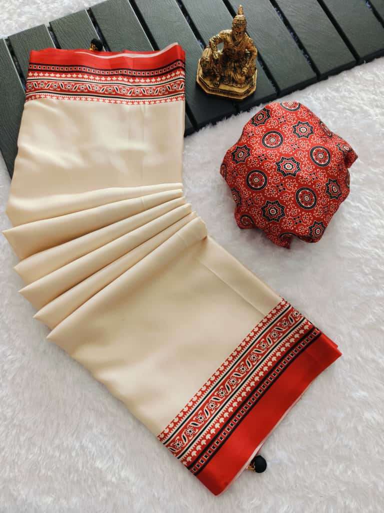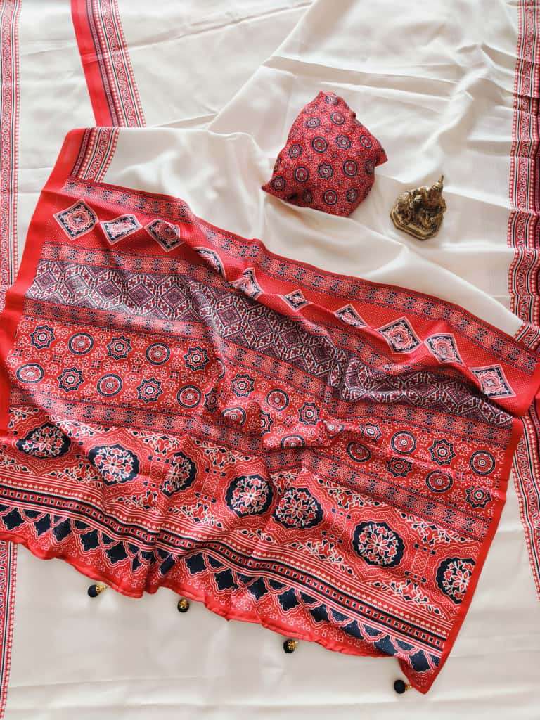 Description-Pure modal silk saree with ajrakh print all over sarees attached with perfectly matched pallu & blouse peice and heavy motif tussels