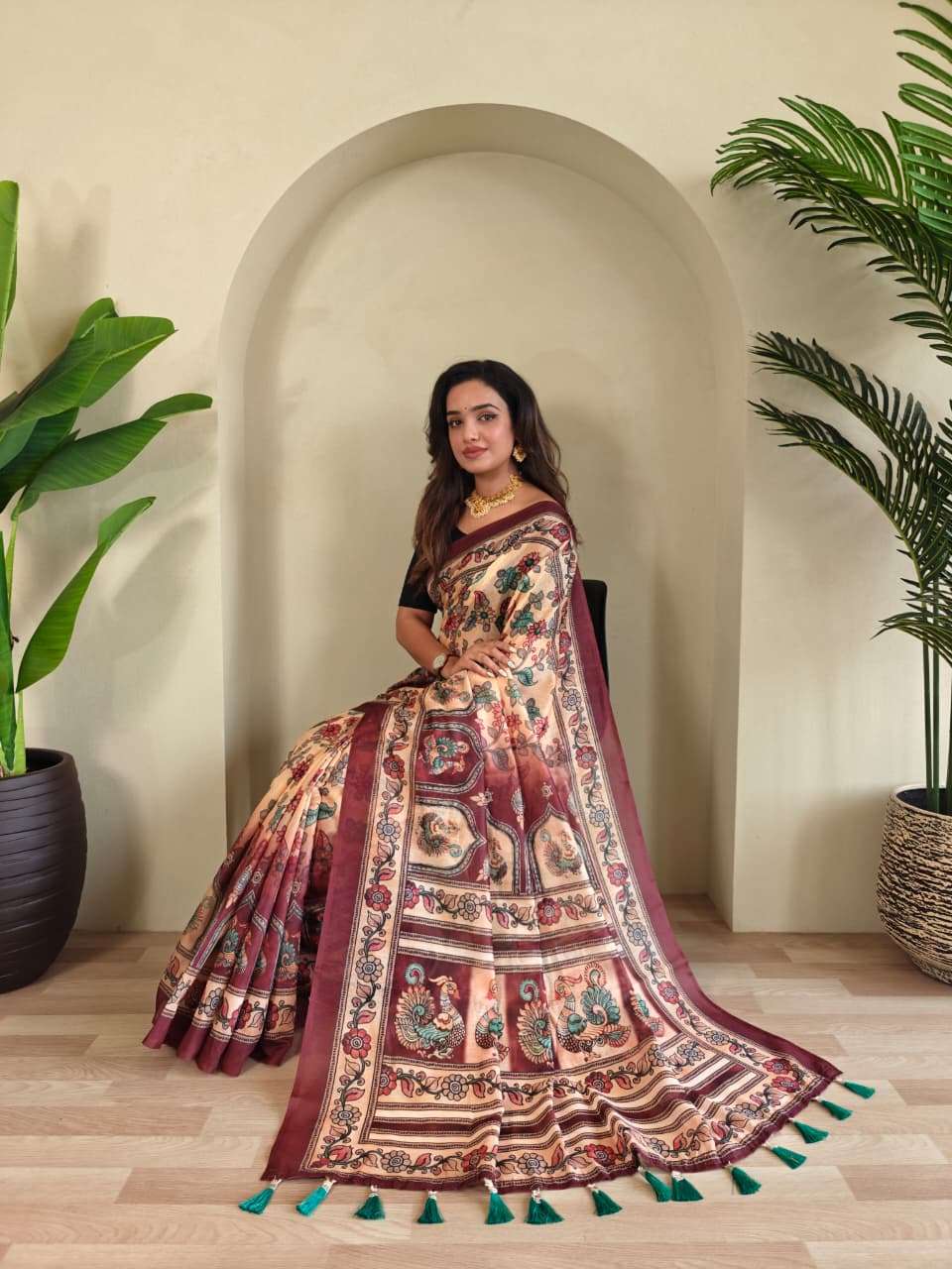 DESCRIPTION - PURE MALAI COTTON SAREE WITH BIG BORDER DIGITAL PRINT CONCEPT WITH ELEGANT KALAMKARI PATTERNS WITH CONTRAST BIG PALLU WITH TASSELS ATTACHED