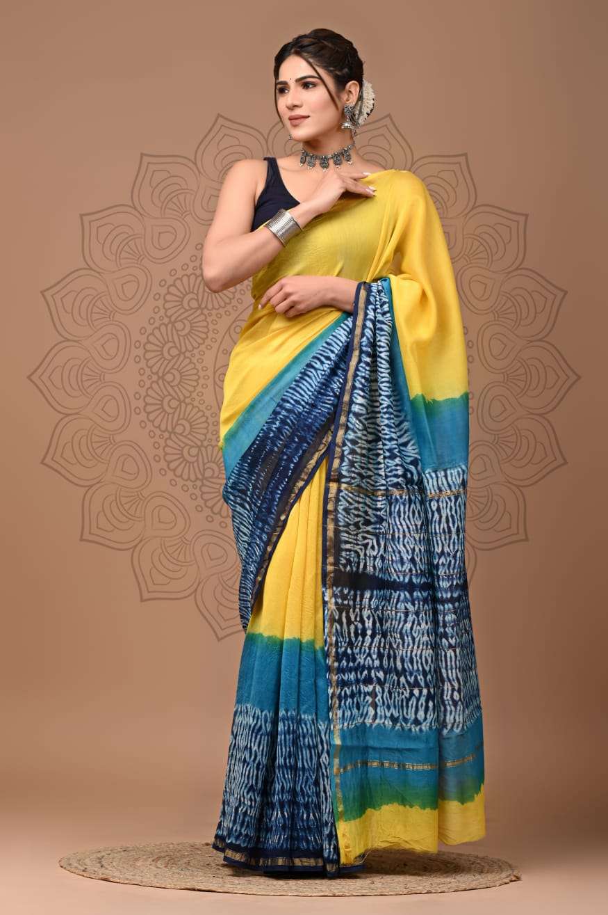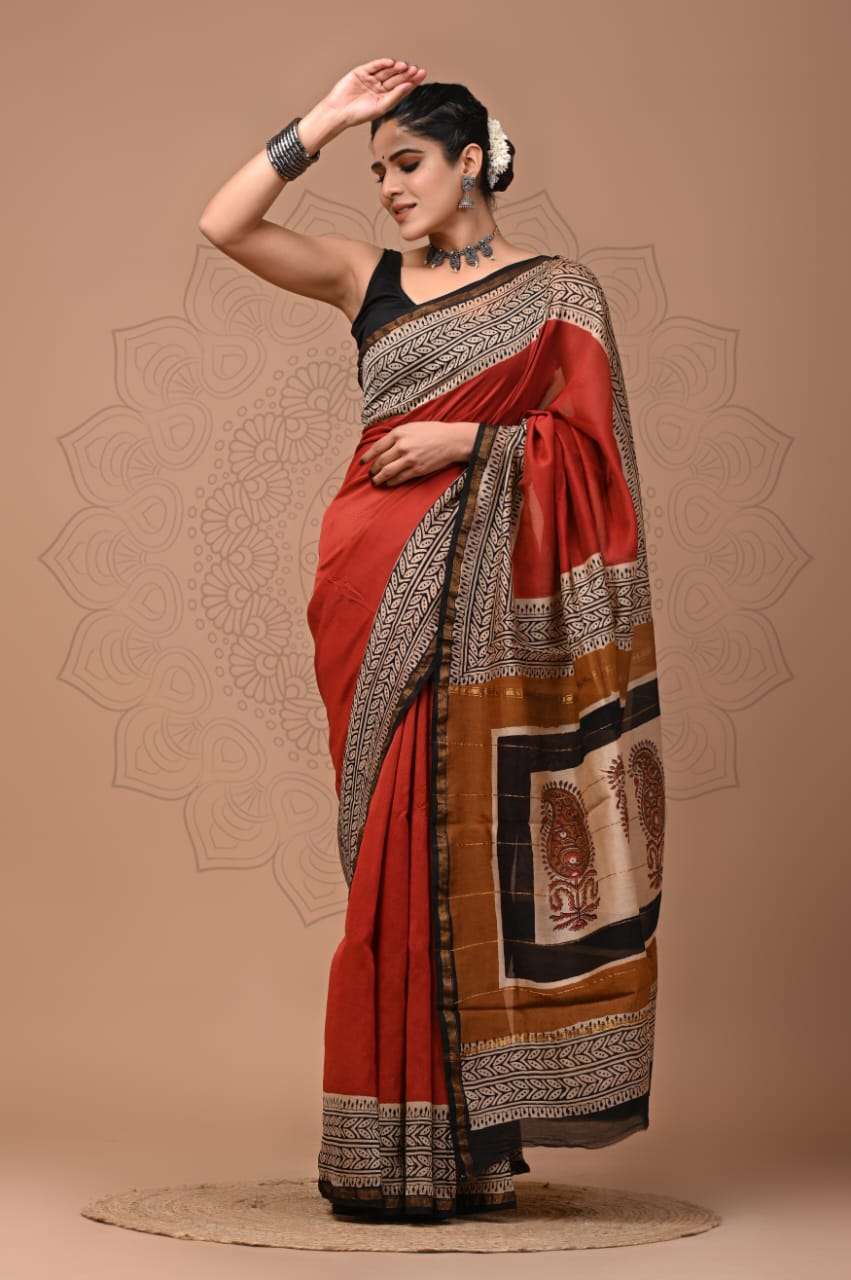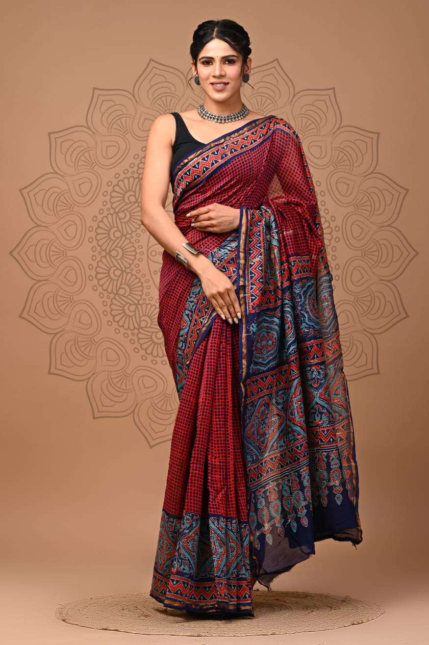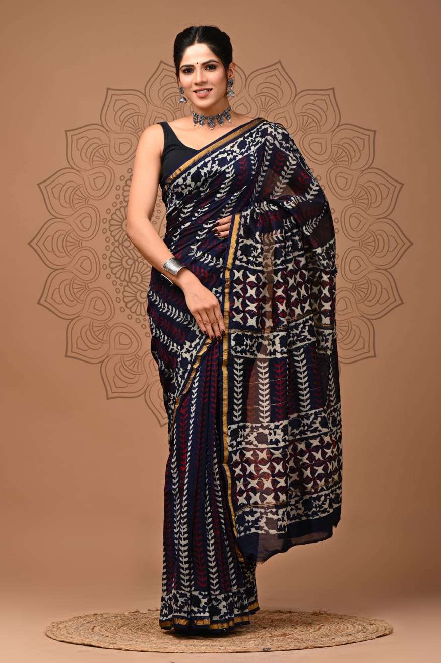 Explore our exquisite hand block printed Chanderi silk sarees with matching blouse pieces. Crafted with natural dyes and colors, these sarees feature fine-quality fabric and timeless elegance.