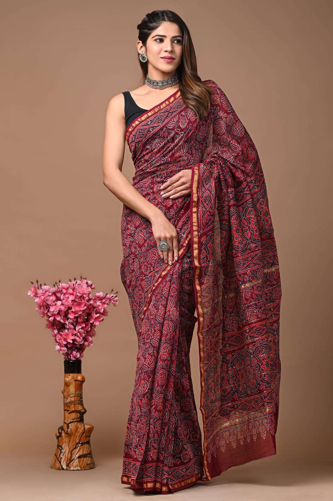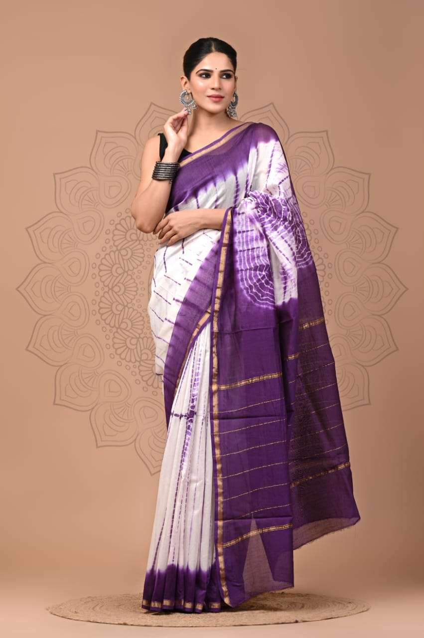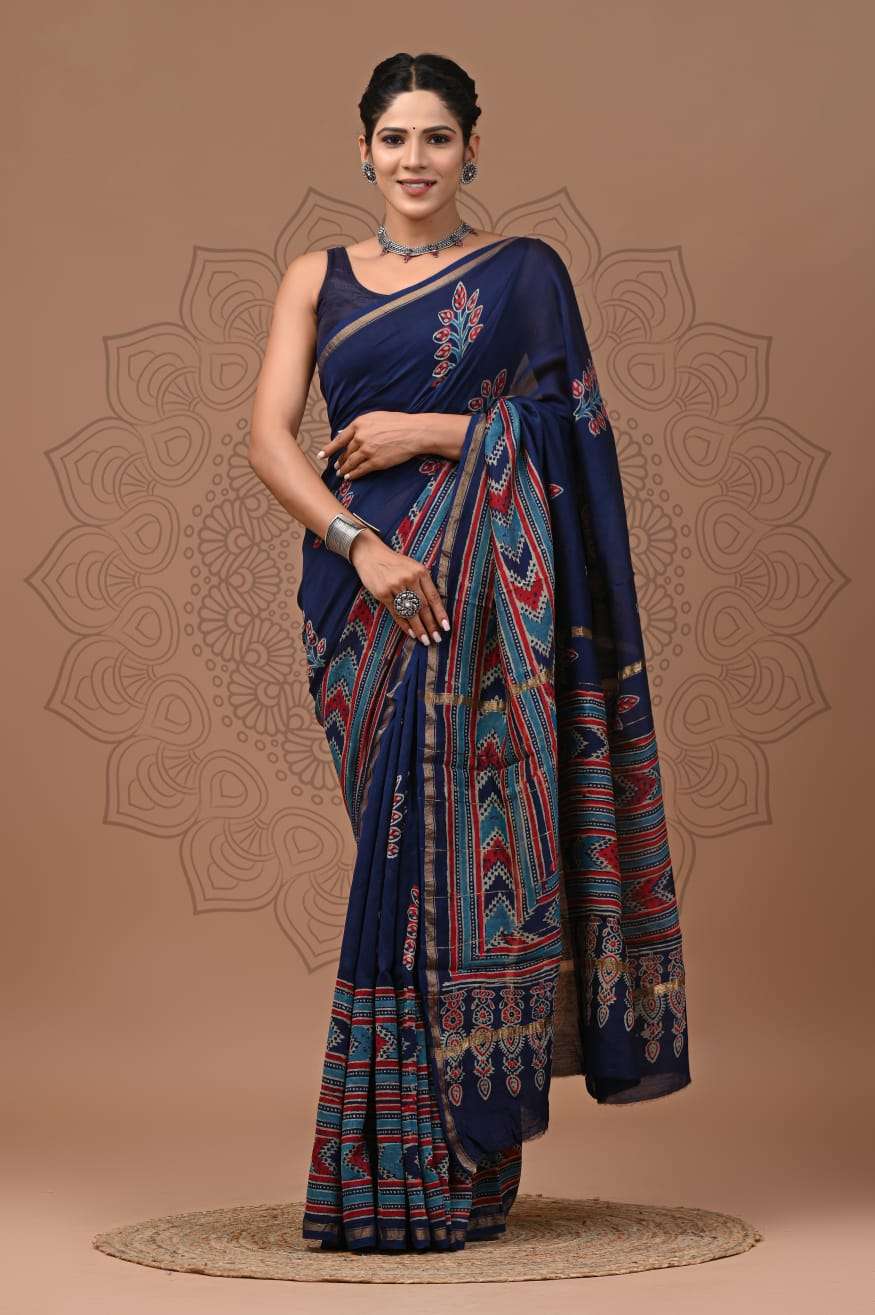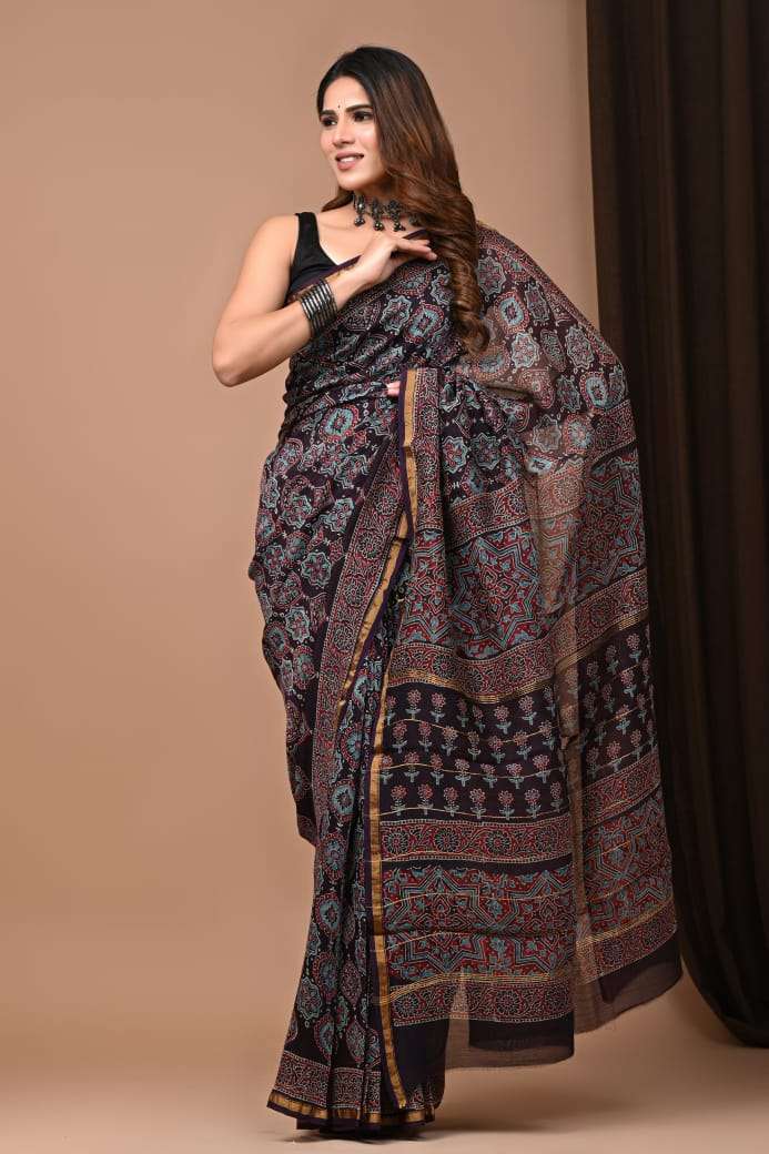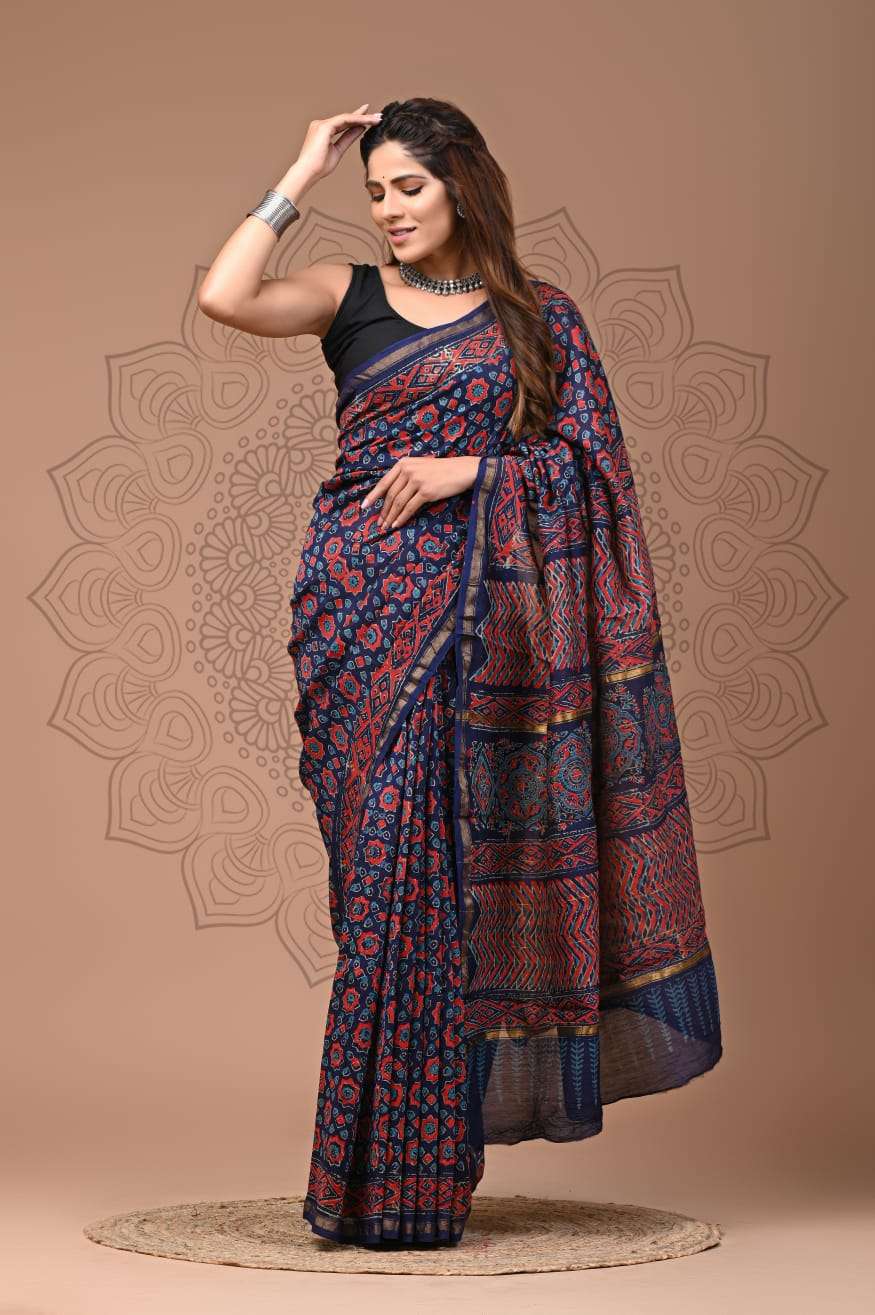 Explore our exquisite hand block printed Chanderi silk sarees with matching blouse pieces. Crafted with natural dyes and colors, these sarees feature fine-quality fabric and timeless elegance.