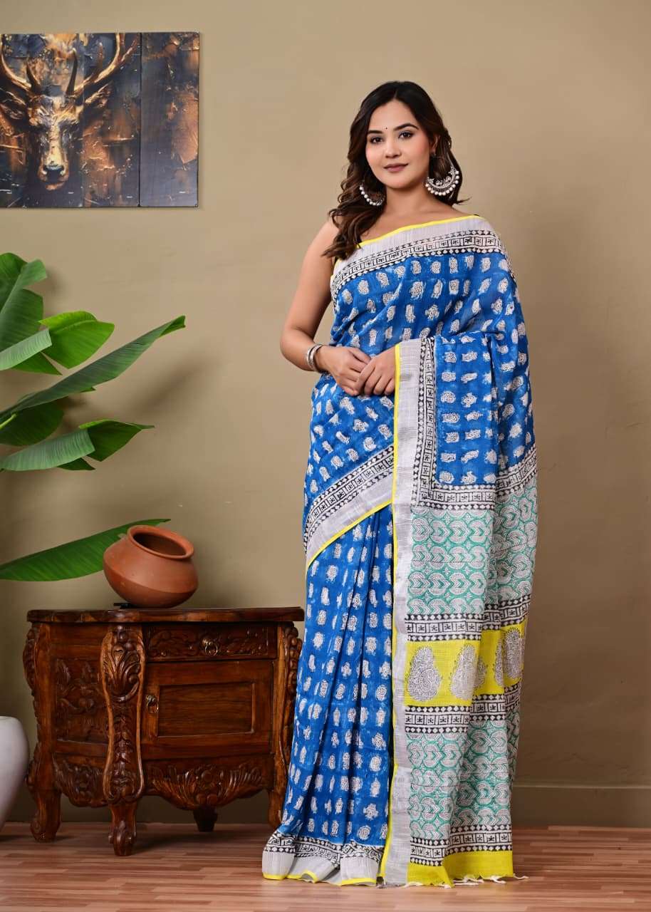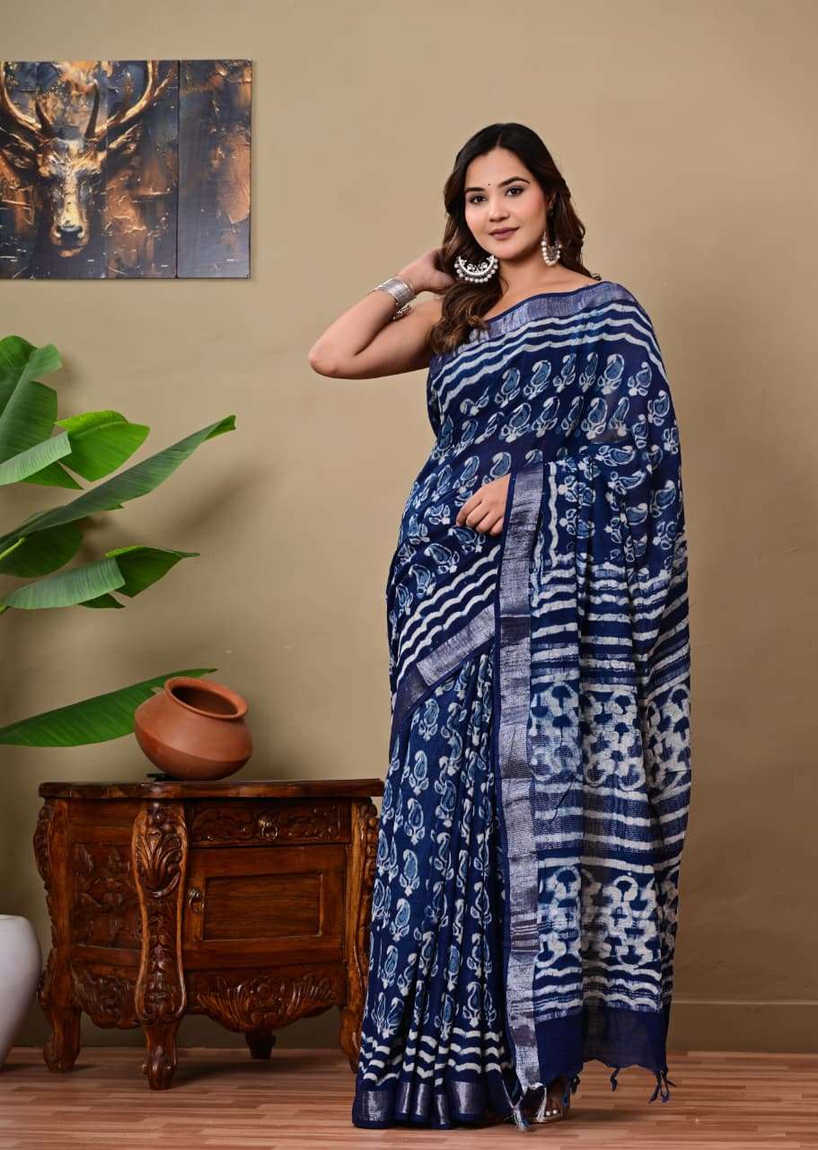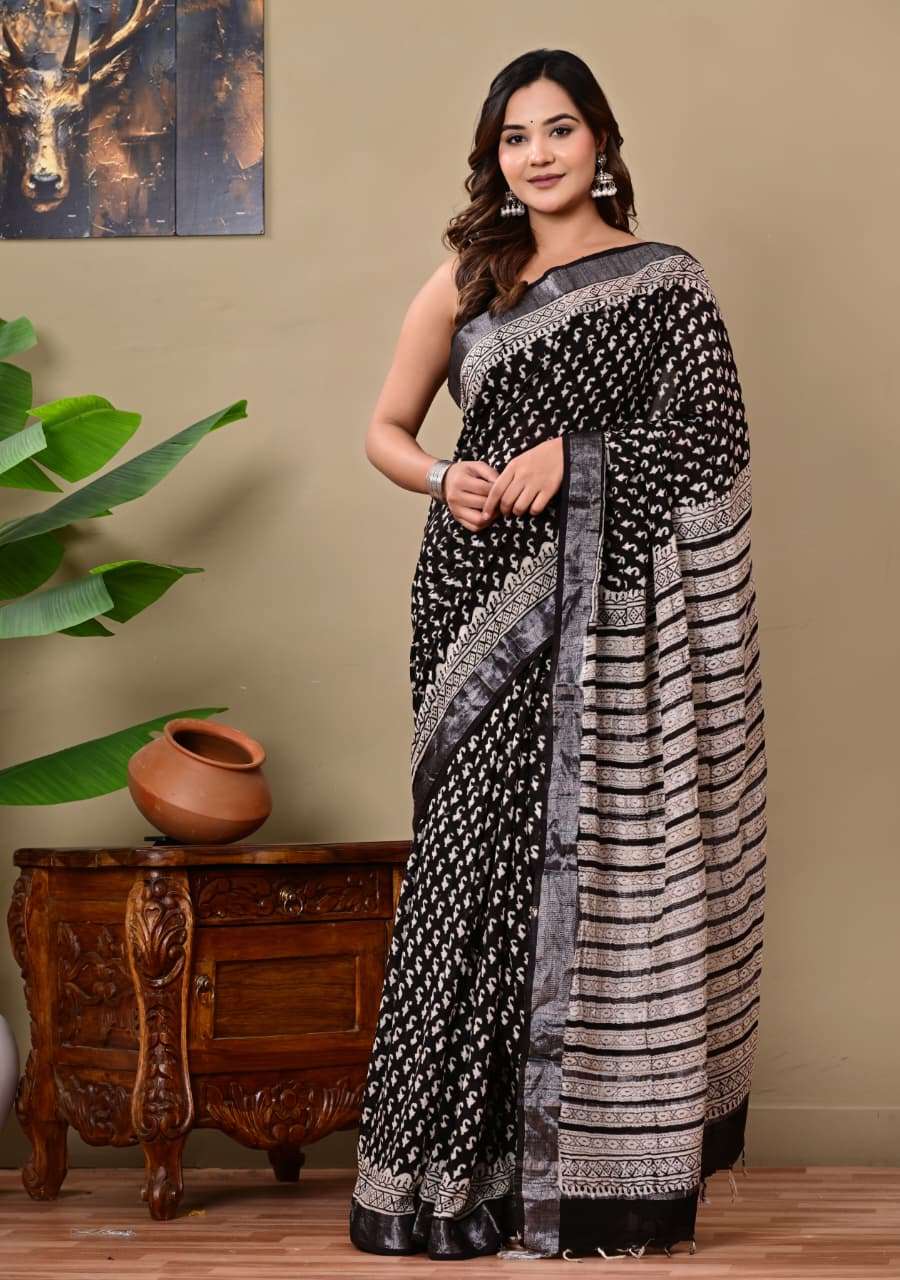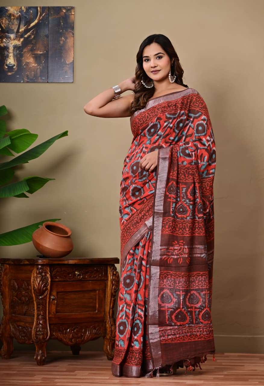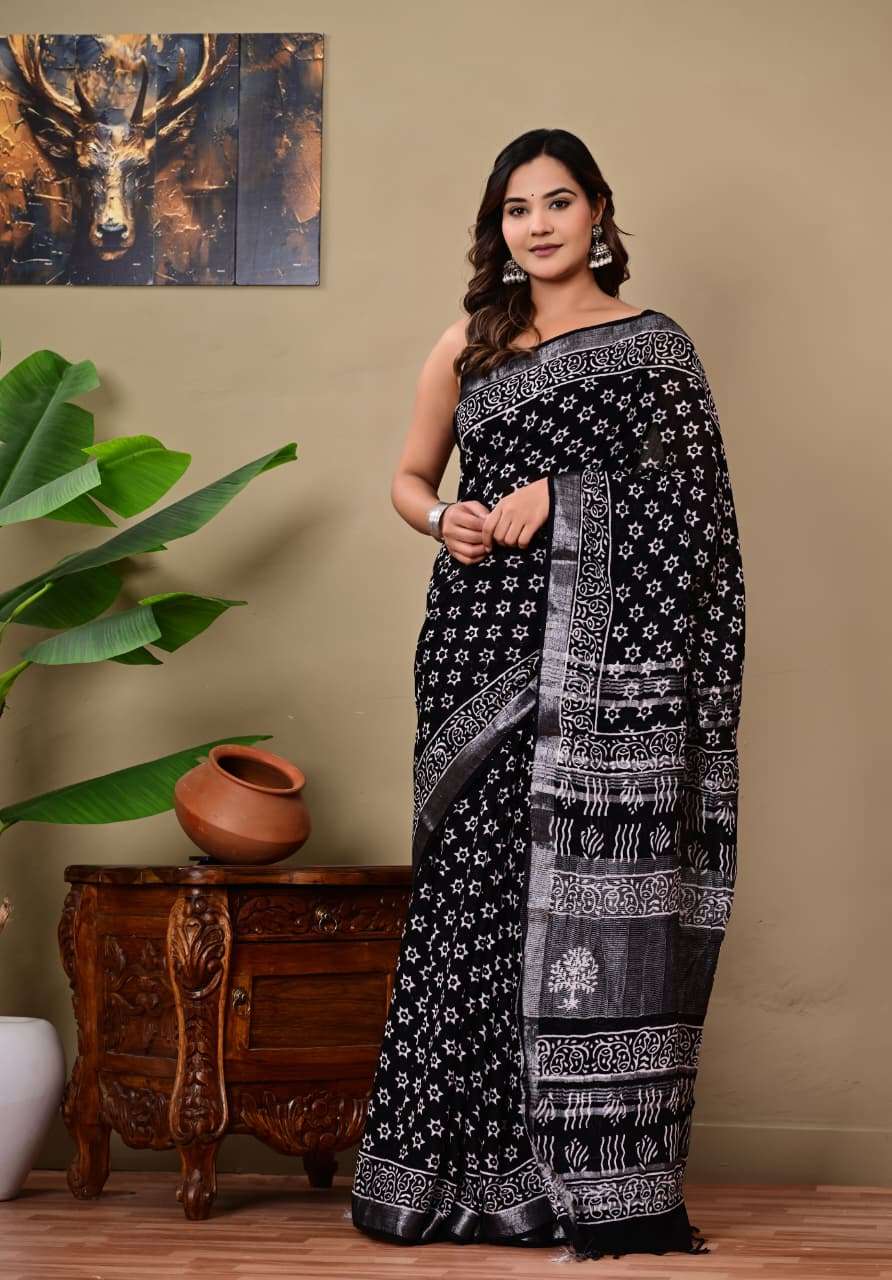 | Catalogue: | Shri Balaji Emporium RF 18852 Bagru Hand Block Printed Linen Saree |