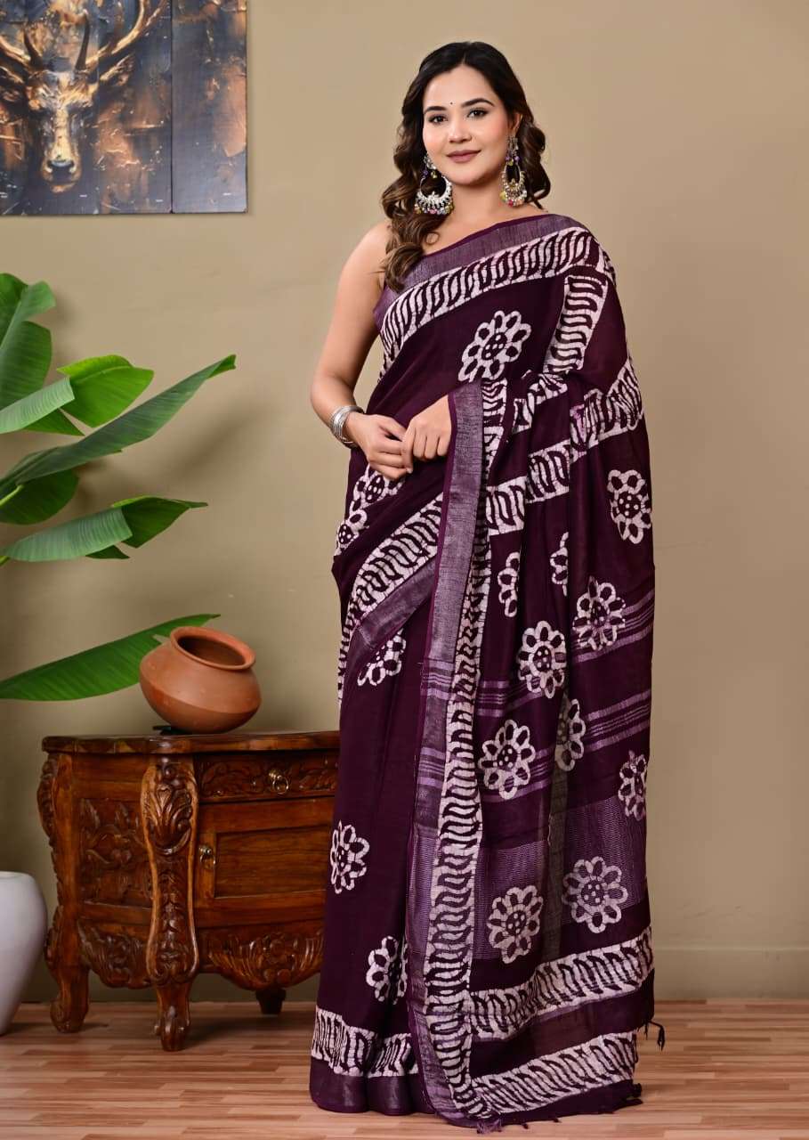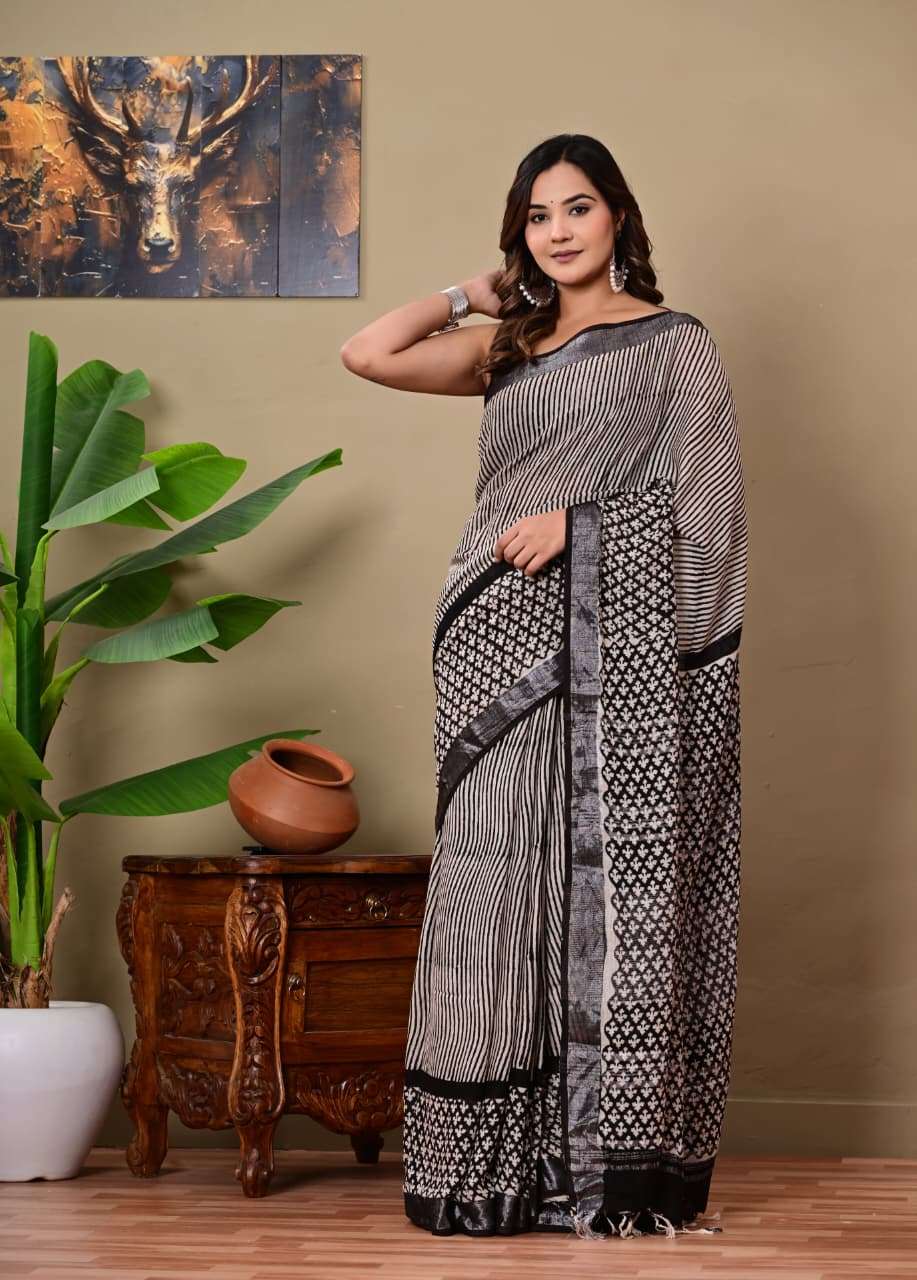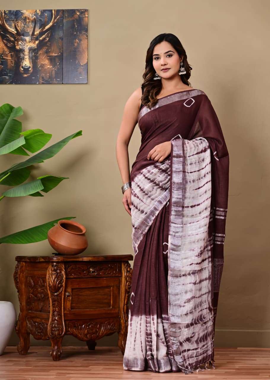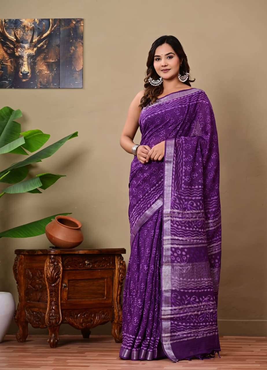 | Catalogue: | Shri Balaji Emporium RF 18852 Bagru Hand Block Printed Linen Saree |