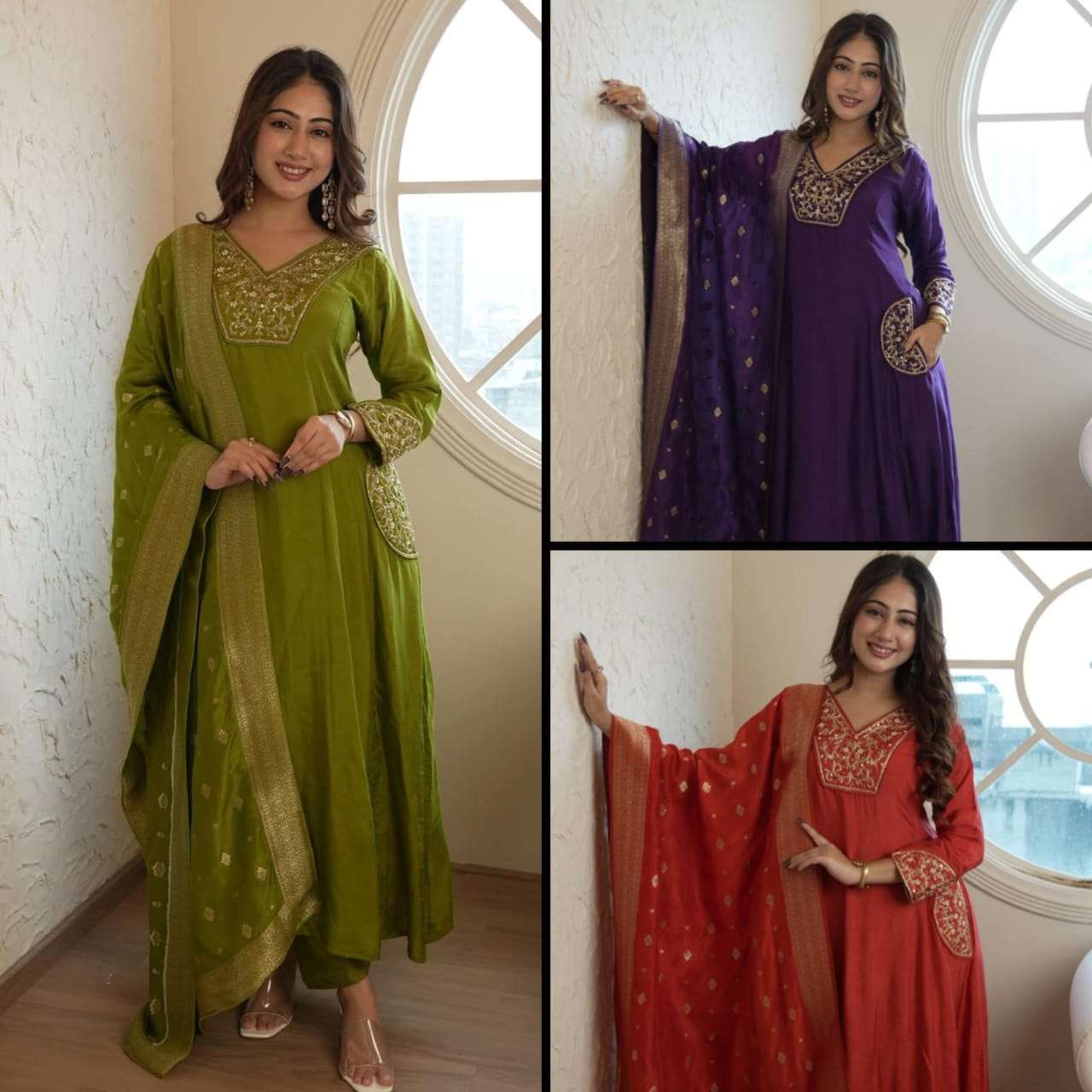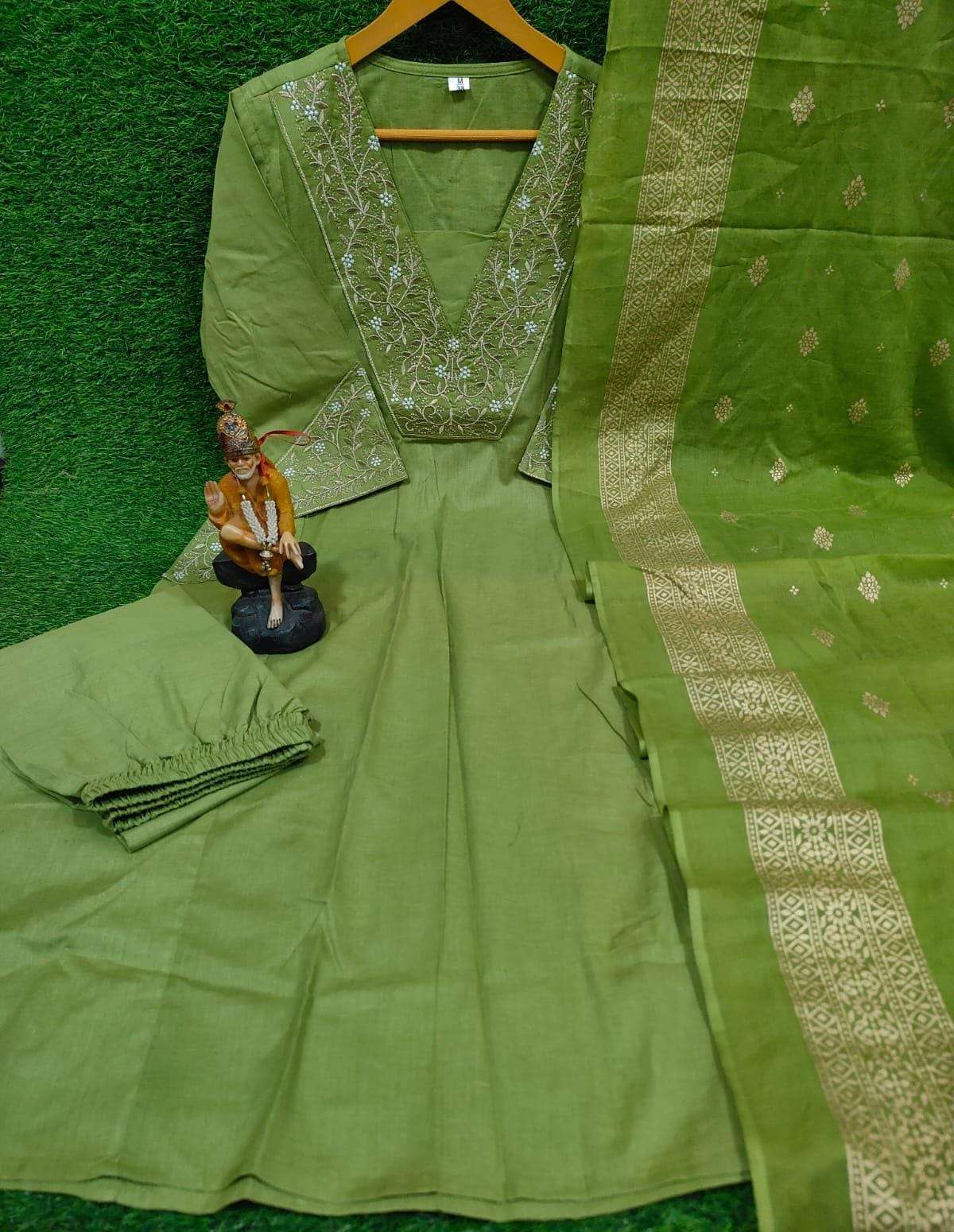Featuring beautiful Heavy COTTON Suit Set which is beautifully decorated with intricate embroidery work, Zari weaving . It is paired with matching pants and gold printed Dupatta.