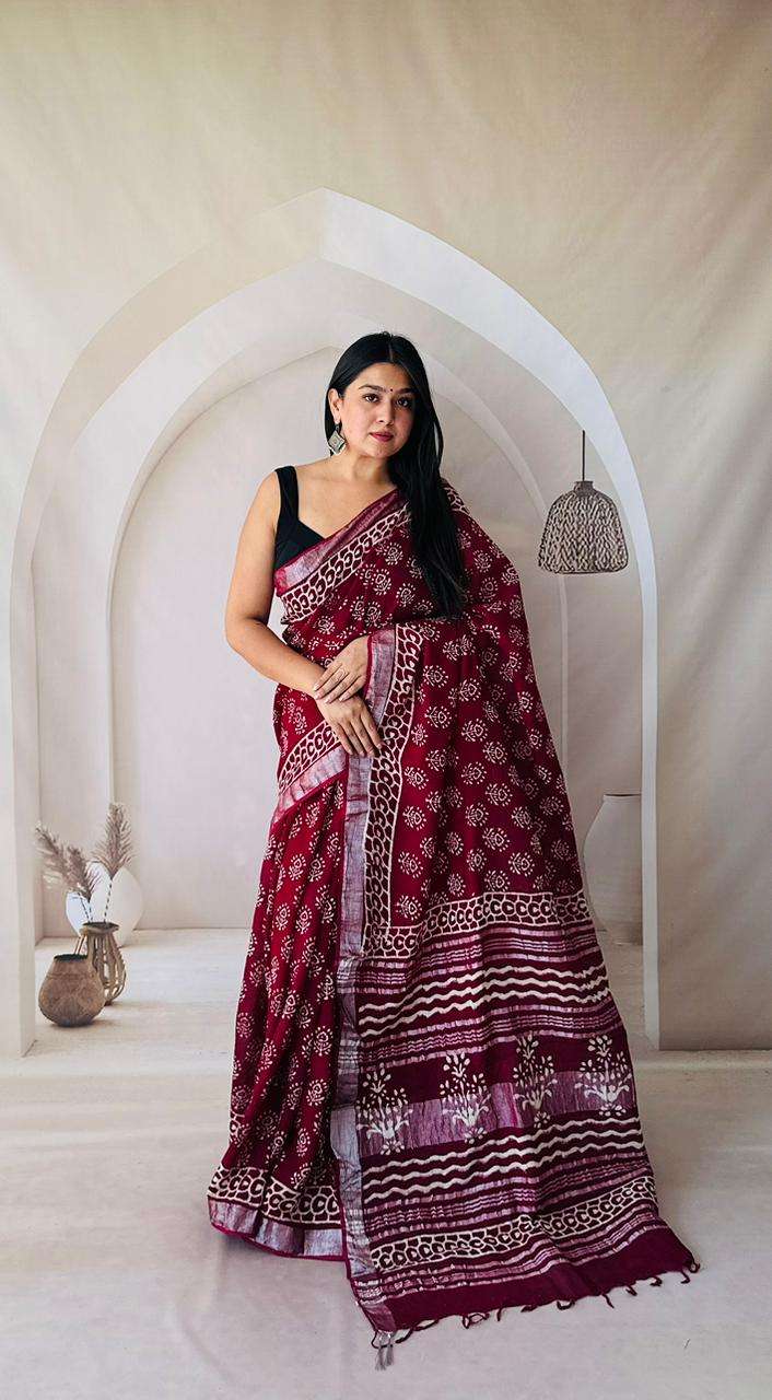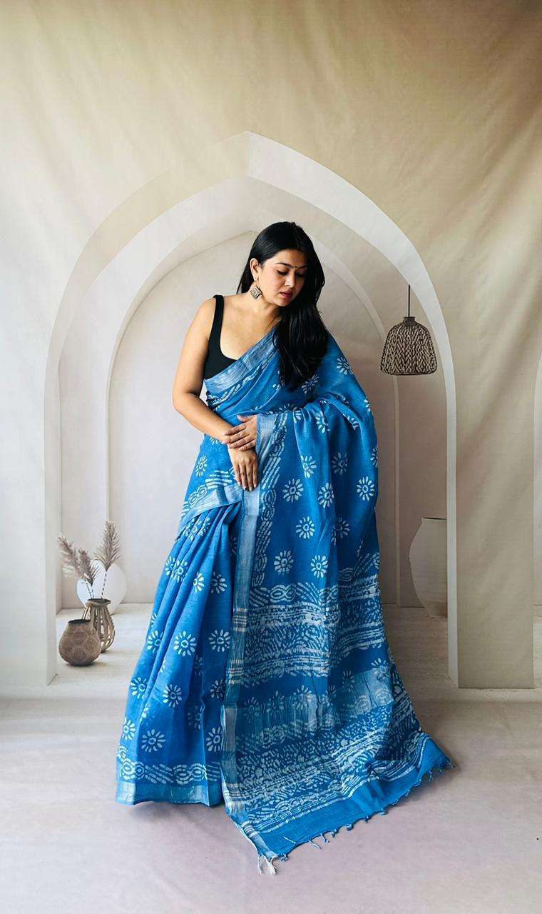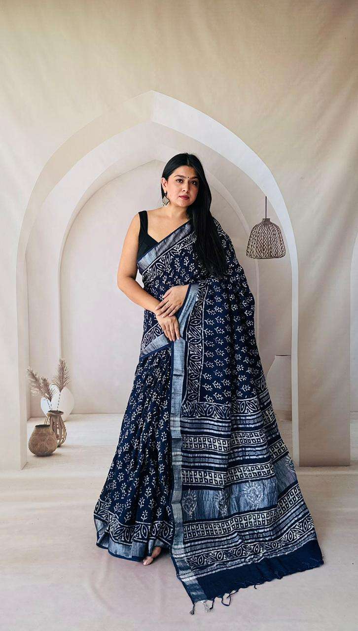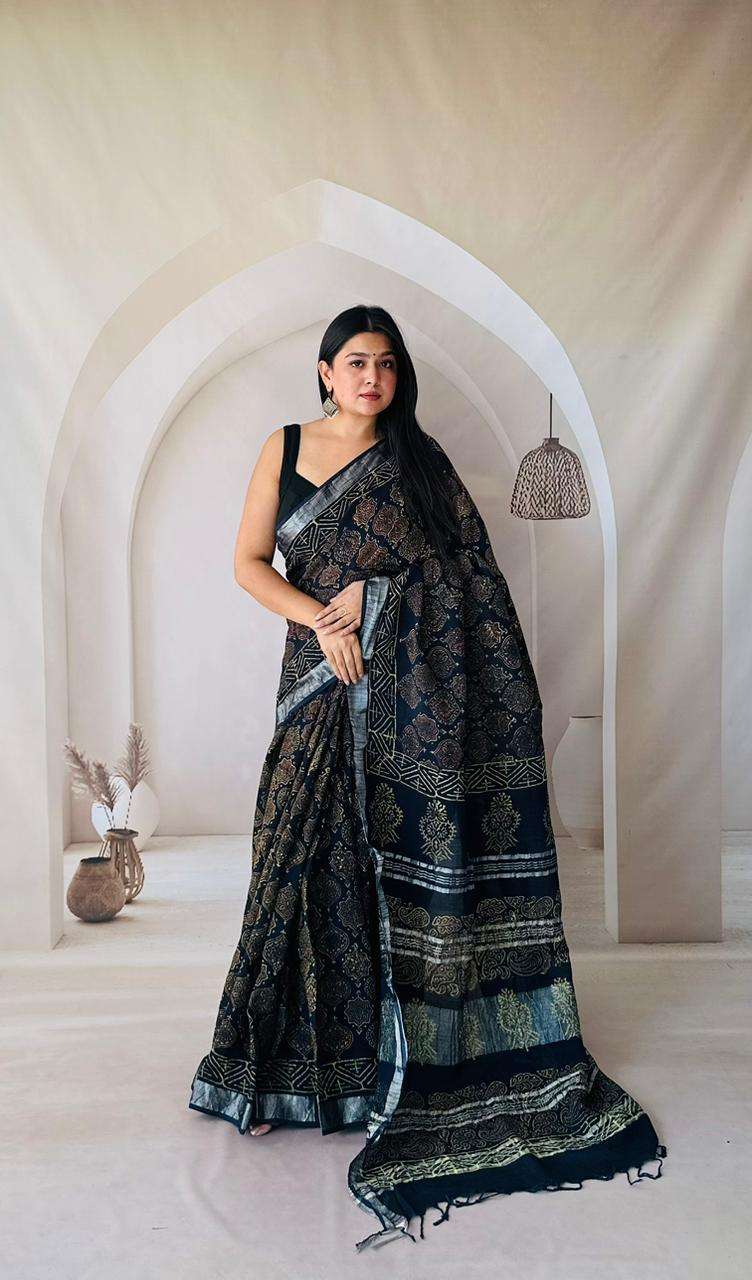 | Catalogue: | Shri Balaji Emporium RF 19032 Bagru Hand Block Printed Linen Saree |