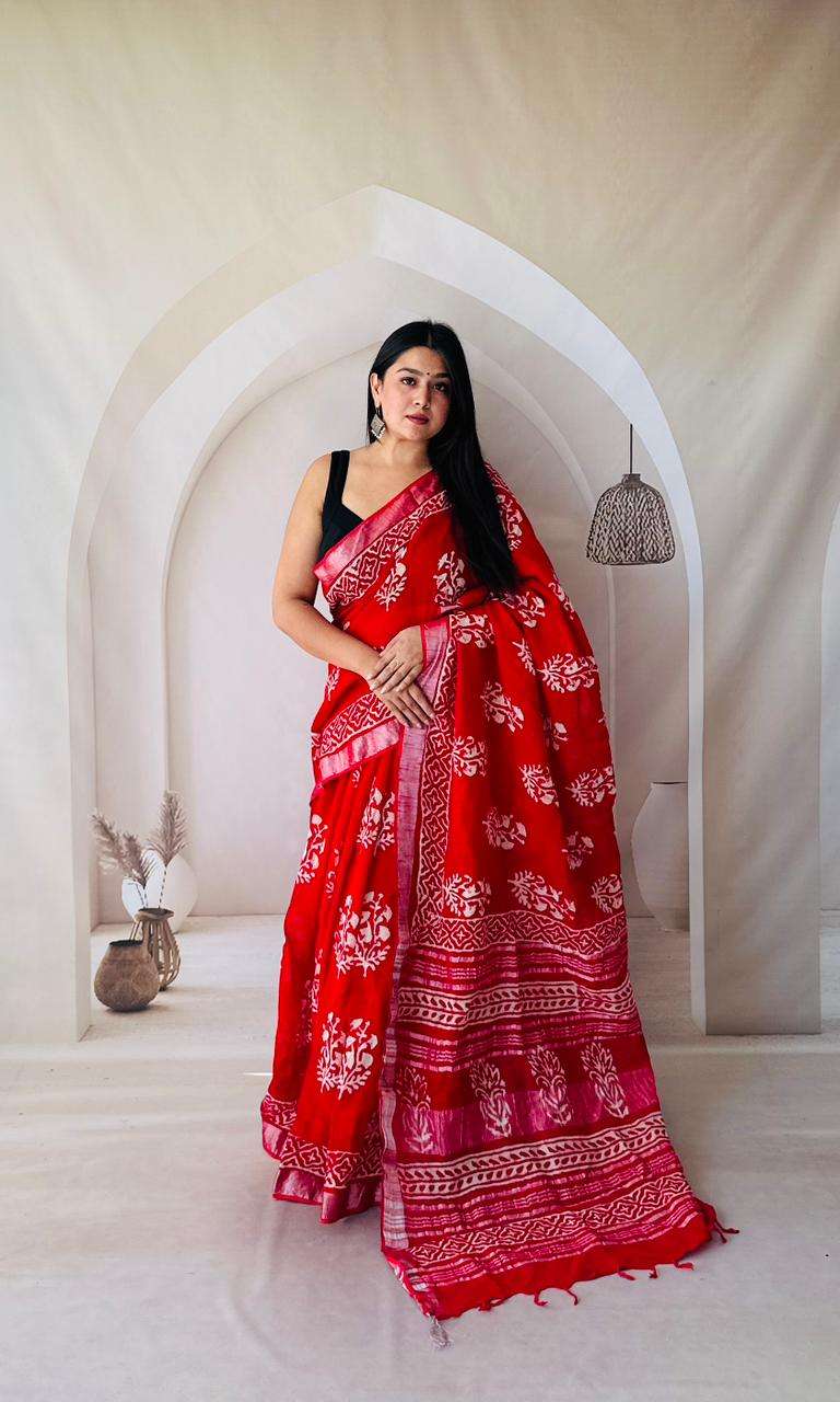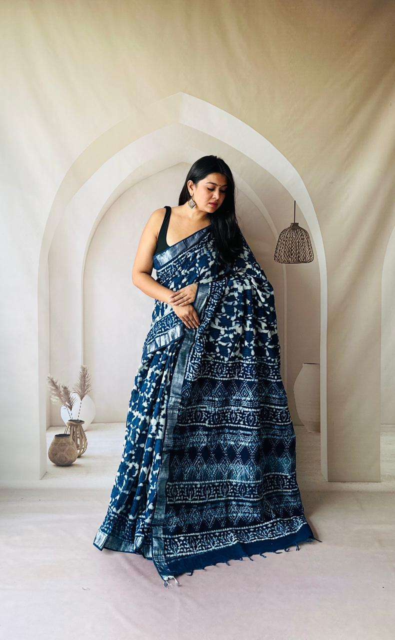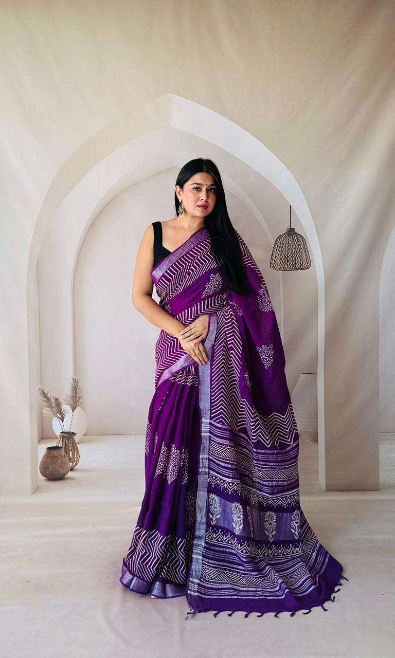 | Catalogue: | Shri Balaji Emporium RF 19032 Bagru Hand Block Printed Linen Saree |