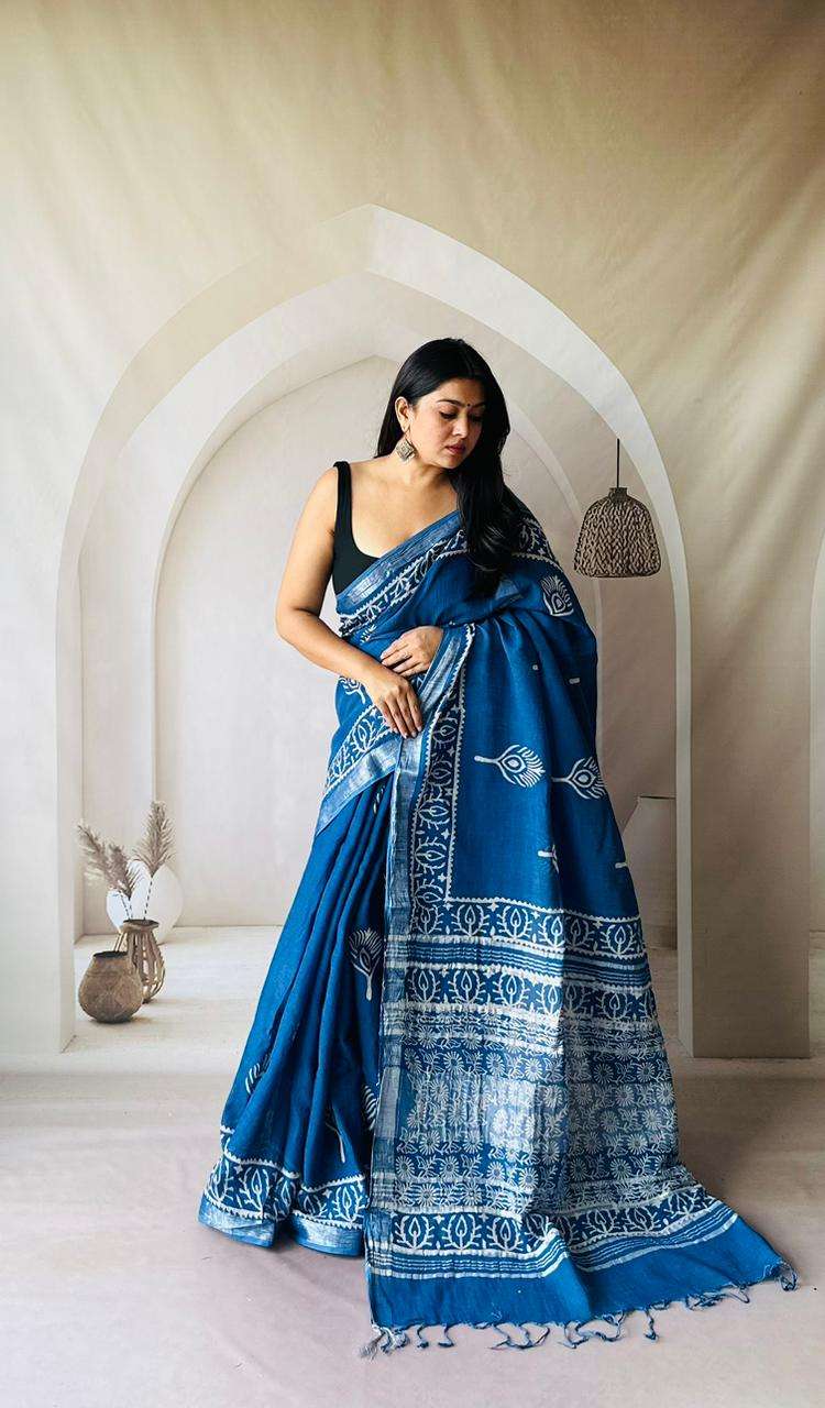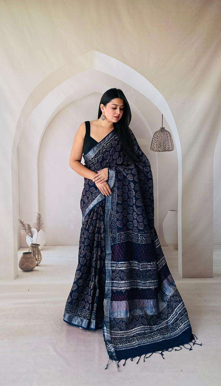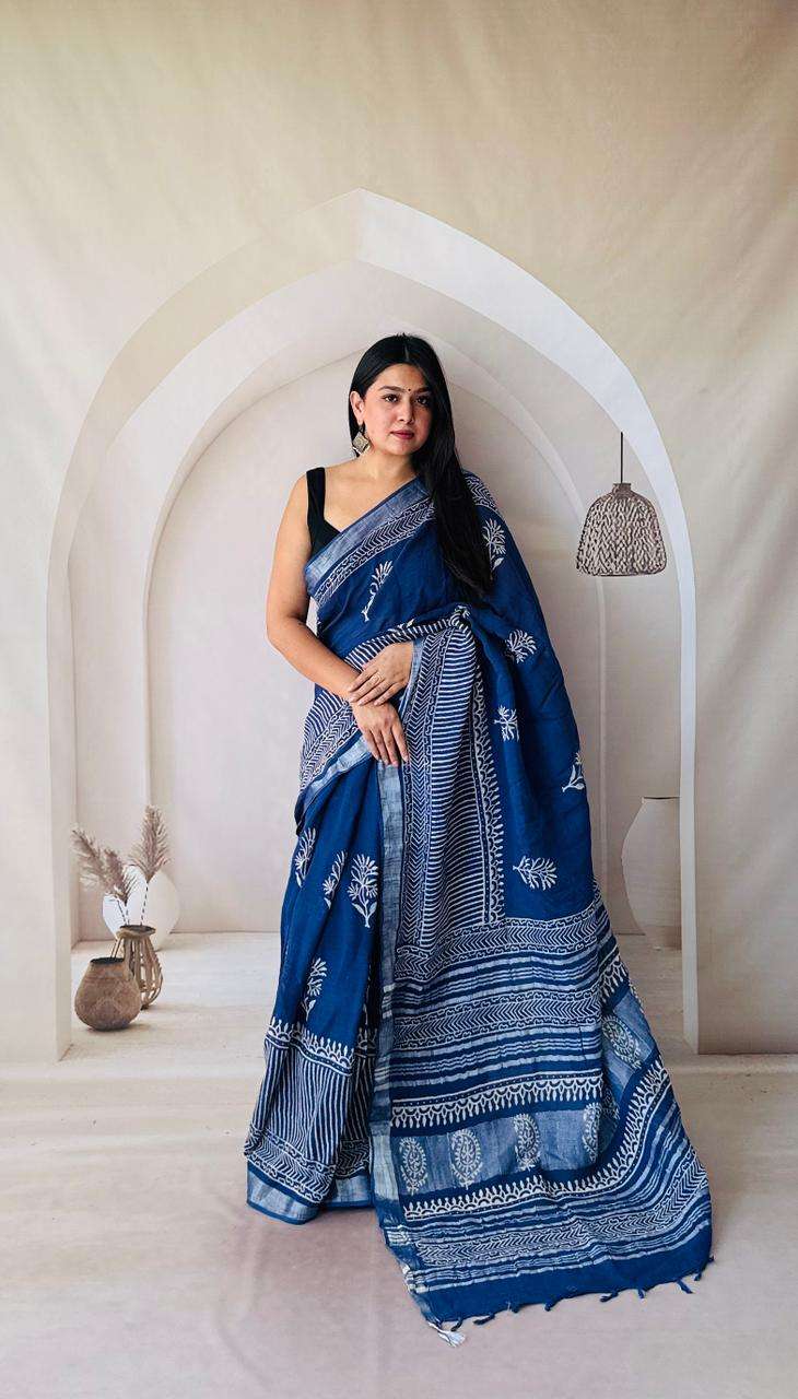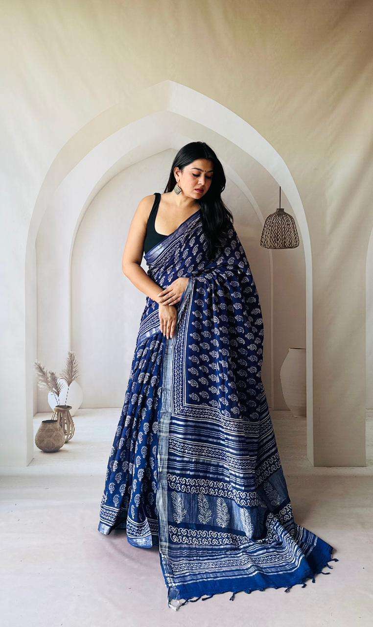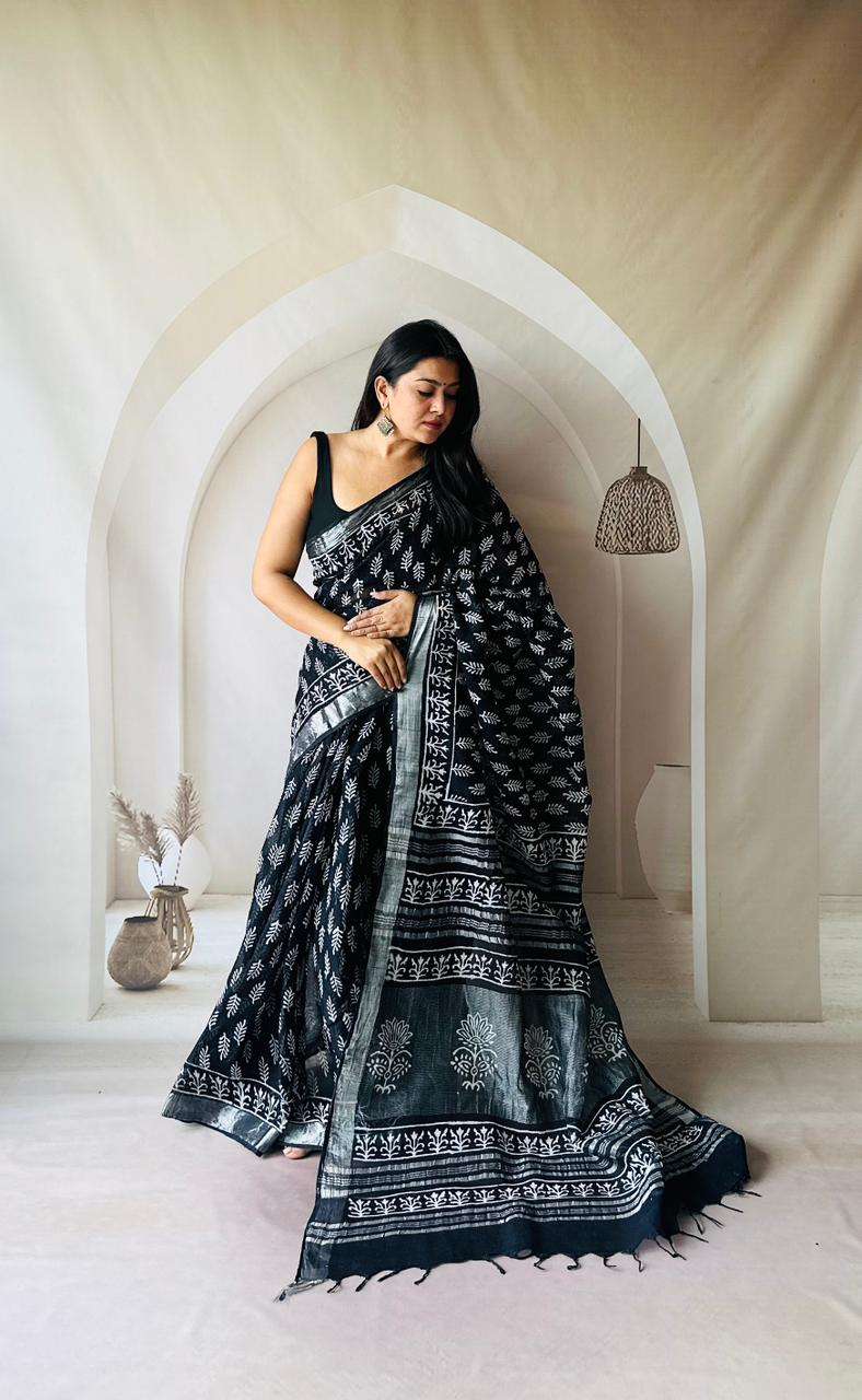 | Catalogue: | Shri Balaji Emporium RF 19032 Bagru Hand Block Printed Linen Saree |