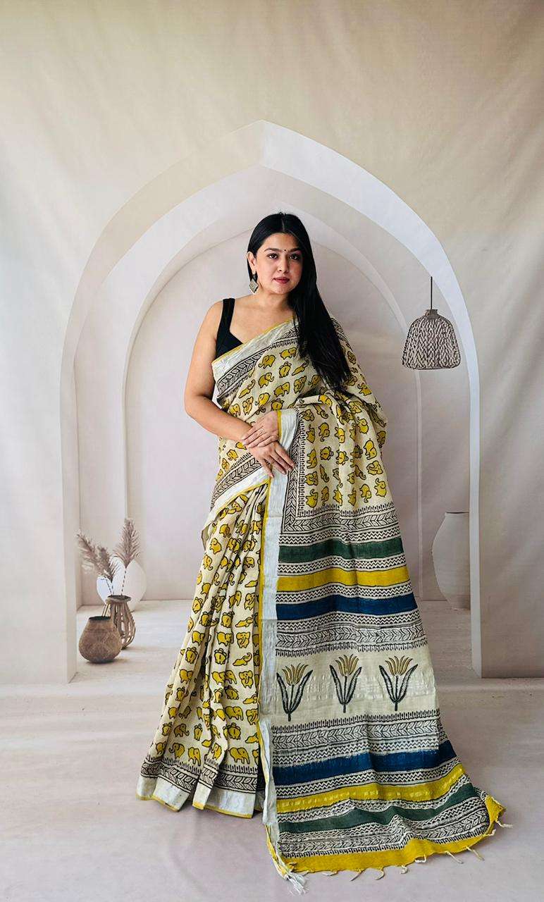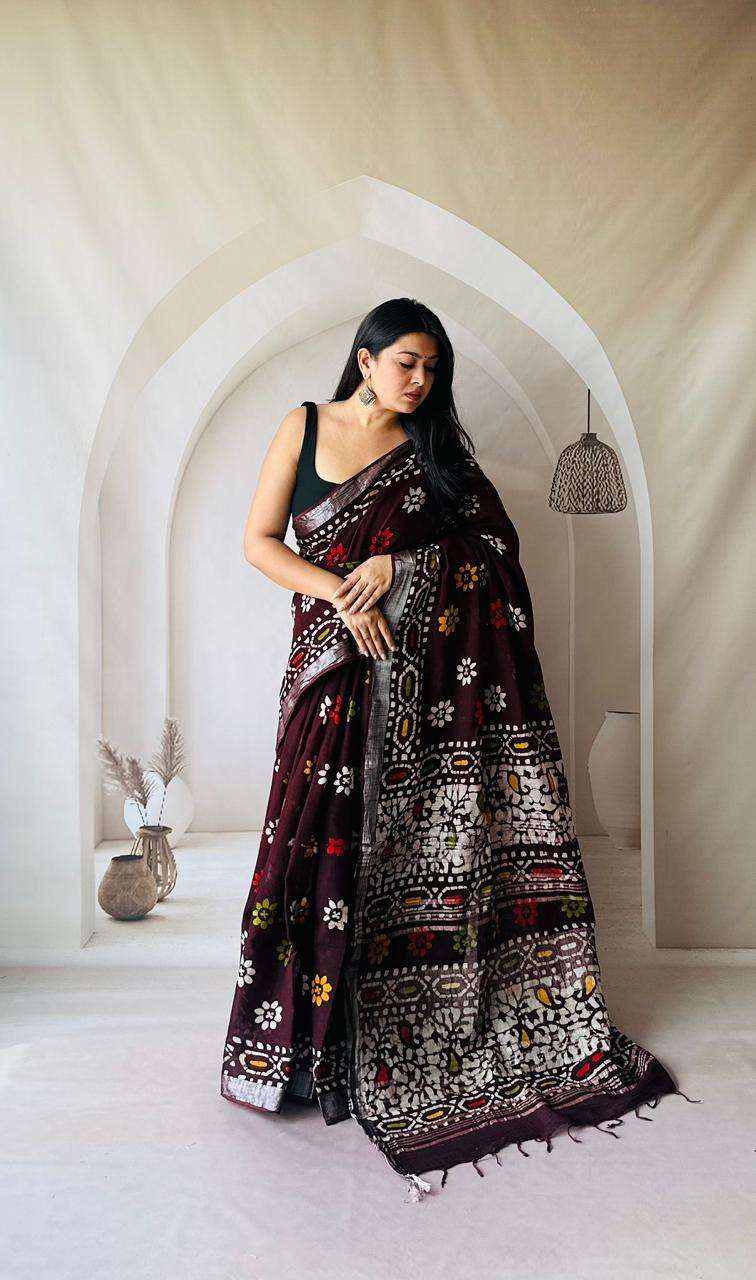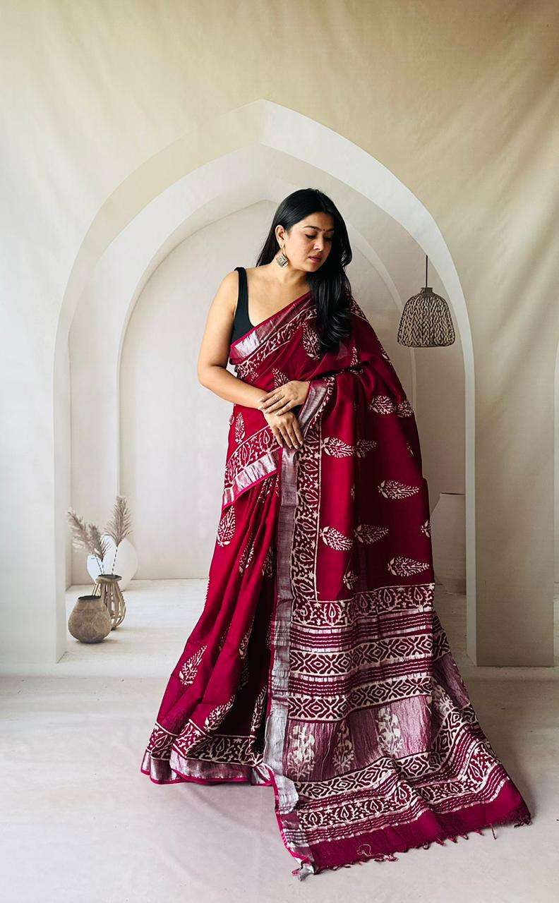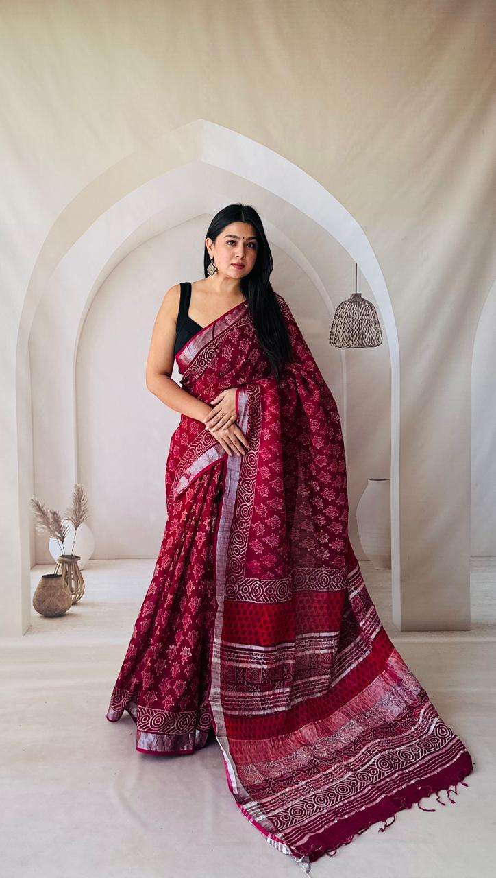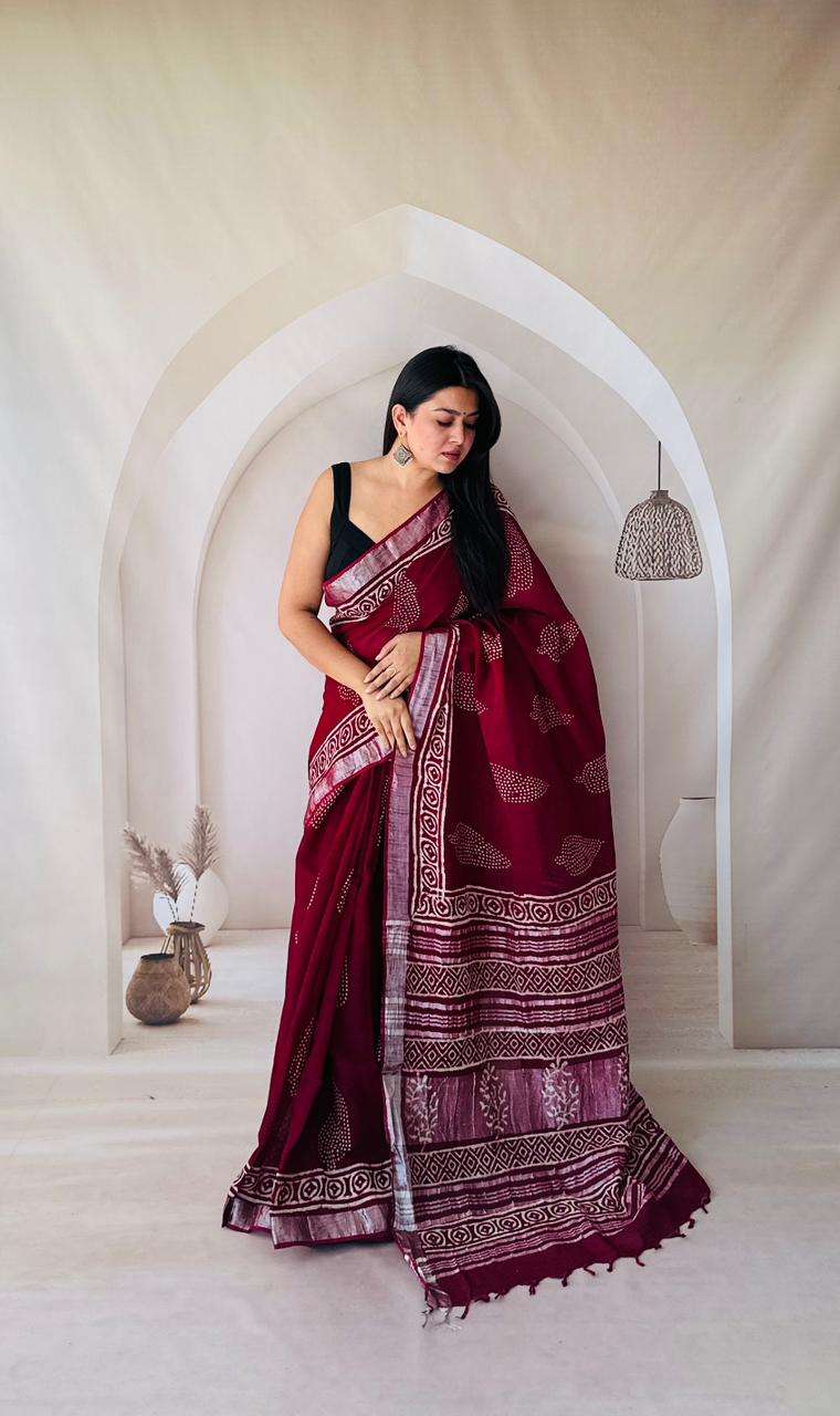 | Catalogue: | Shri Balaji Emporium RF 19032 Bagru Hand Block Printed Linen Saree |