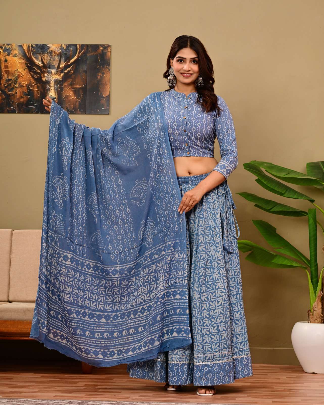 Bagru Hand Block Printed Designer Top & Skirt With Mulmul Dupatta.