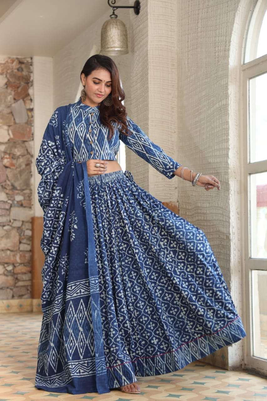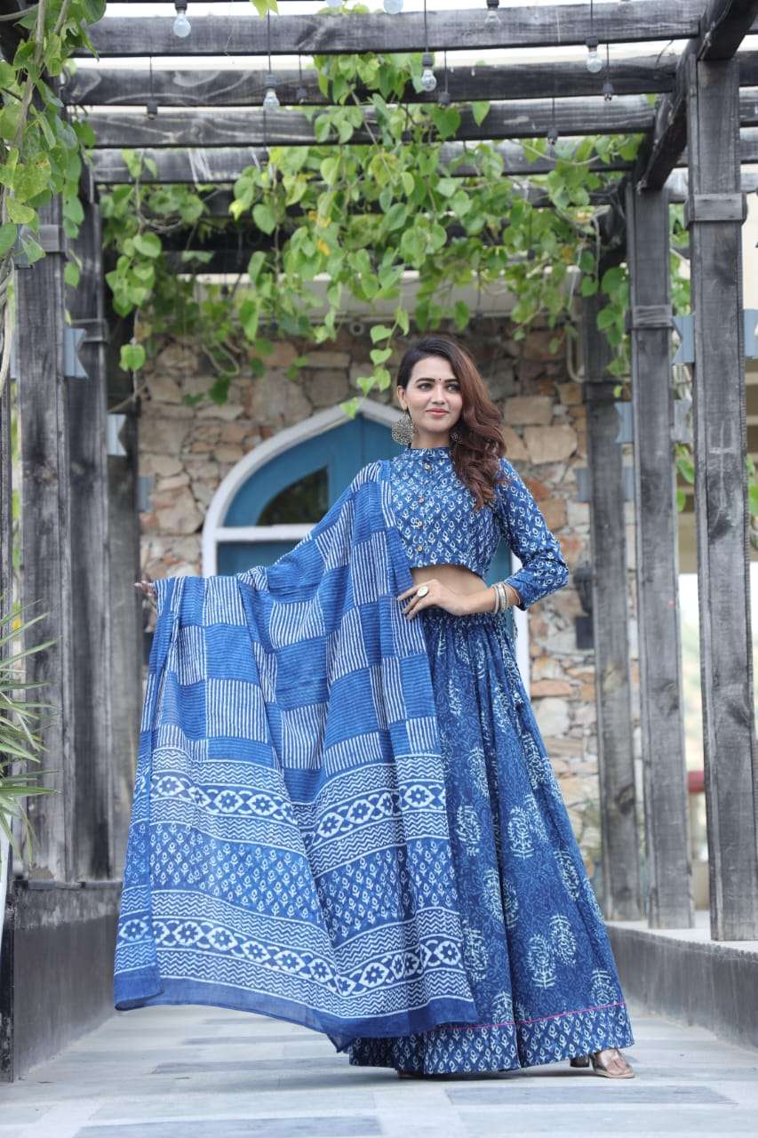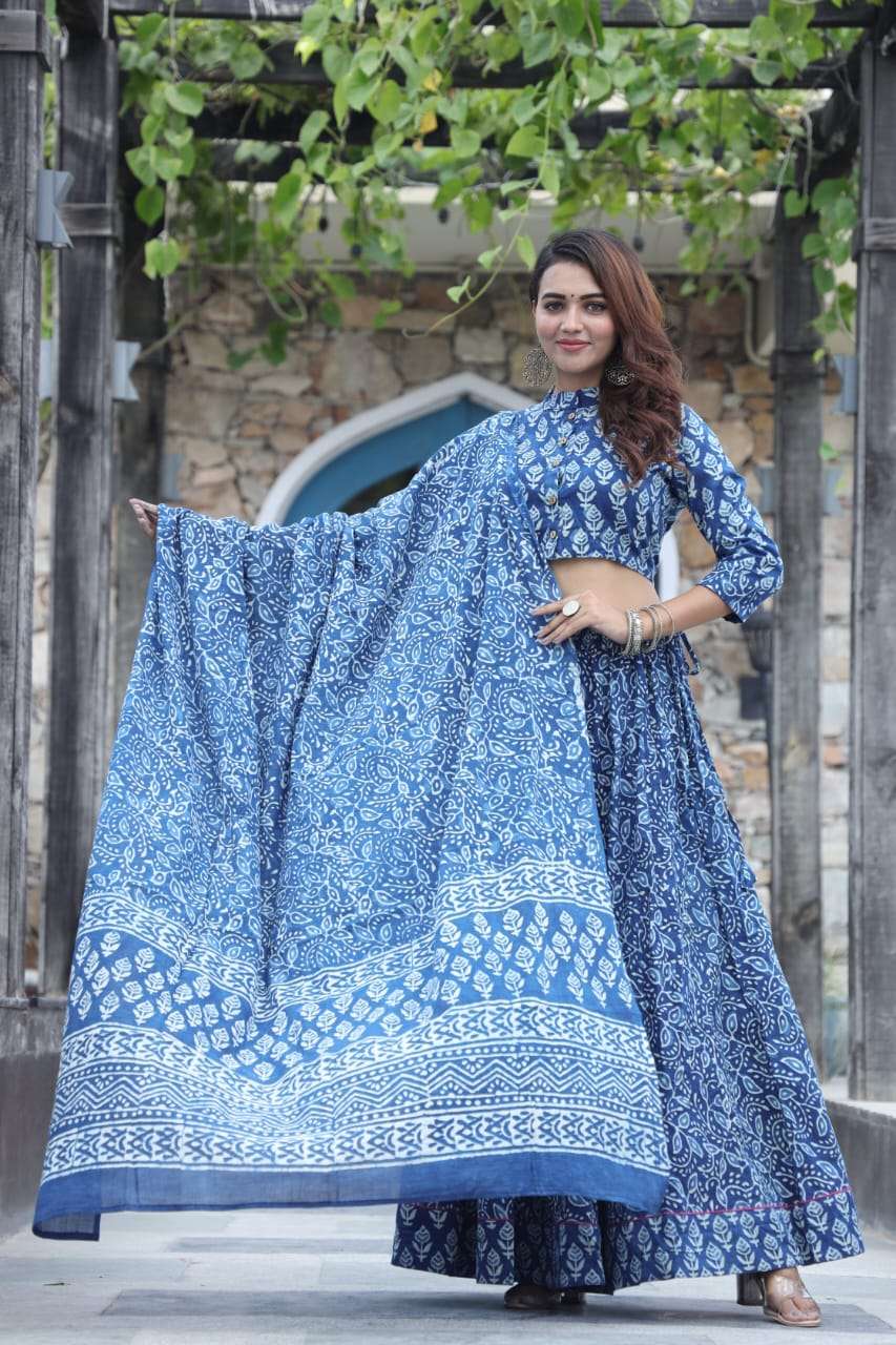 Bagru Hand Block Printed Designer Top & Skirt With Mulmul Dupatta.