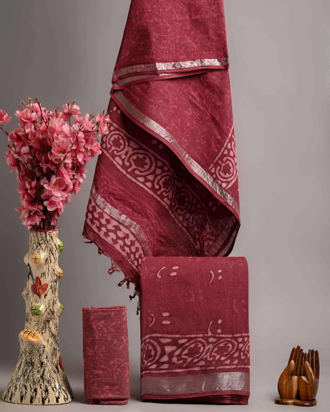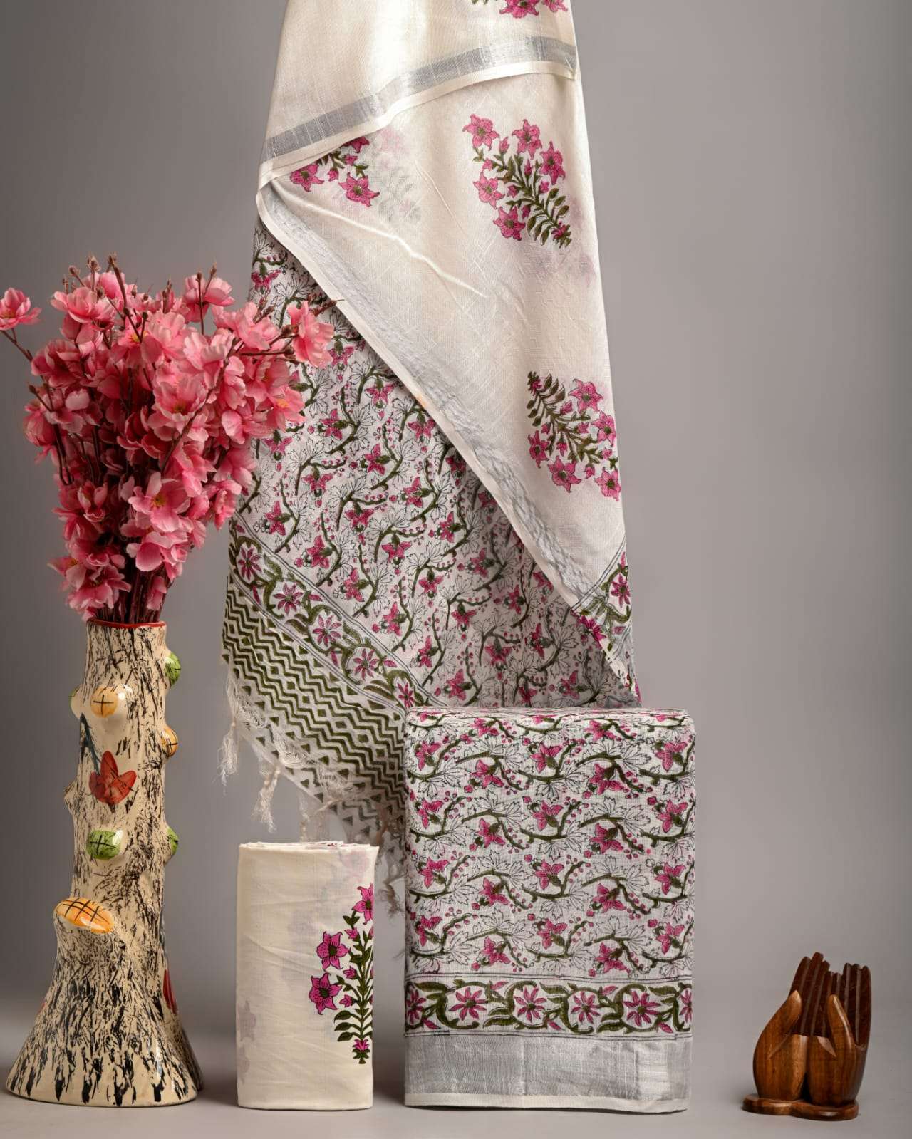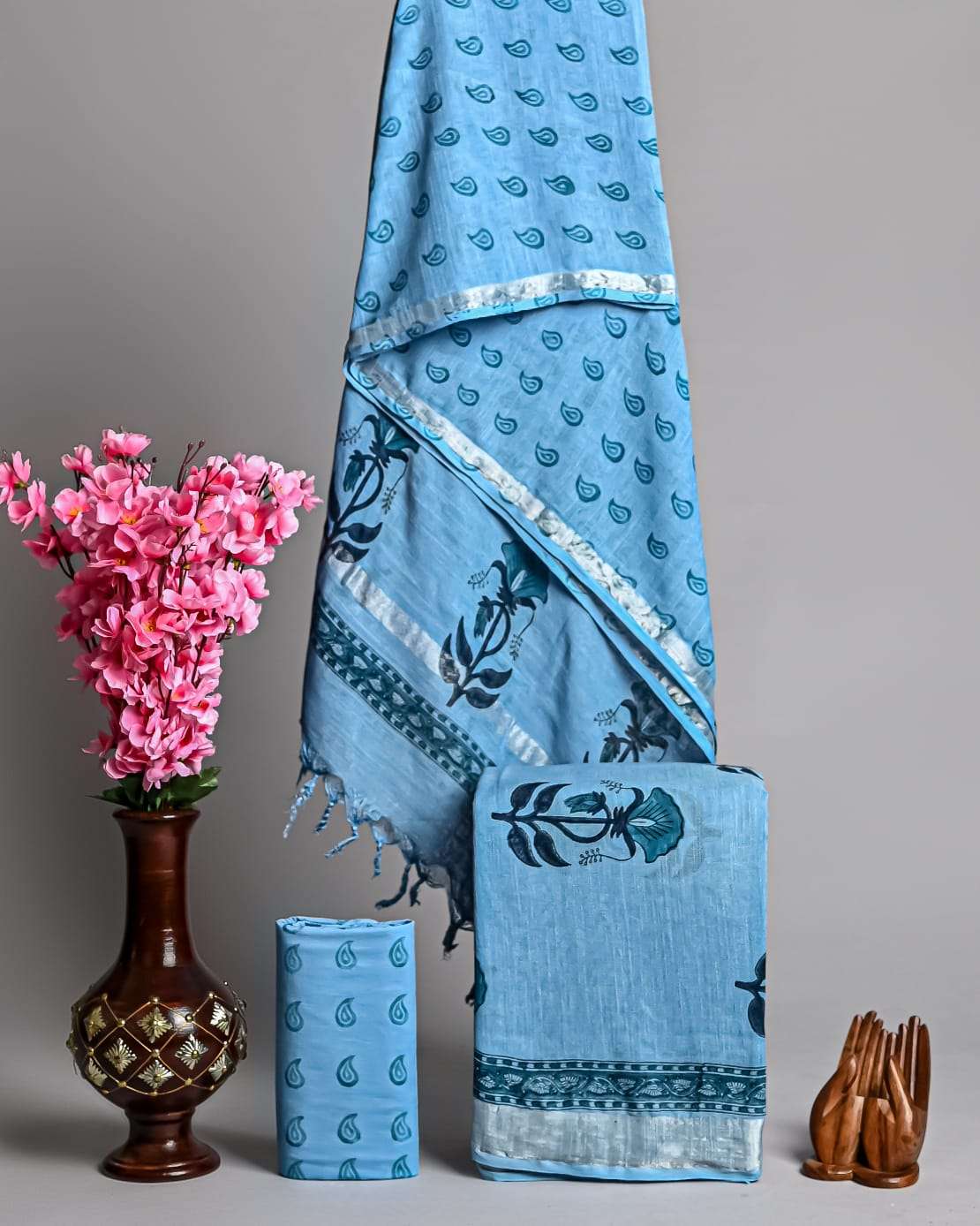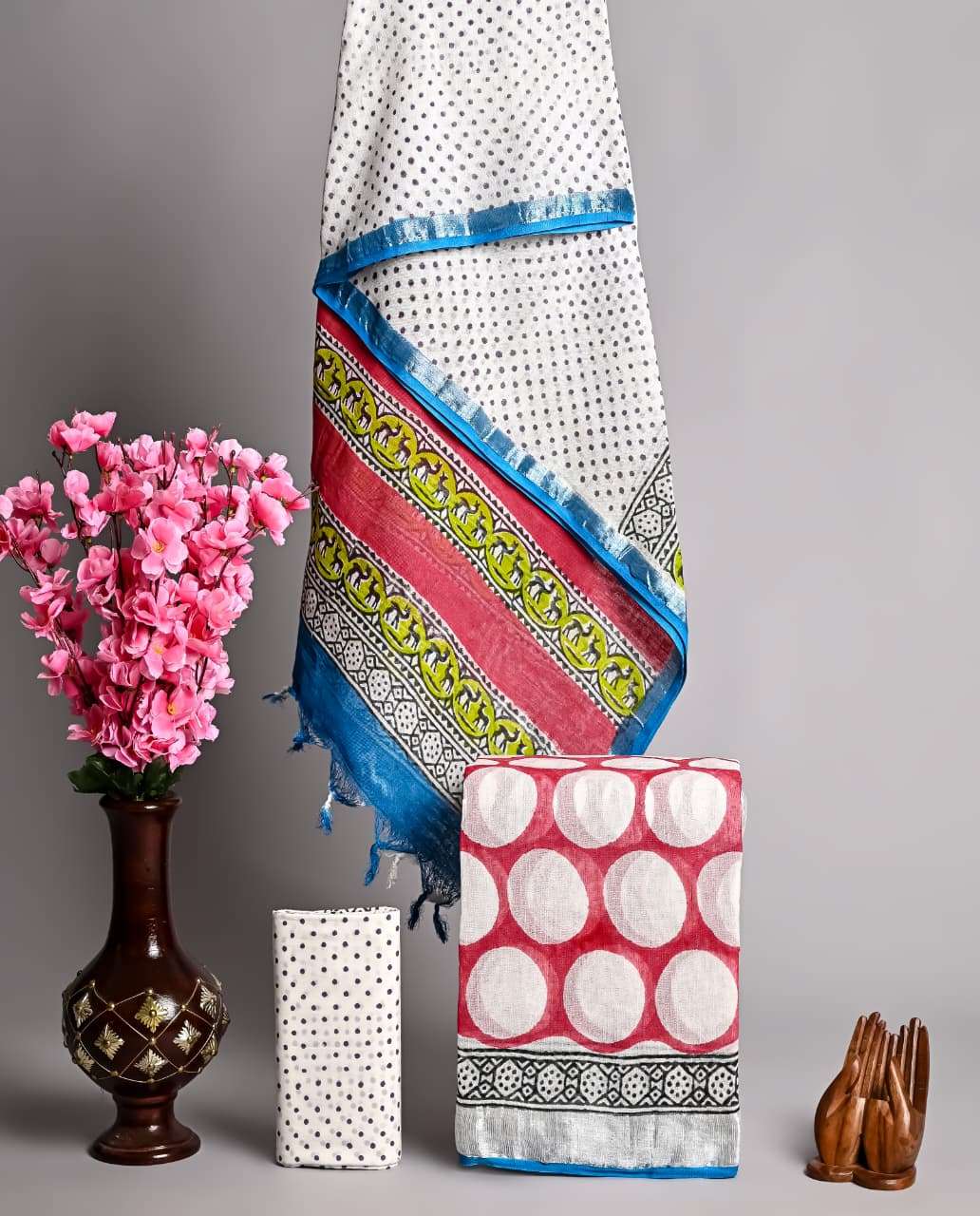 | Work : | zari border,hand block print |