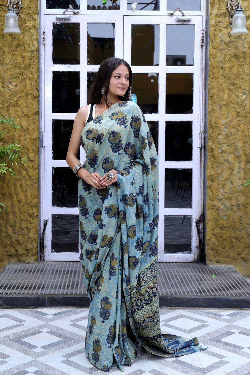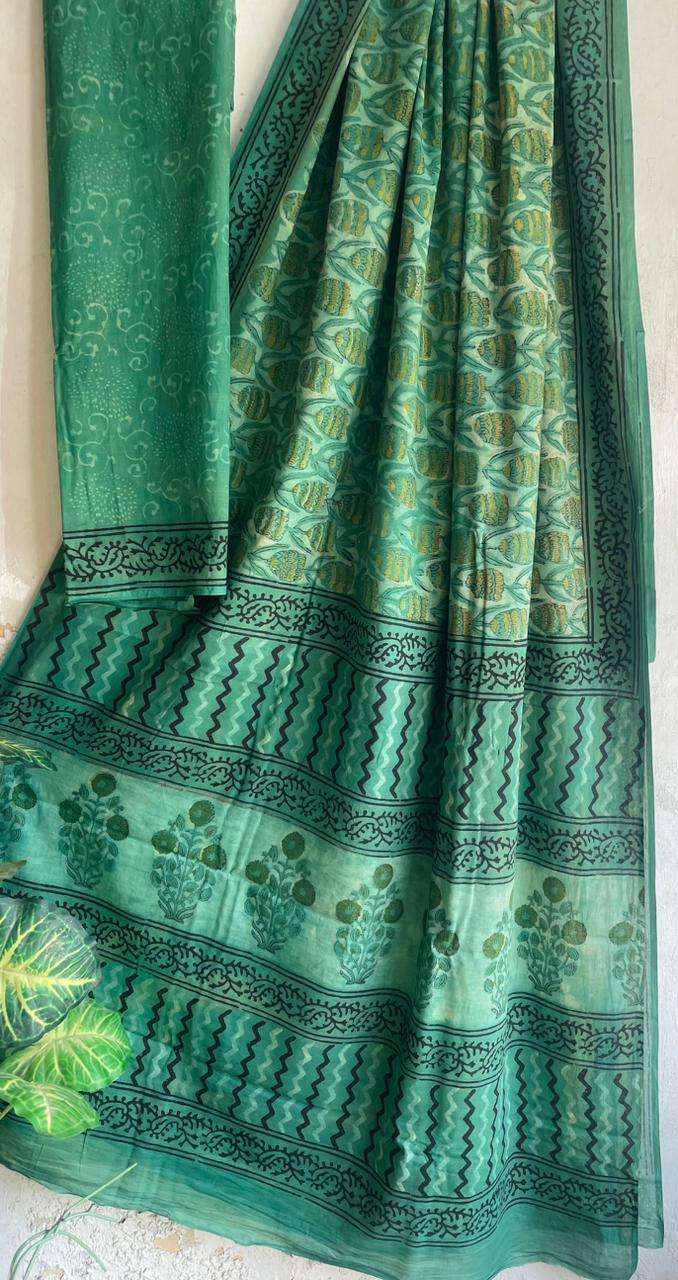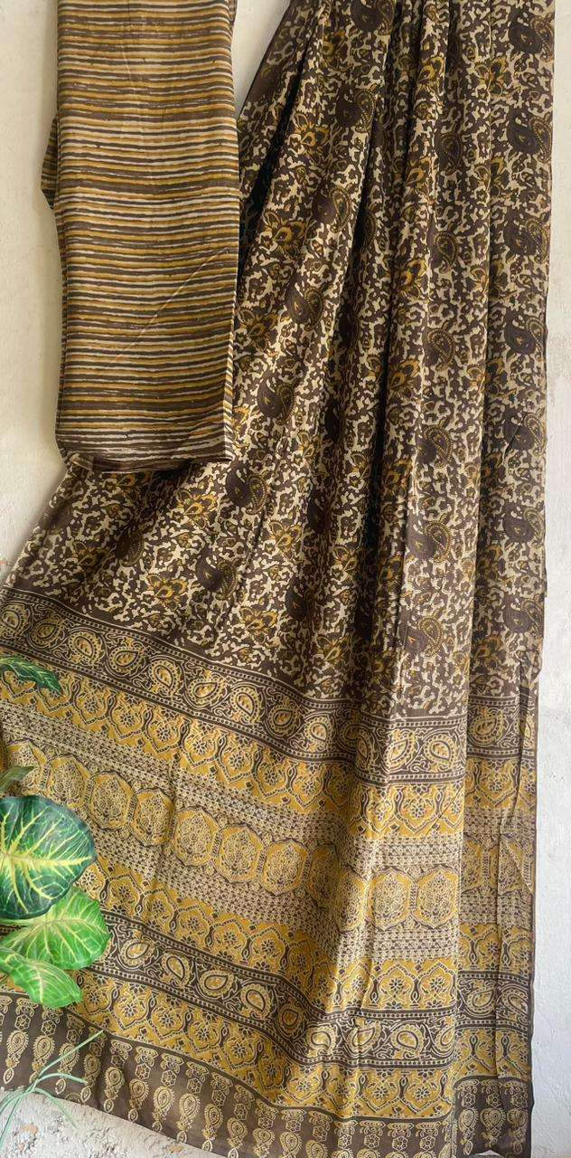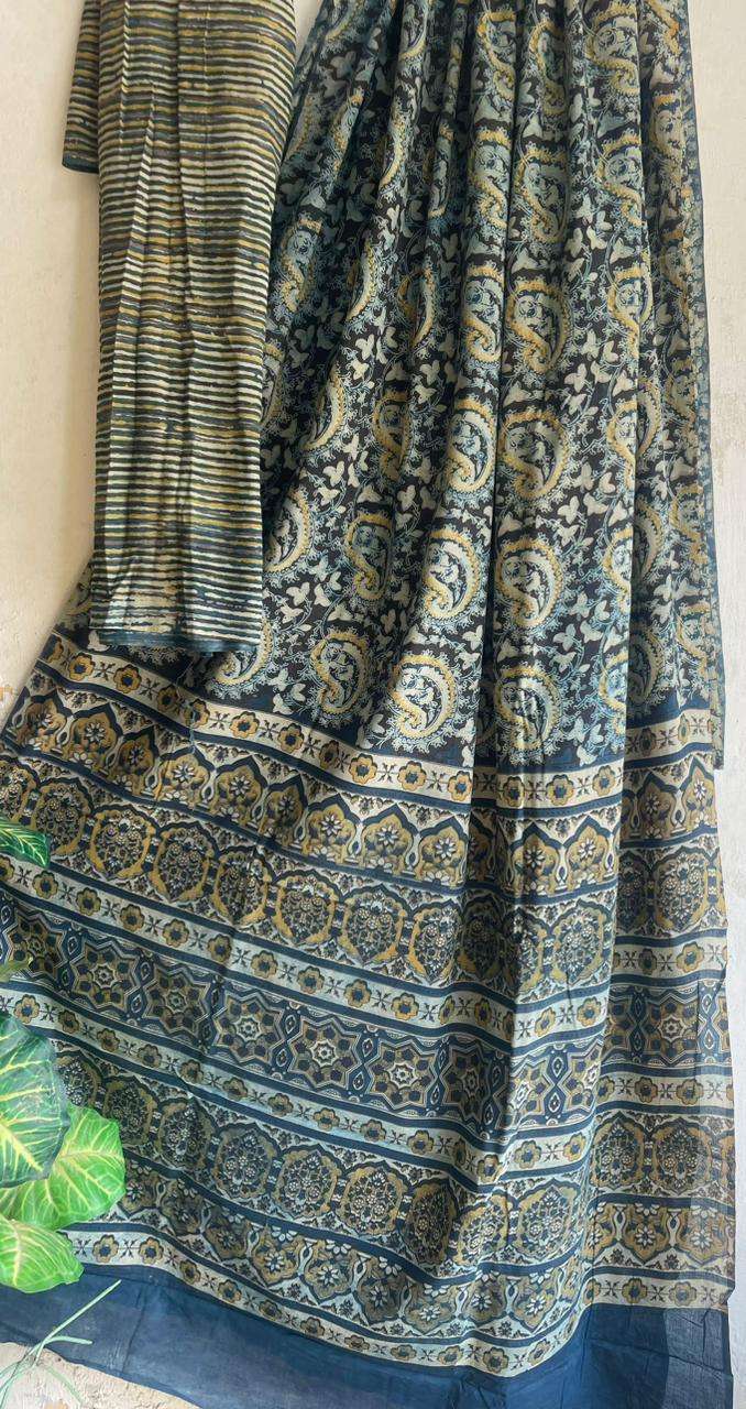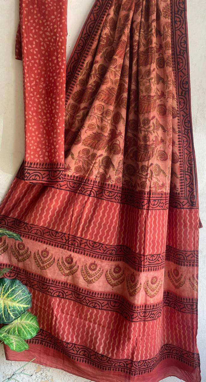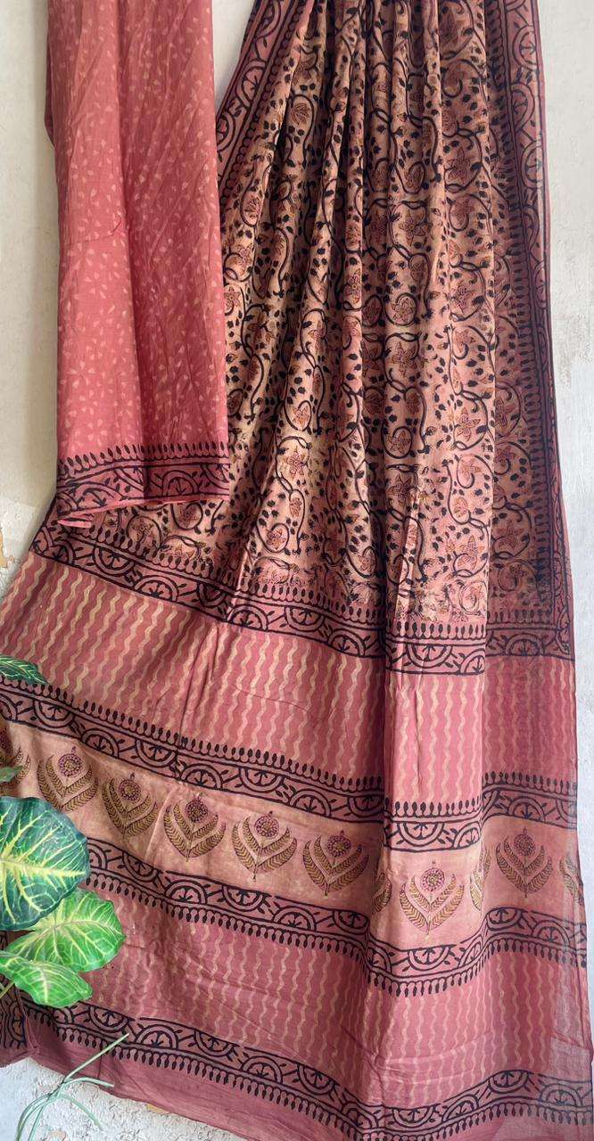 Exclusive hand block printed soft mul cotton sarees with blouse in vanaspati ajrak print