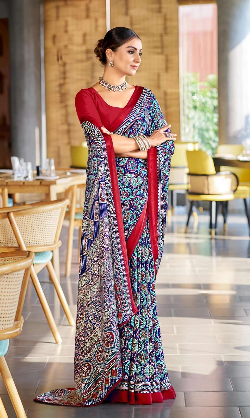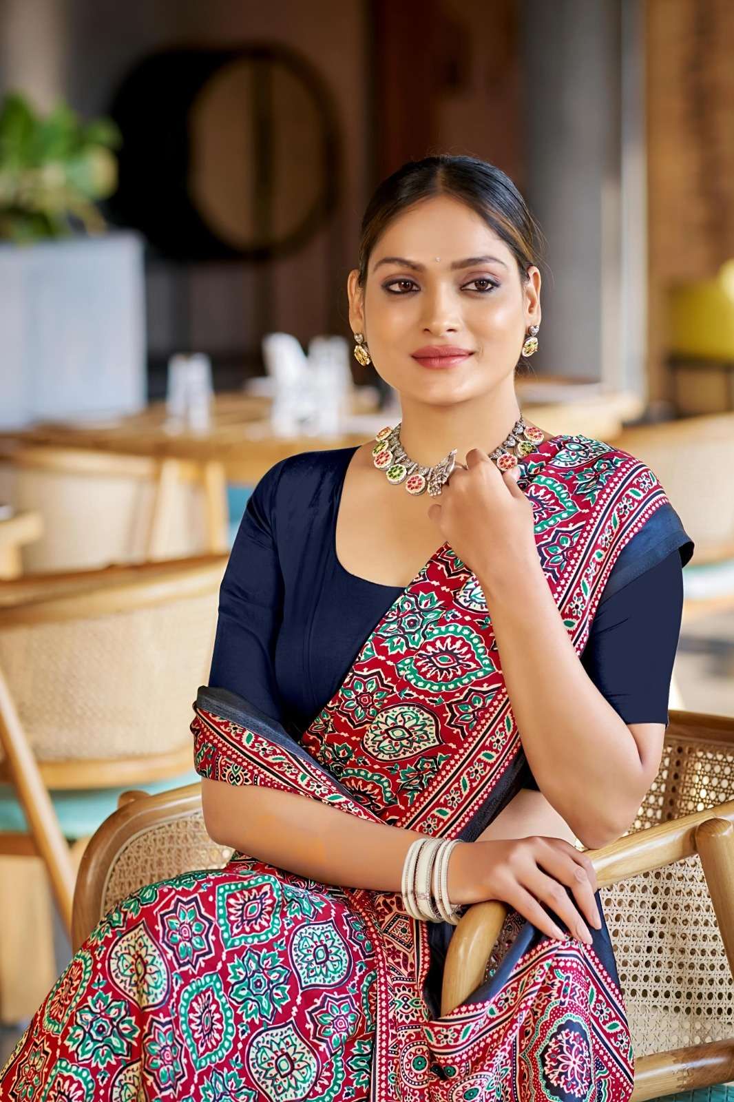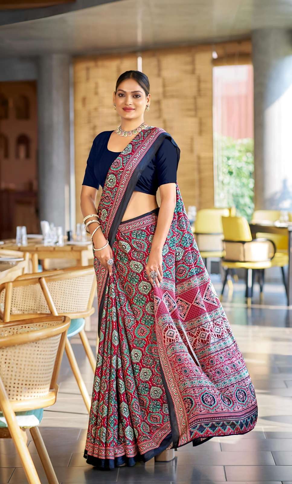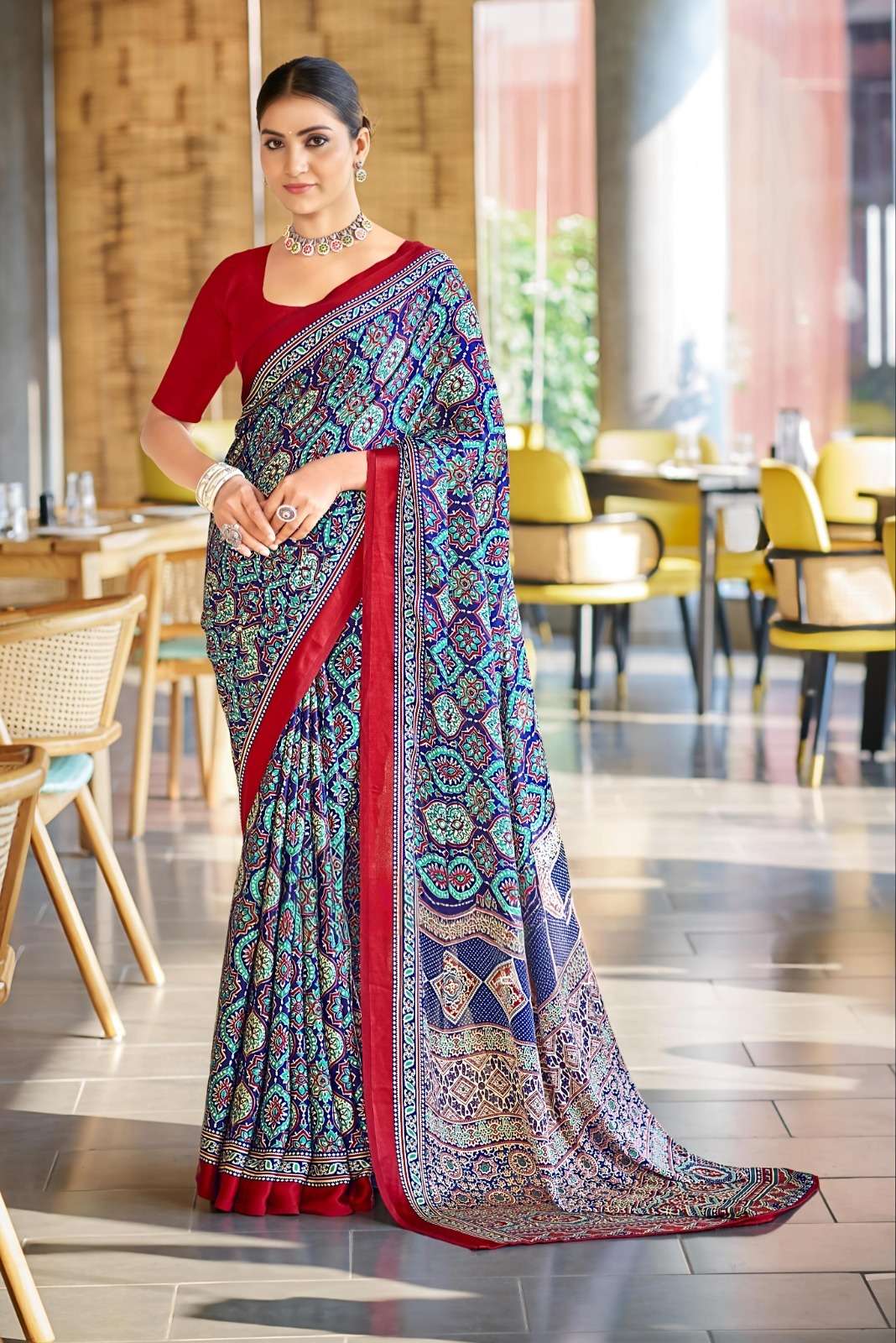 Ajrakh Print Border with Ajrakh Rich Pallu With Contrast Blouse