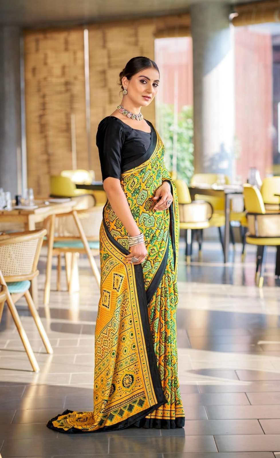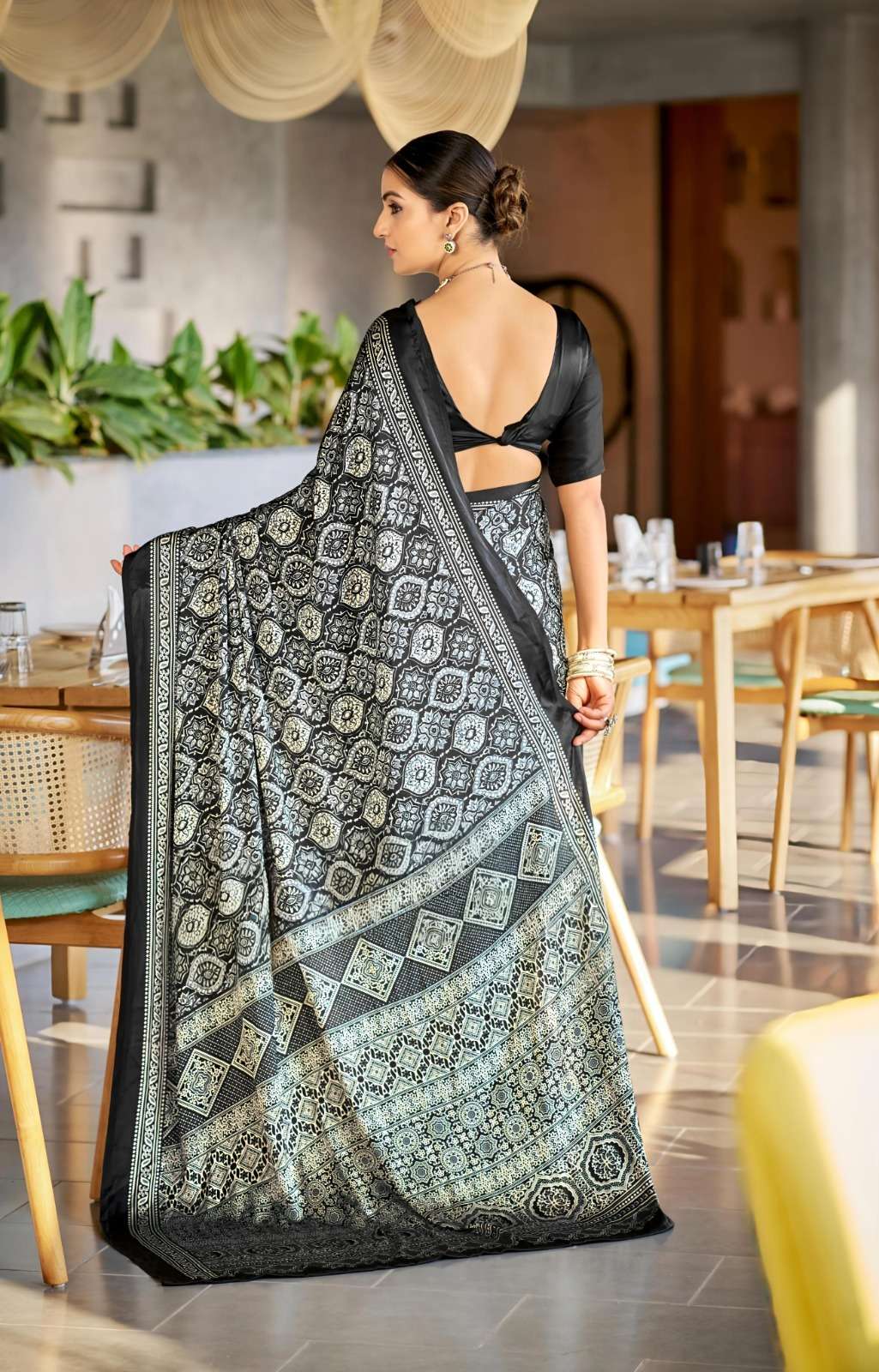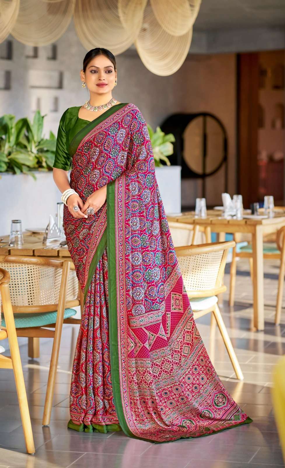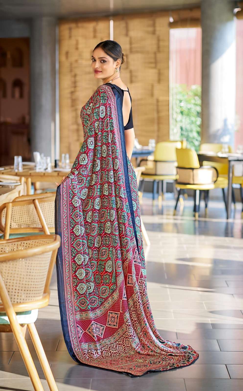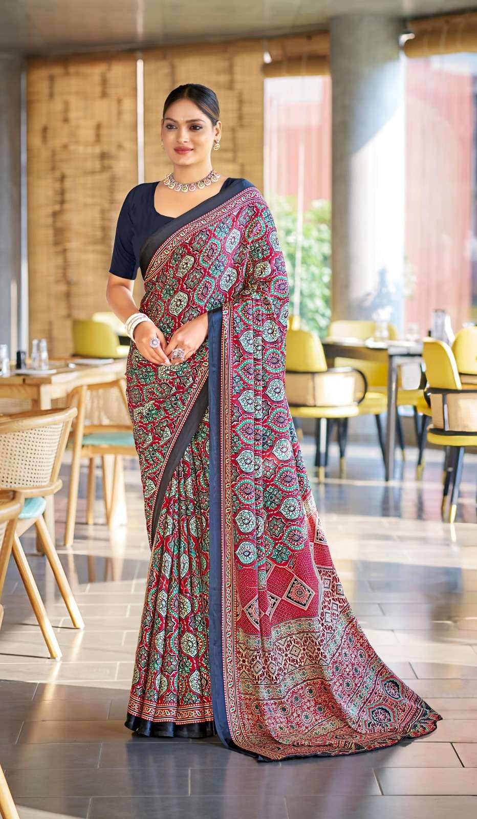 Ajrakh Print Border with Ajrakh Rich Pallu With Contrast Blouse