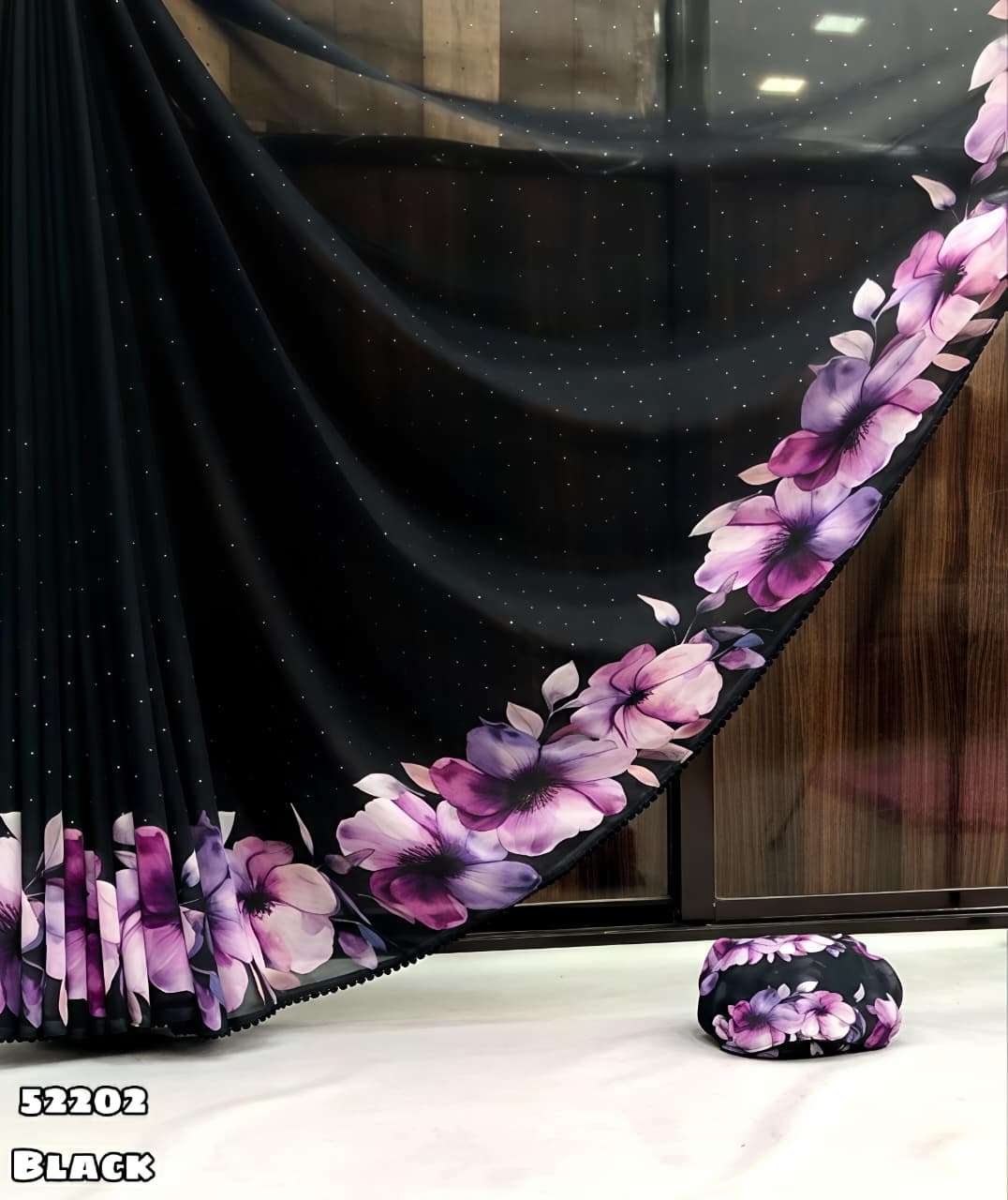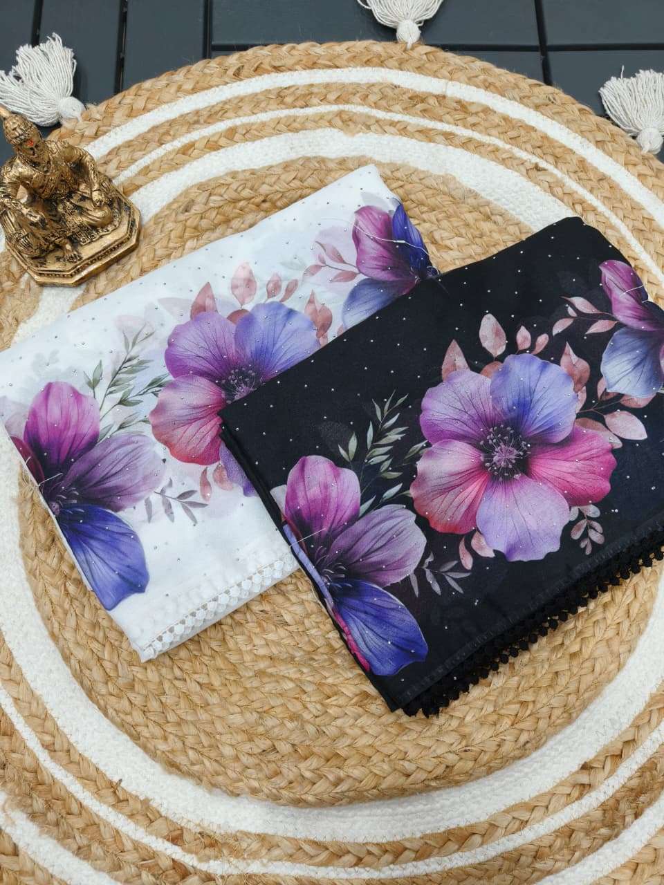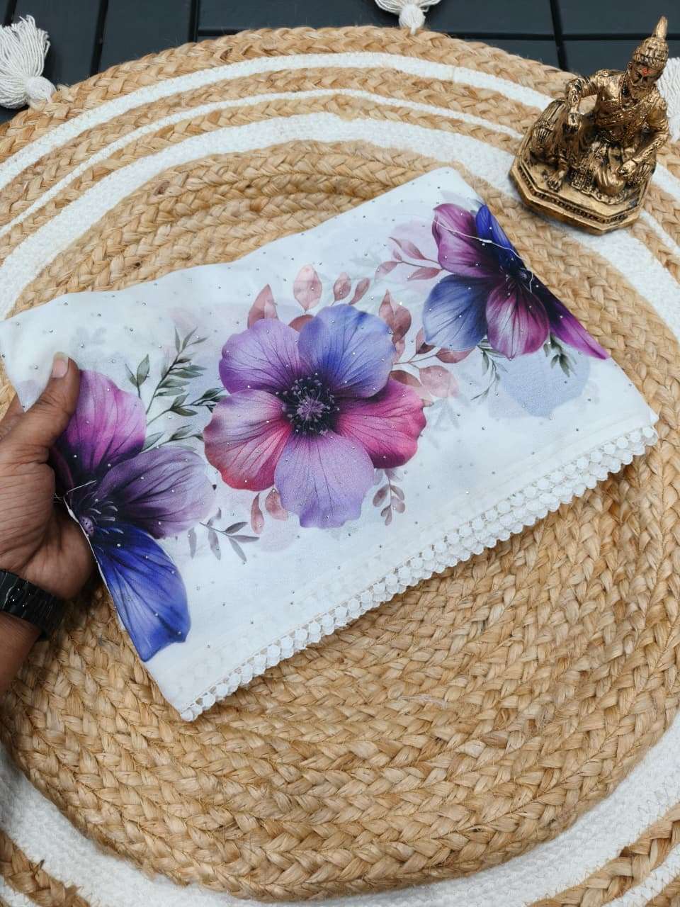 Saree Fabric: Heavy MARSHMALLOW blooming Georgette saree with multi colored digital print swirowski work allover saree with PERFECTLY MATCHED blouse piece