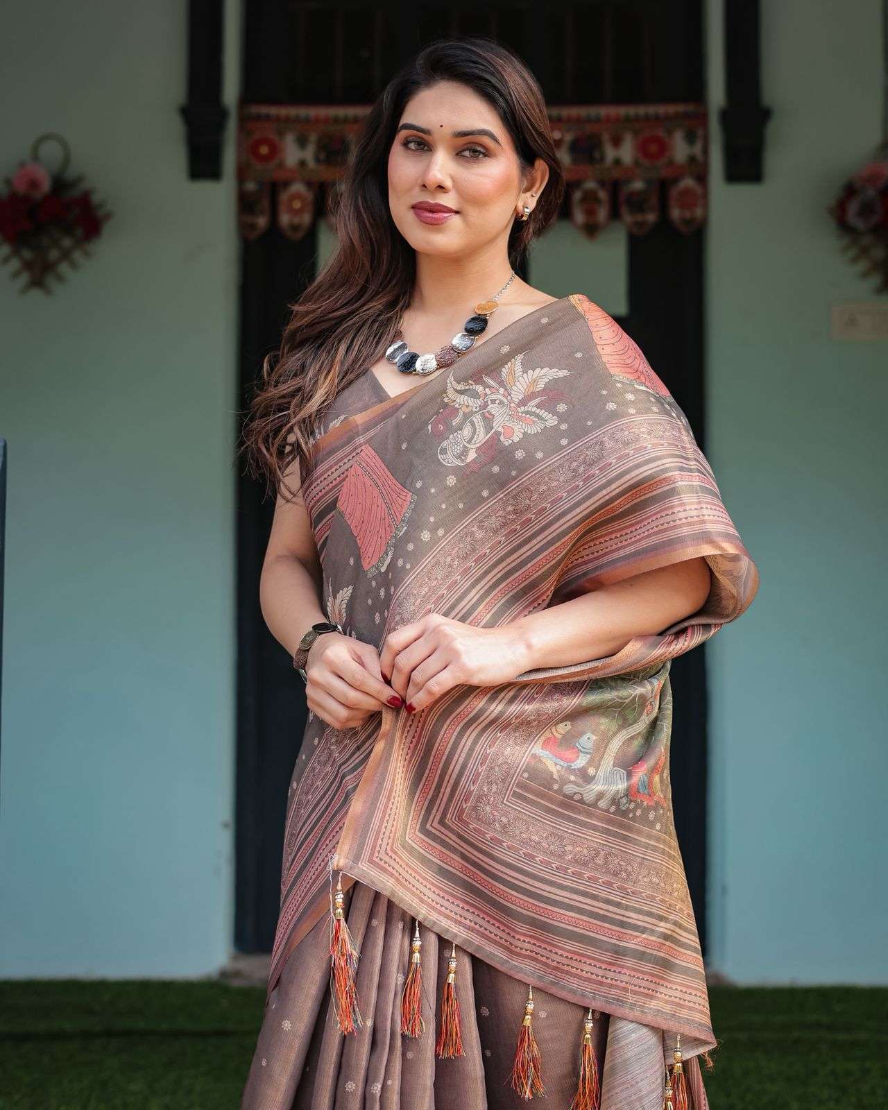 Saree Colour: Elegant Mushroom Brown / Taupe Grey with soft Rust & Beige highlights