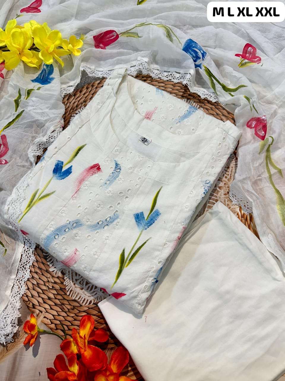 Heavy premium chicken shifli cotton fabric Kurti with hand printed kurti and Pant and mulmul Dupatta -In very fine Quality Cotton