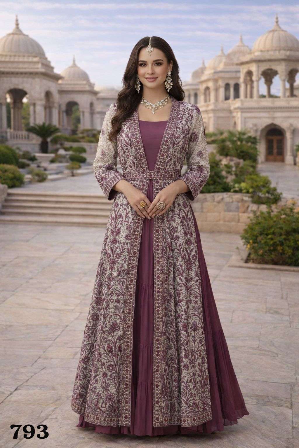 793 FABRIC - PREMIUM REAL CHİNON SILK ( TRENDY WEDDING LOOK FRONT AND BACK HEAVY EMBROIDERED JACKET WITH BELT AND CHINON SILK GOWN )