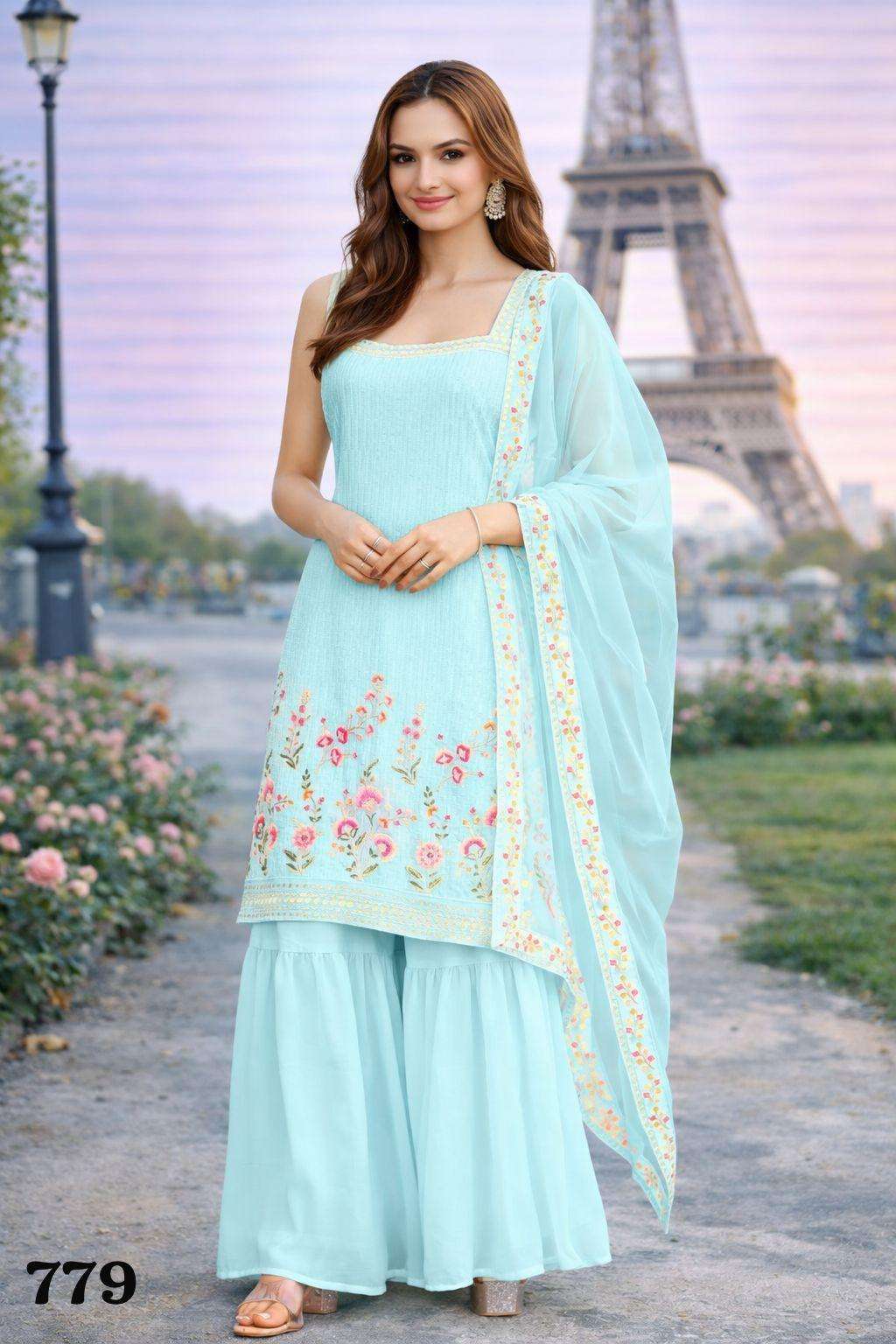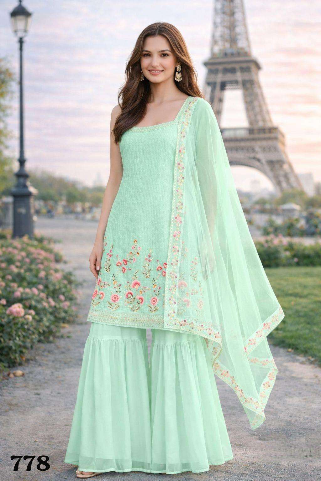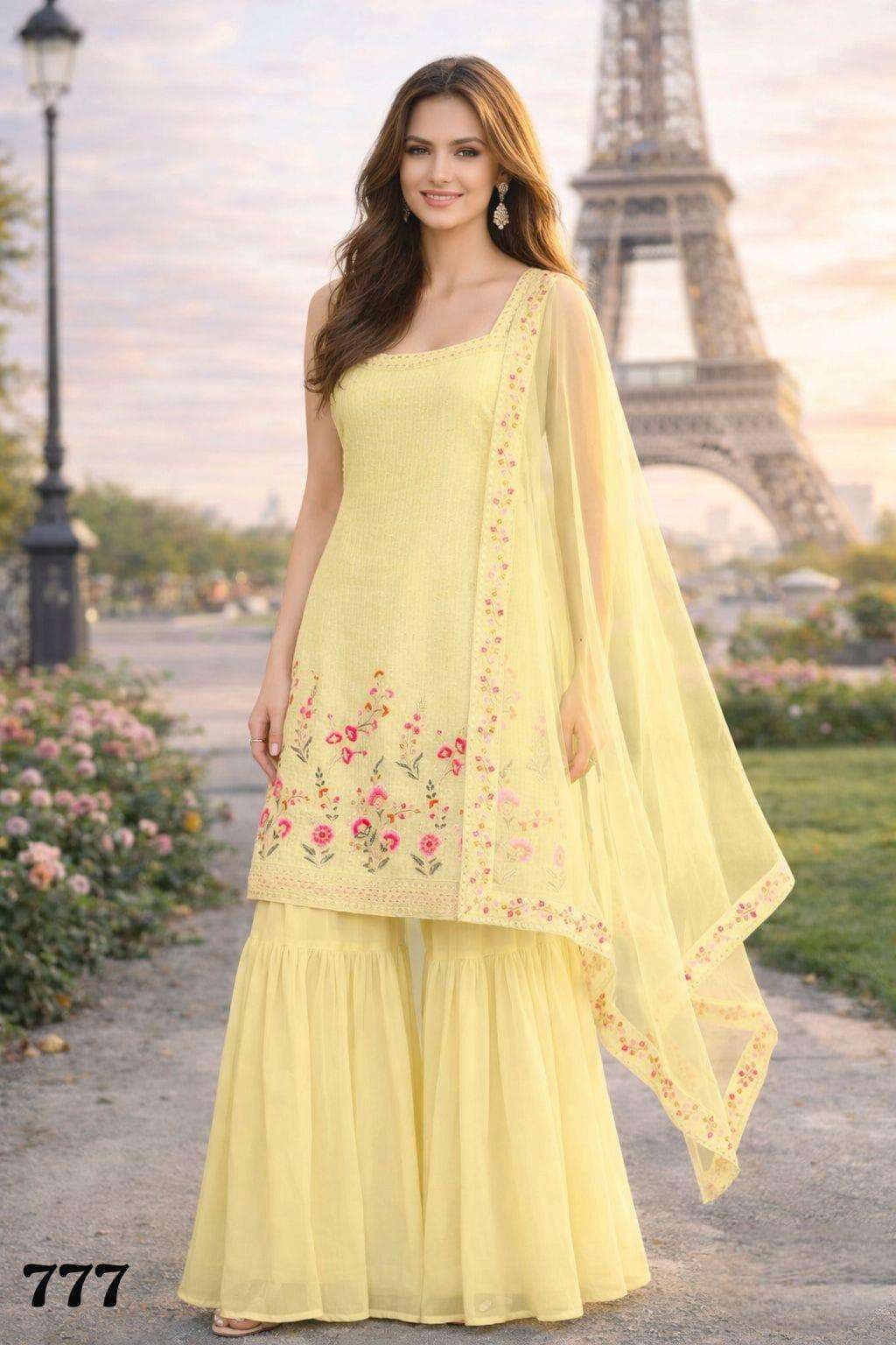 FABRIC - REAL PREMIUM GEORGETTE ( HEAVY EMBROIDERED & SEQUENCE WORK TOP WITH SHARARA PANT AND DUPATTA )